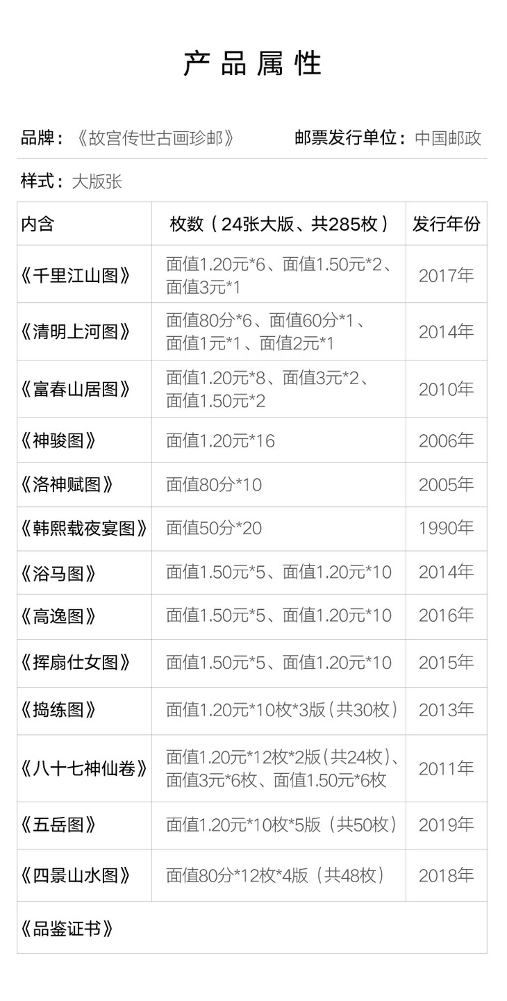 *内含珍邮(24张大版,共285枚):《韩熙载夜宴图》、《清明上河图》、《洛神赋图》、《神骏图》、《富春山居图》、《八十七神仙卷》、《捣练图》、《浴马图》、《挥扇仕女图》、《高逸图》、《千里江山图》、《四景山水图》、《五岳图》