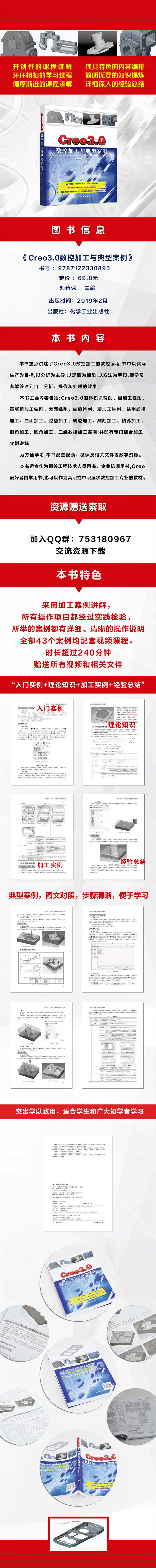 本书采用加工案例讲解,对全部案例均配套视频课程,对于本书使用者,赠送全部视频课程和Creo的原始文件、完成编程的文件,可登录化学工业出版社教学资源网www.cipedu.com.cn免费下载,或到QQ群753180967交流索取。