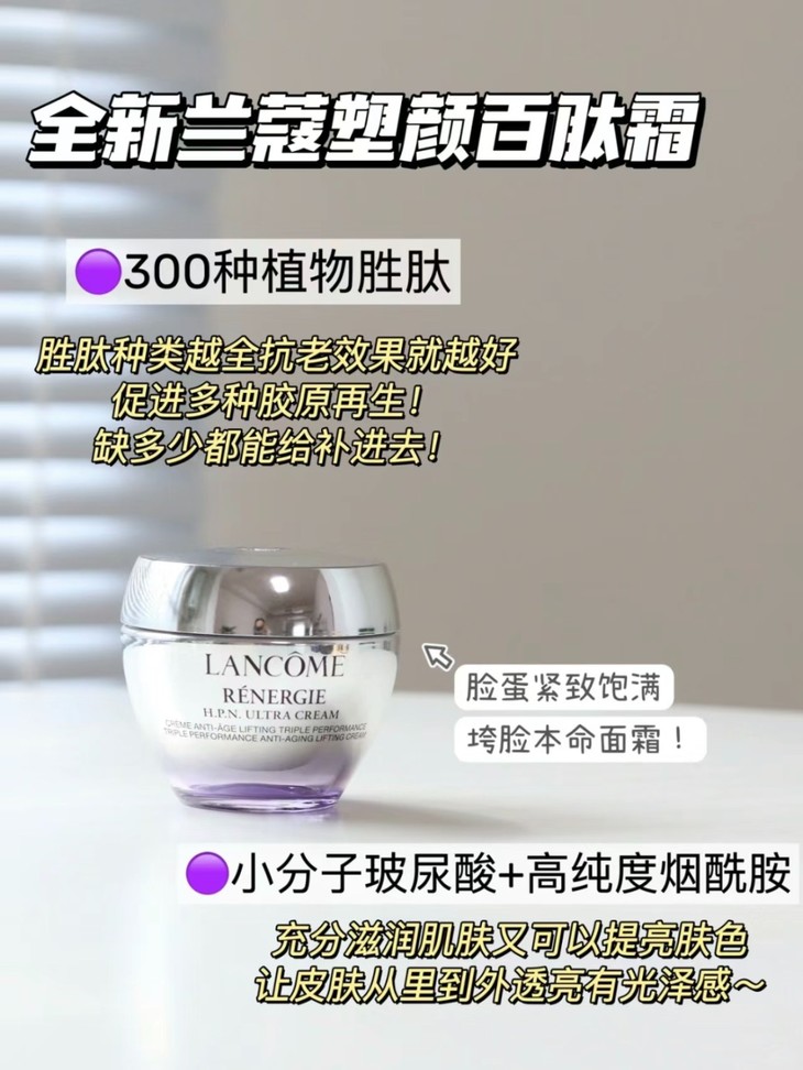 👑兰蔻雪花霜 50ml(百肽霜HPN) 👍主打紧致抗老!进阶加法抗老! ✅百肽霜三大成分【300种植物胜肽+透明质酸+烟酰胺】 💦软糯奶霜质地,不会有厚重感,滋润好吸收 💎一瓶get紧致弹润肌!【有效】:促生胶原,淡化顽固✔️ 💫轮廓提升,兜住双下巴✔️,焕亮透光,提亮暗沉肌✔️
