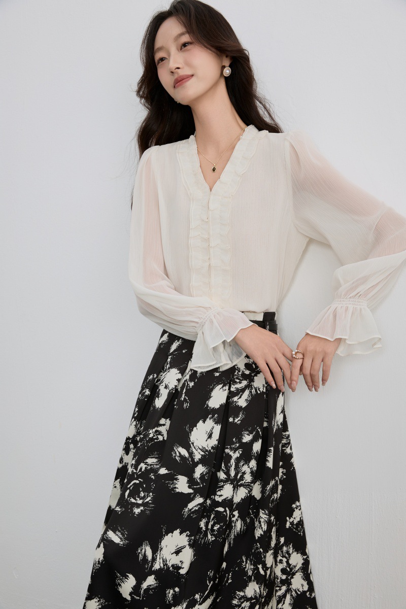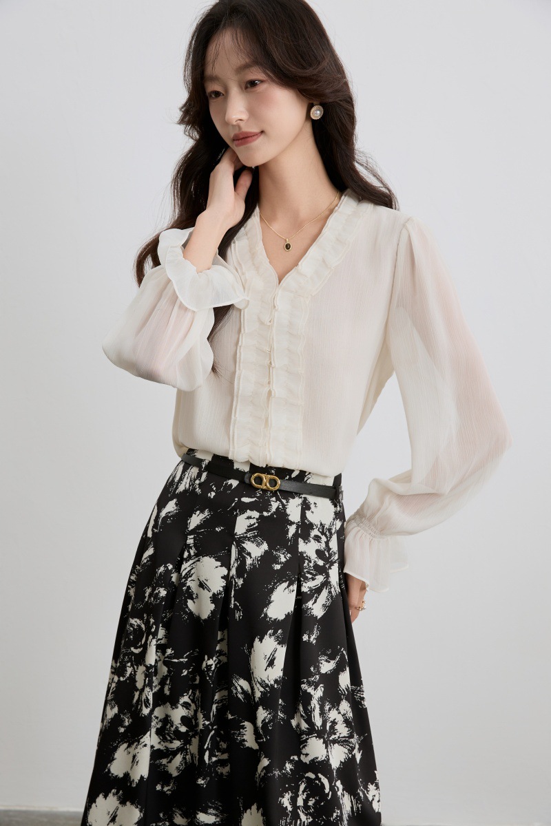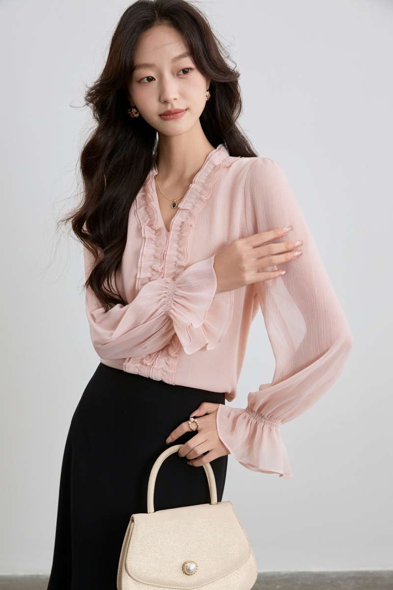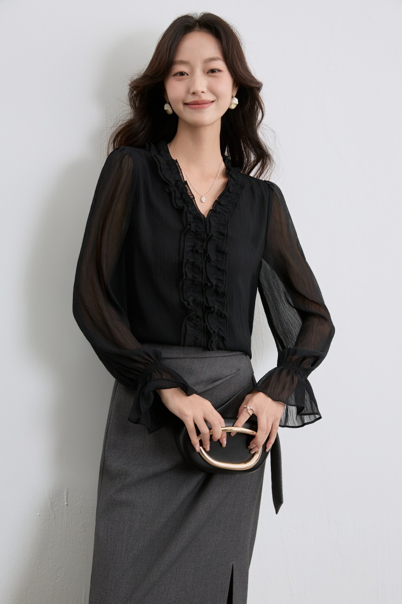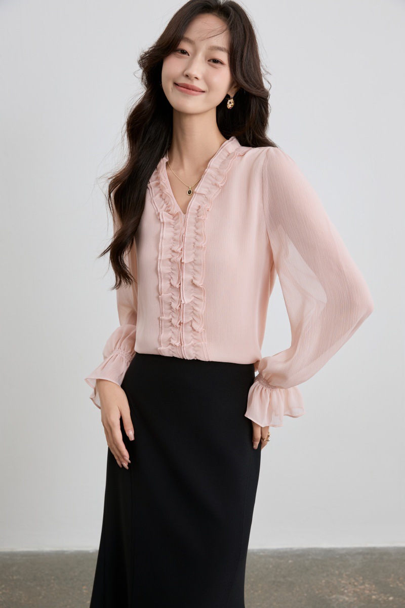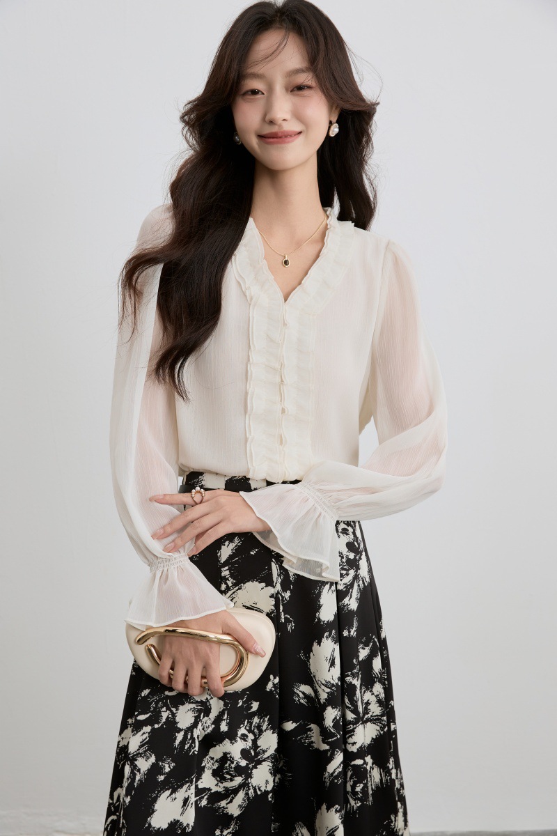 「自」全新升级【铂金会员165/天猫219/差价54】(70416)洛诗琳法式V领显瘦衬衫2025秋季新款花边拼接雪纺上衣女
