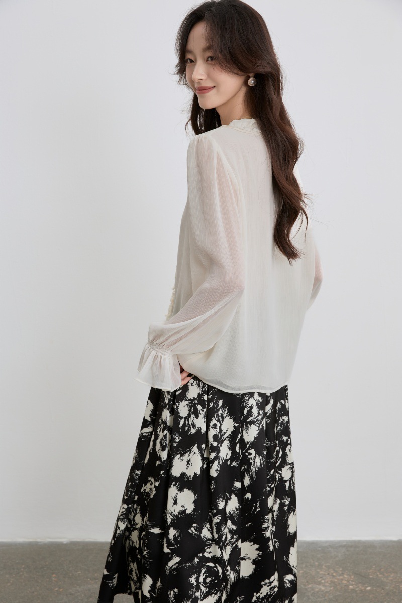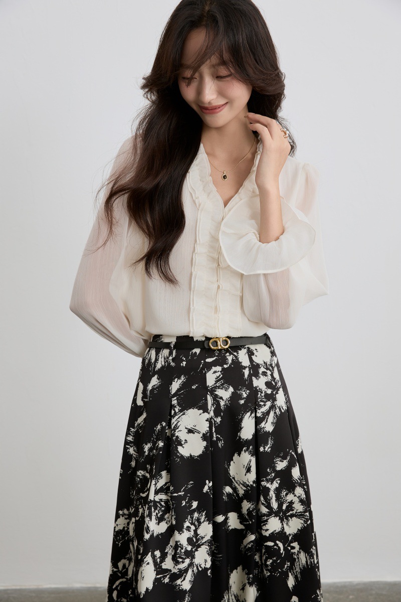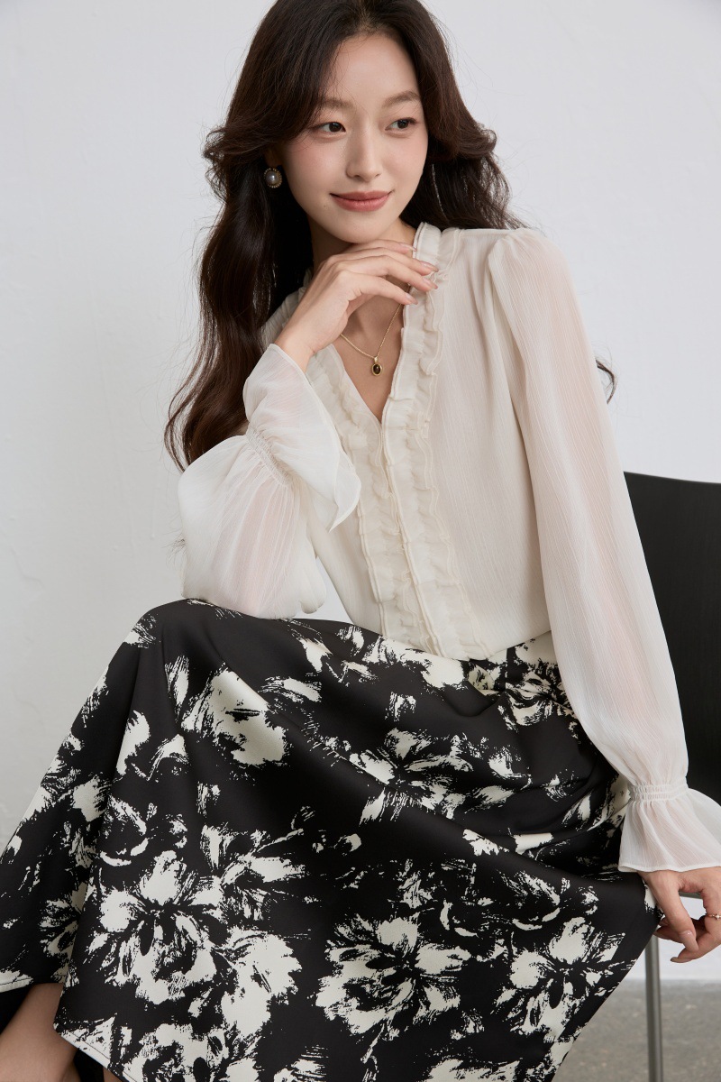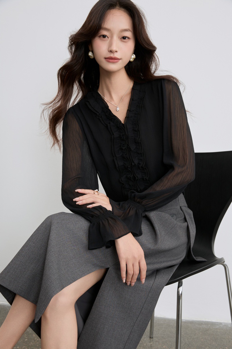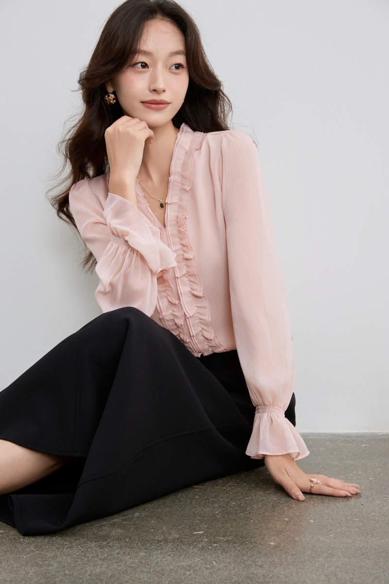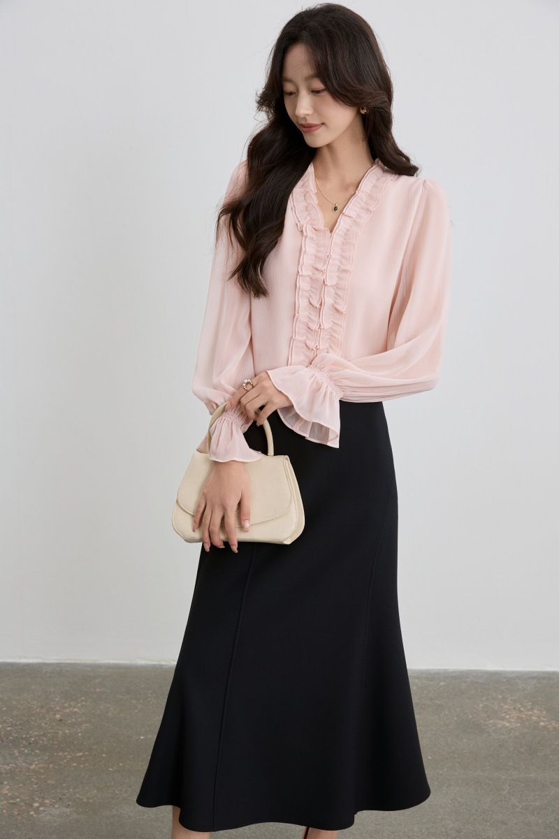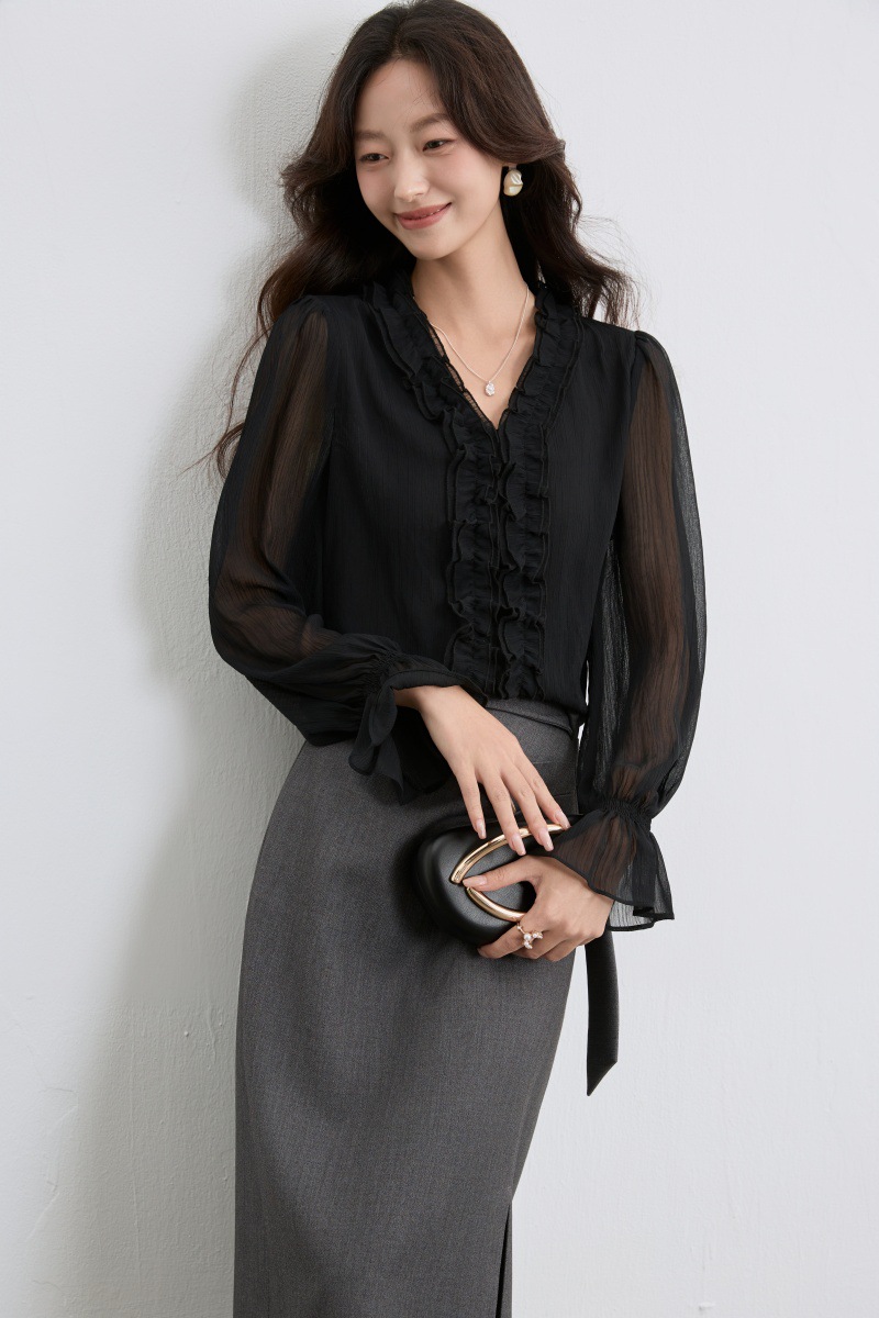 「自」全新升级【铂金会员165/天猫219/差价54】(70416)洛诗琳法式V领显瘦衬衫2025秋季新款花边拼接雪纺上衣女