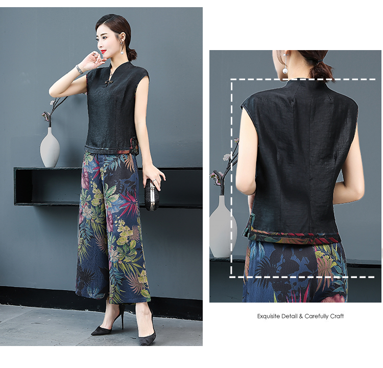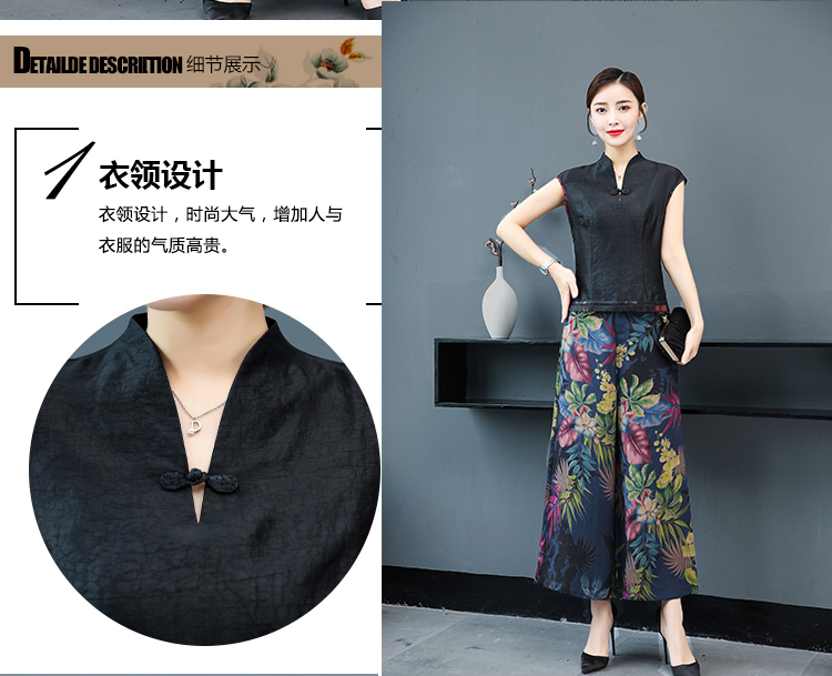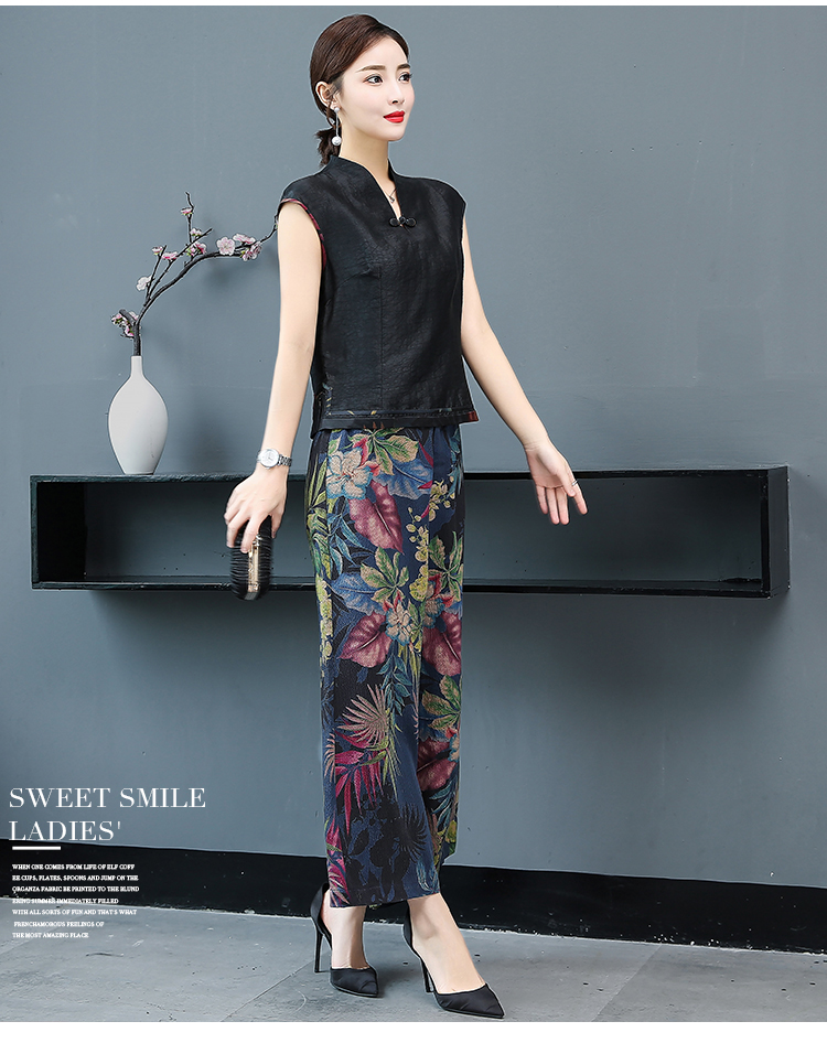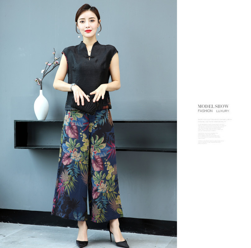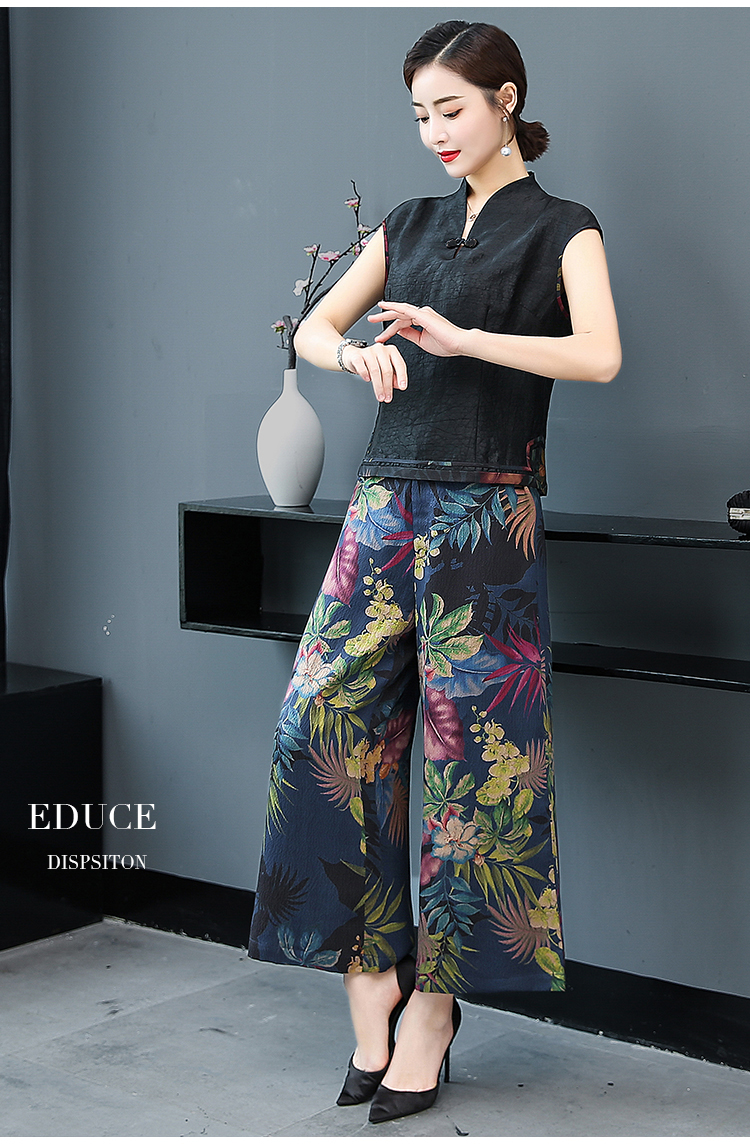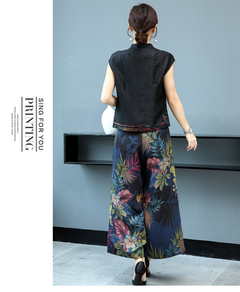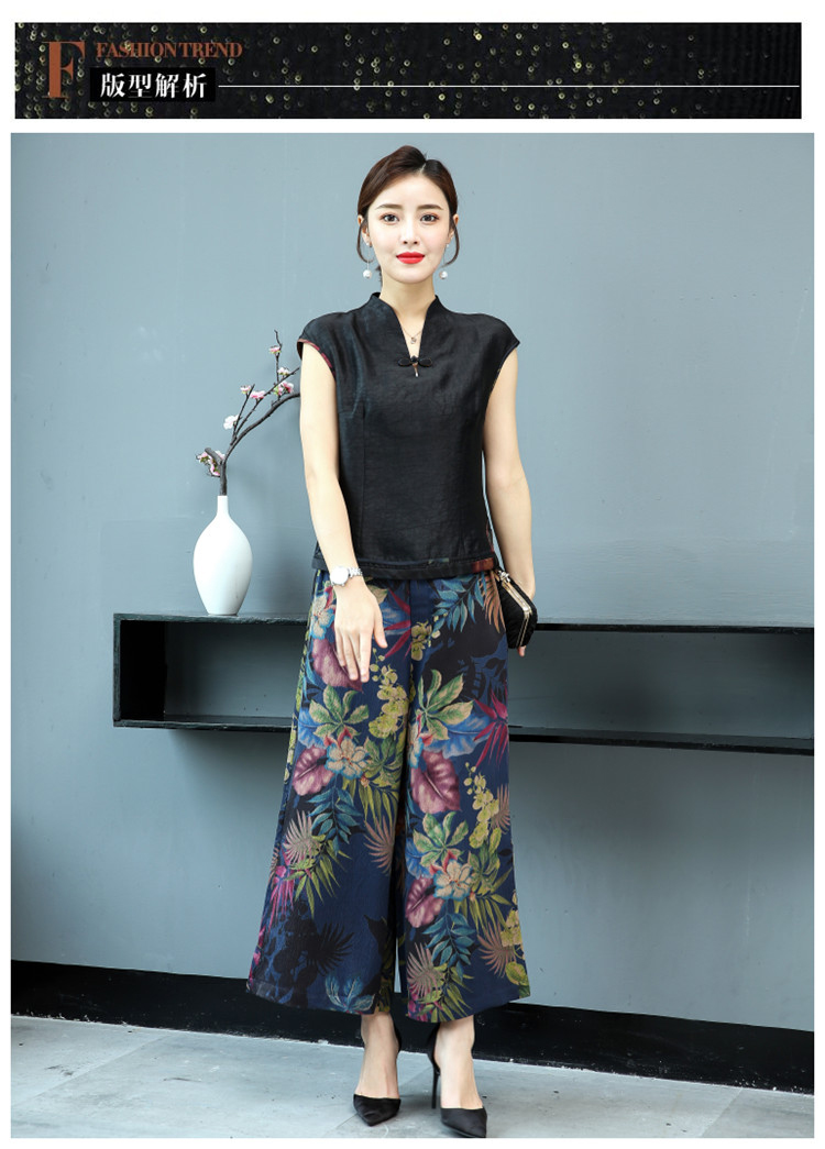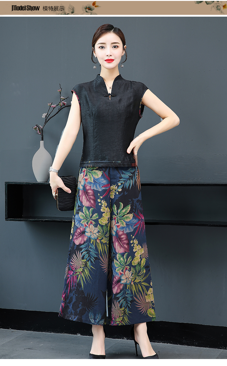 WZNH-YIZX7272纯色无袖上衣新款碎花阔脚裤两件套装