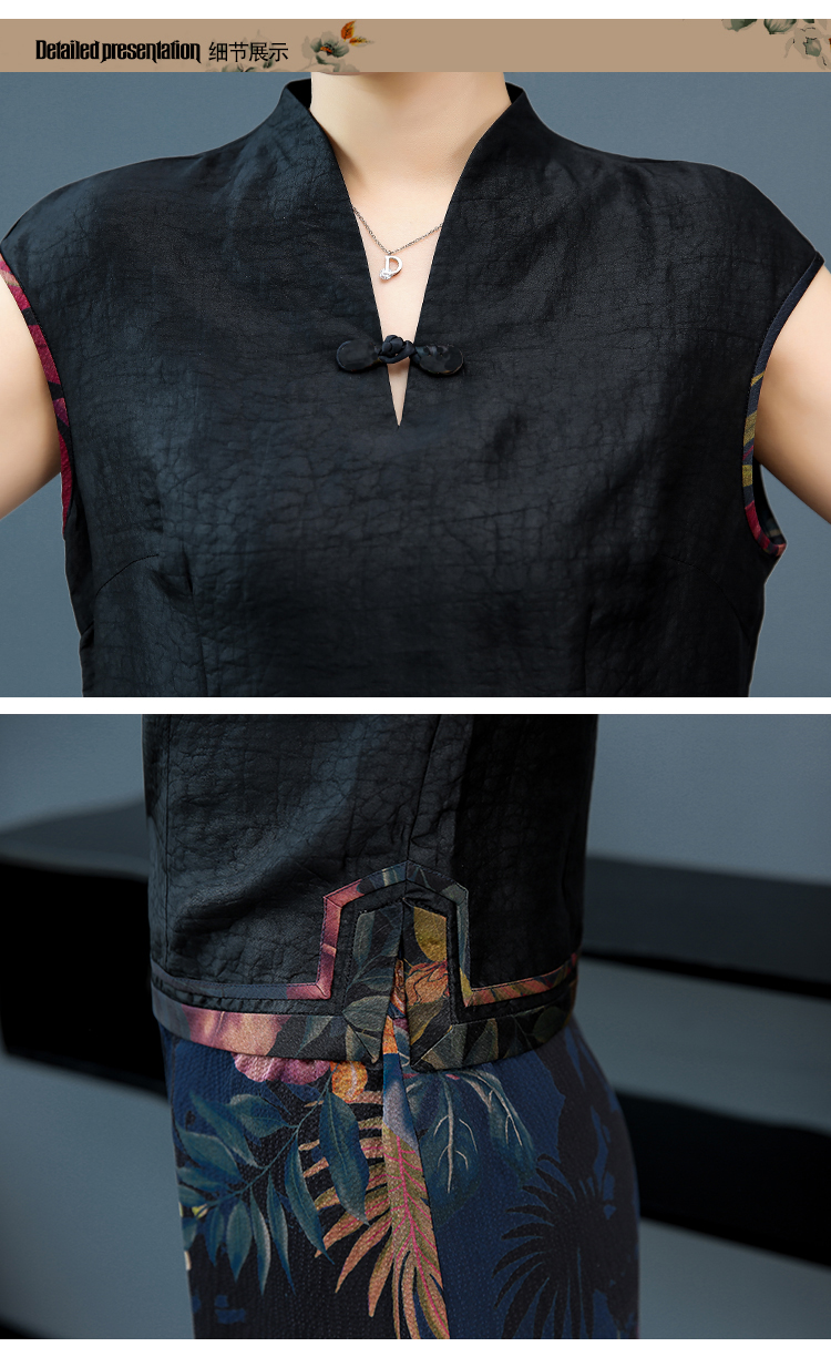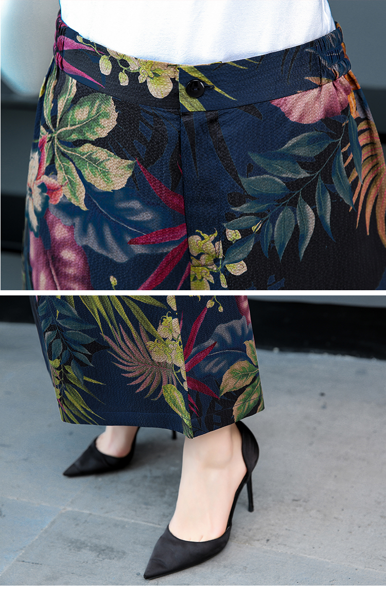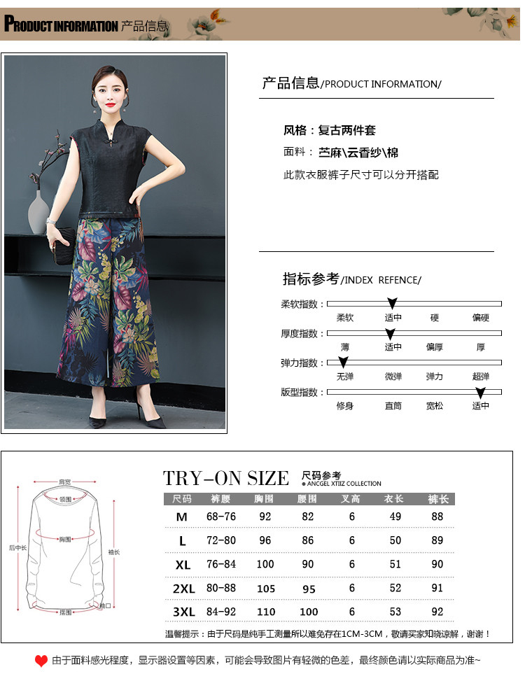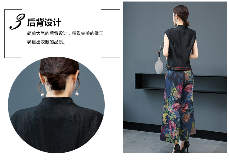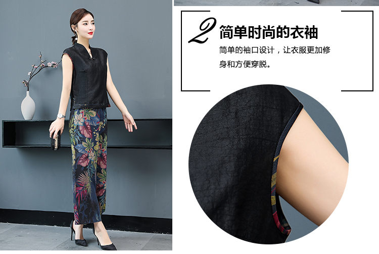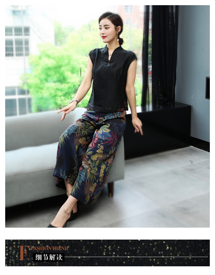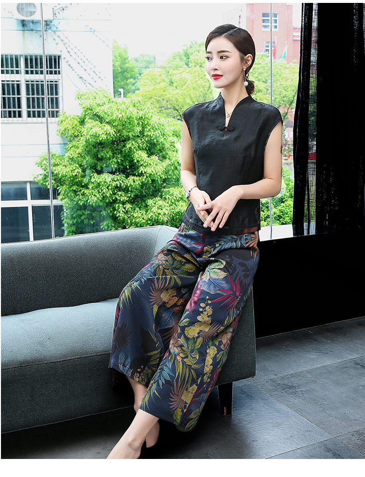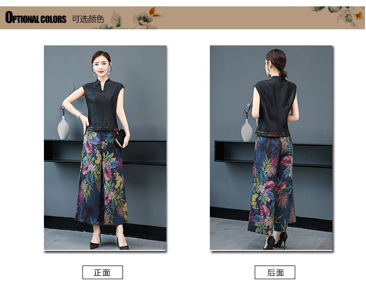 WZNH-YIZX7272纯色无袖上衣新款碎花阔脚裤两件套装