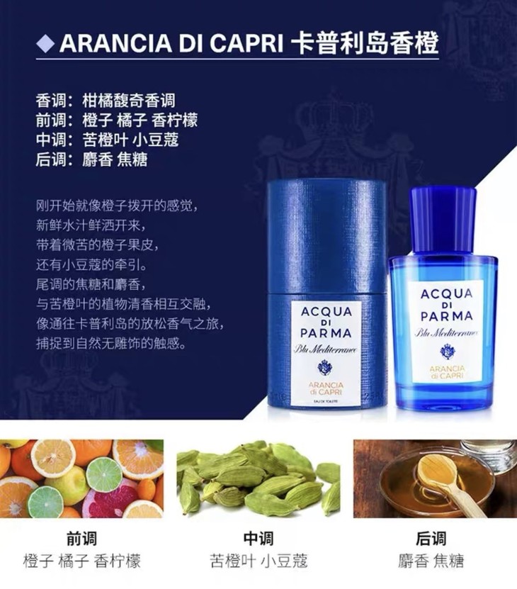 ACQUA帕尔玛之水系列#卡普里岛橙淡香水75ml(EDT)👍相当棒的一款柑橘调香水🍊,高度还原了一颗新鲜多汁的大橙子,在你眼前被拨开时的味道💦。橙子的酸爽饱满而多元。味道以柑橘的酸为主,酸味的间隙中会透出淡淡的诱人甜味🙃,若隐若现地,敲到好处。让人联想到慵懒惬意的夏日午后🏝,坐在铺着印花桌布的露天餐桌,享受着地中海的阳光和丰沛果香☀,令人安心舒坦。非常适合夏天,强烈推荐哦!