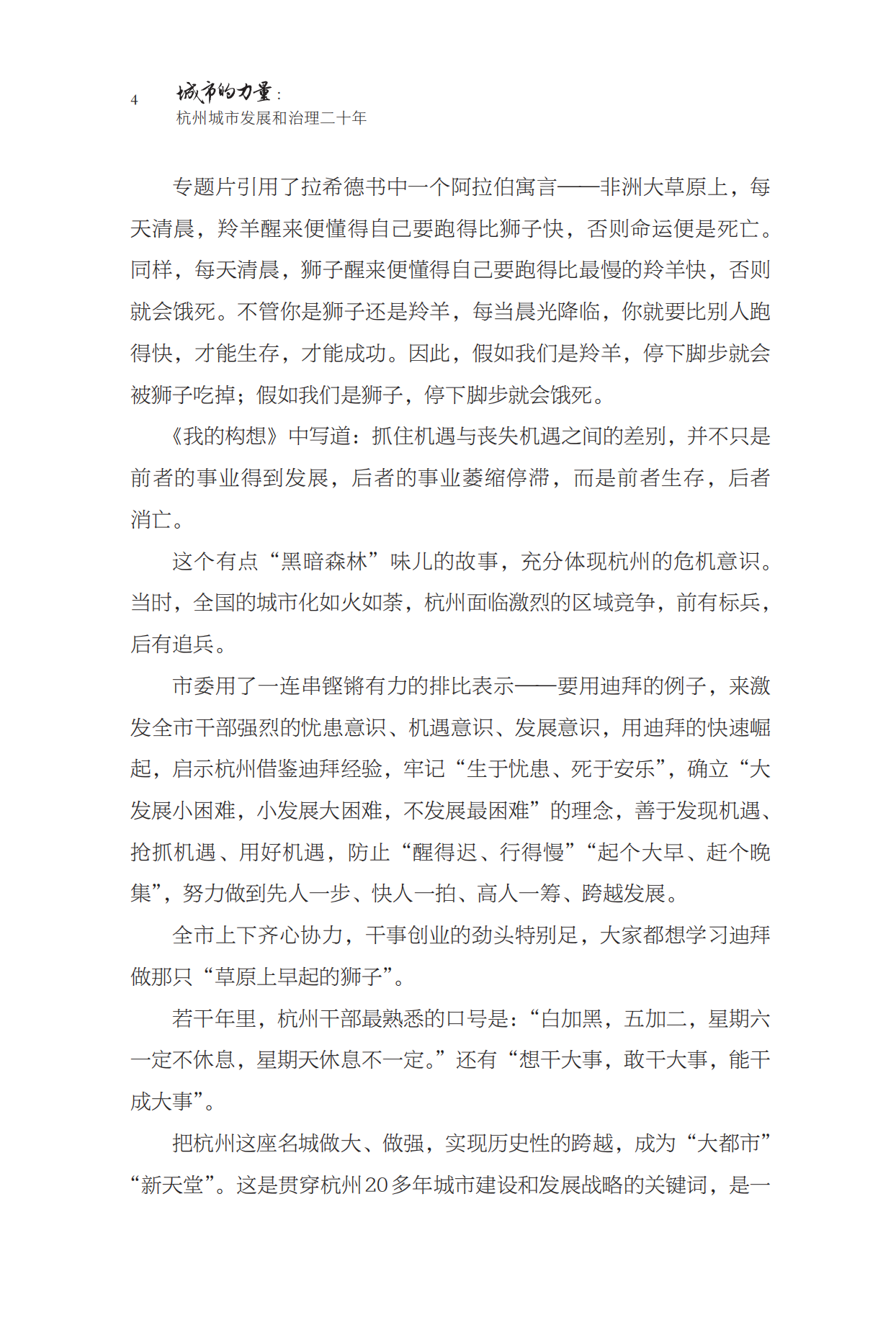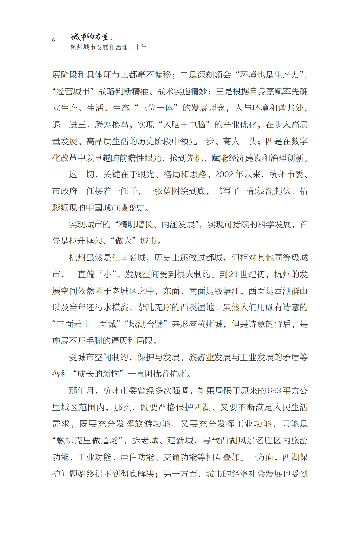 本书讲述了二十年来杭州在“八八战略”指引下,统筹生产、生活、生态三大空间布局,打造中国式现代化城市范例的持续探索创新,记录了杭州城市发展和治理在不同阶段的战略决策和生动实践,展现了以杭州为代表的中国城市化、乡村振兴和共同富裕事业的历史进程,体现了杭州建设“独特韵味、别样精彩”世界名城的不懈努力。