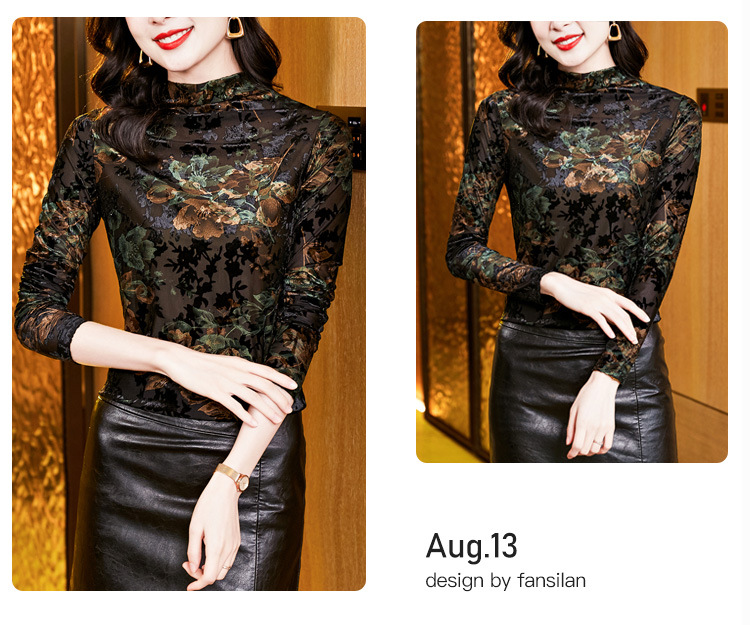 时尚洋气,长袖高领网纱t恤女烫金定位花打底衫上衣KQL-A55F0902