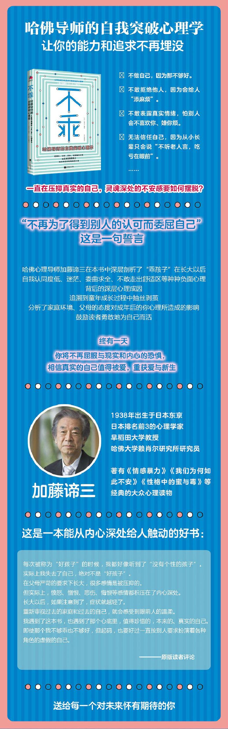 哈佛心理导师加藤谛三在本书中深层剖析了“乖孩子”在长大以后自我认同度低、迷茫、委曲求全、不敢走出舒适区等种种负面心理背后的深层心理成因,追溯到童年成长过程中抽丝剥茧,分析了家庭环境、父母的态度对成年后的你心理所造成的影响,提出了找回自信、实现自我价值的处世智慧,鼓励读者摆脱父母和他人的期待,接受不**却真实的自己,喜欢上自己,勇敢追求自己所向往的生活。