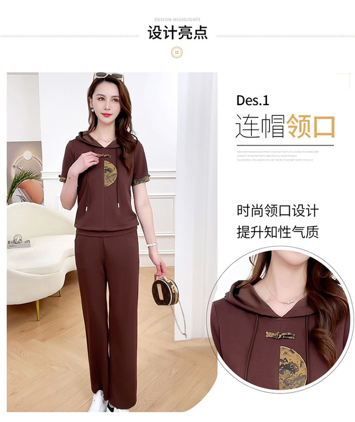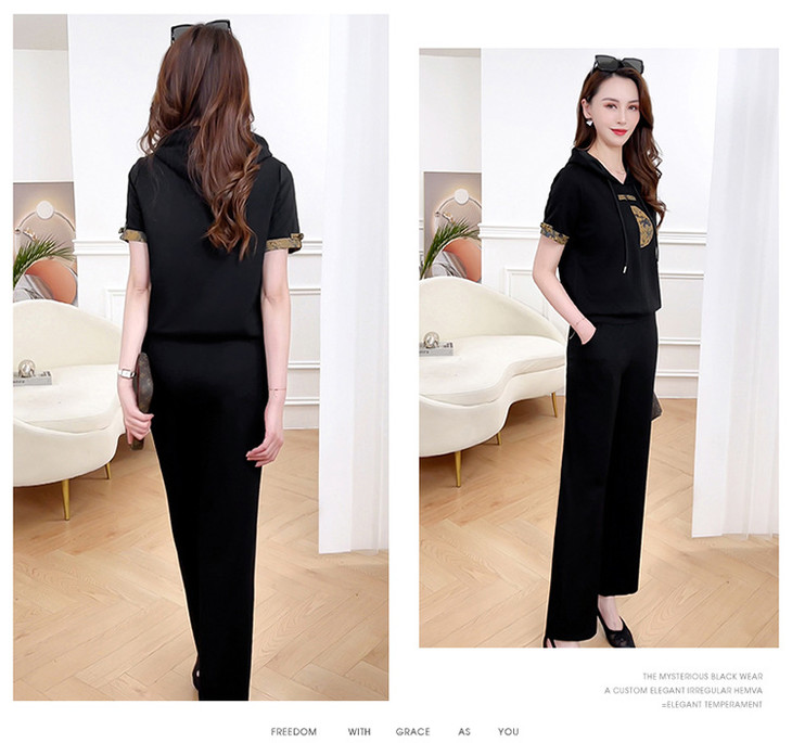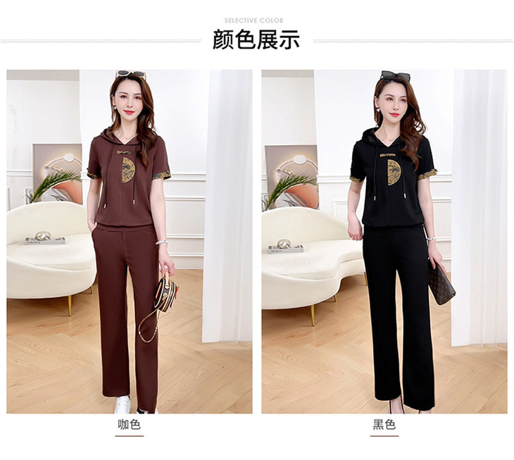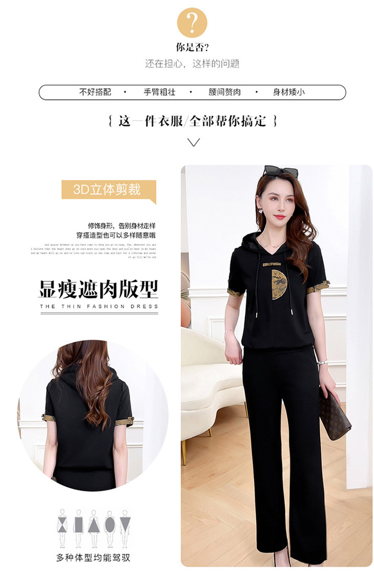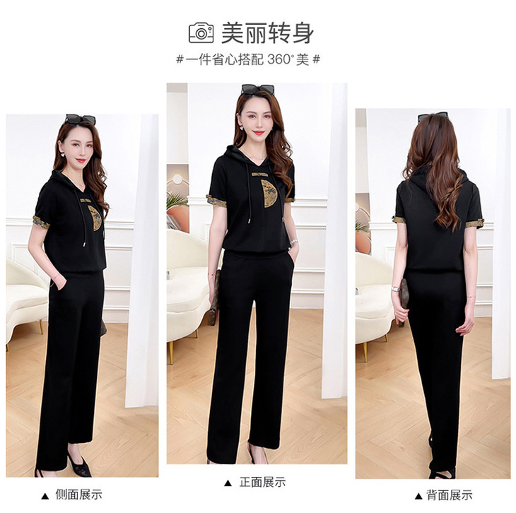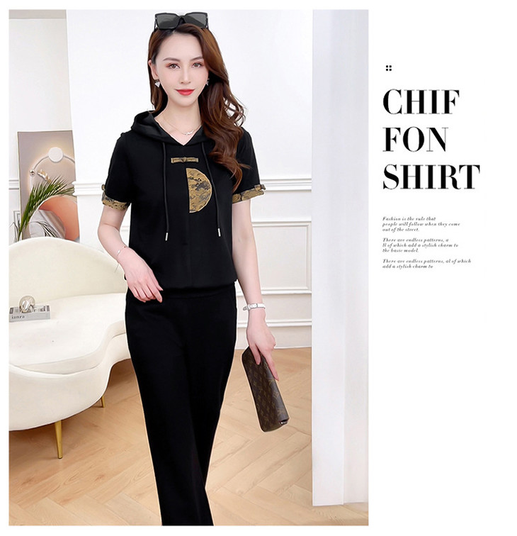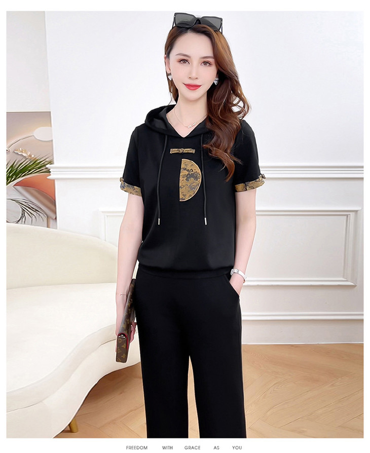 QYMXYKL-LSA15-L夏款短款休闲短袖连帽小衫简约修身显瘦直筒裤新中式运动两件套装