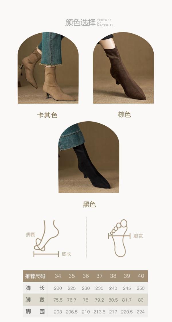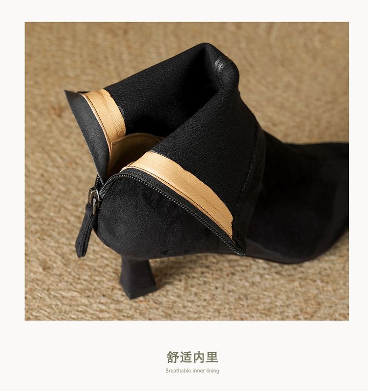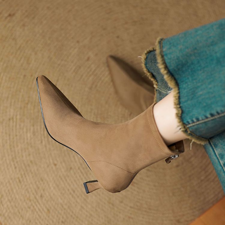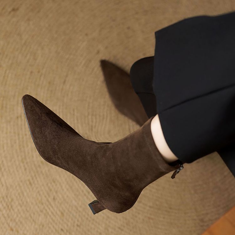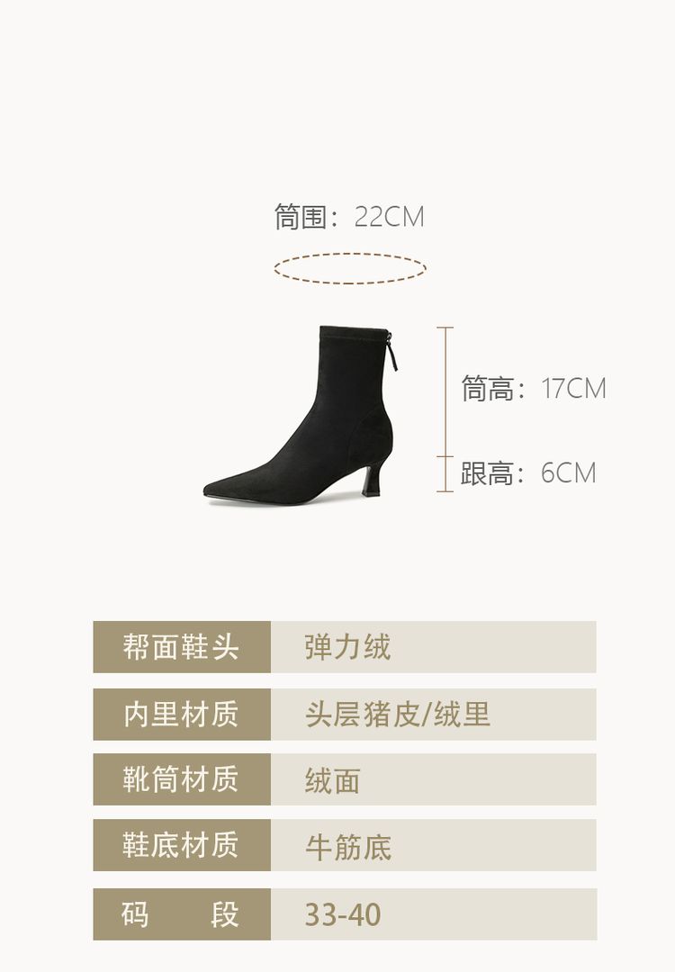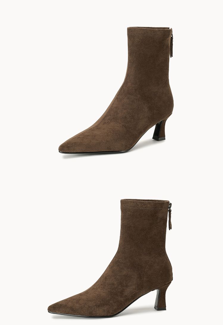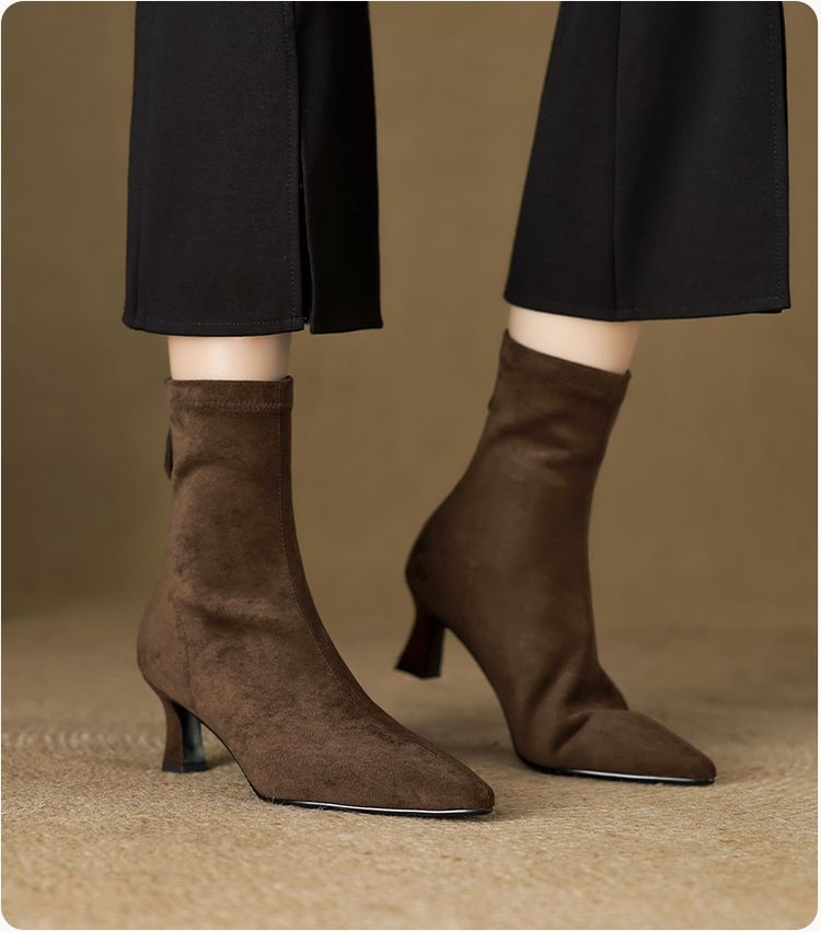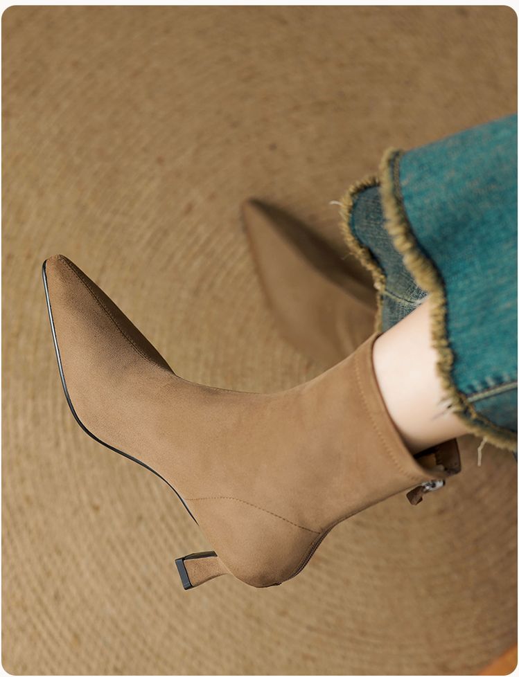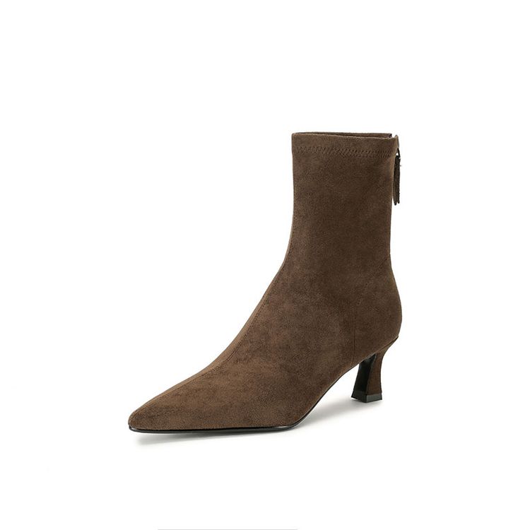 【预售5天】尖头高跟短靴女秋冬新款棕色麂皮绒面洋气裸靴弹力瘦瘦靴HB&8866