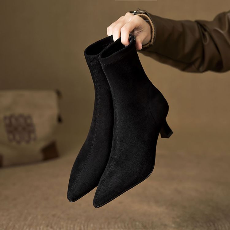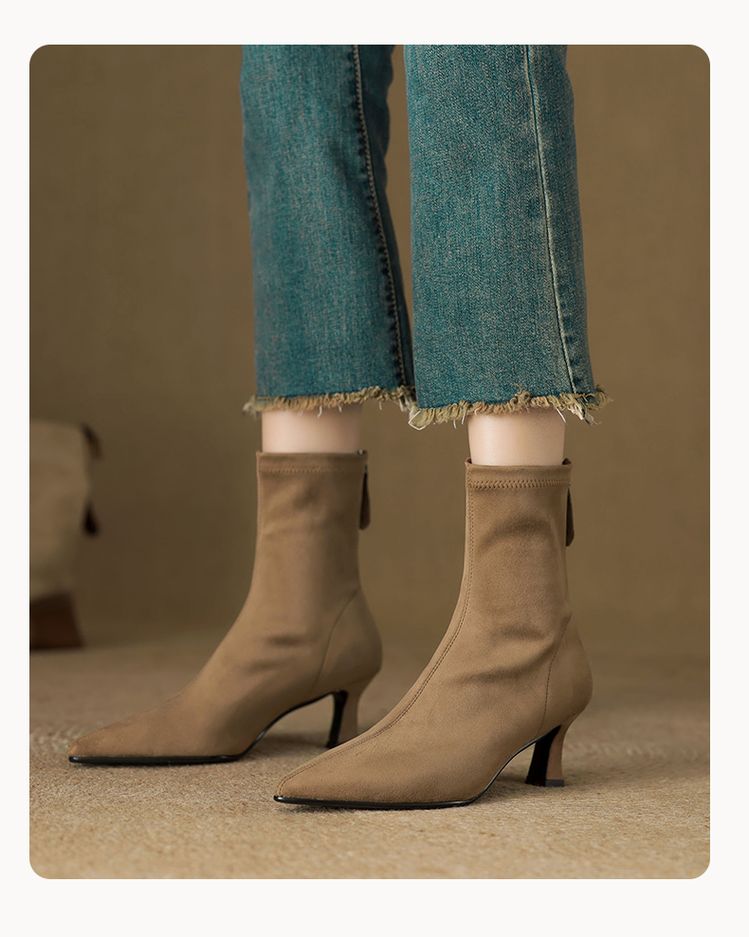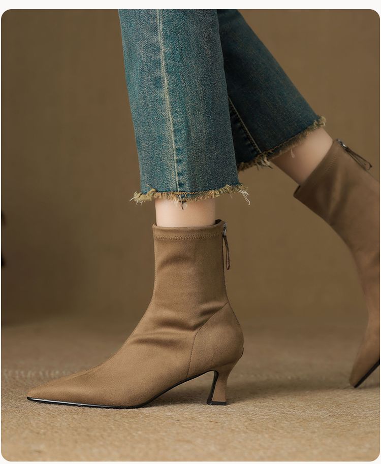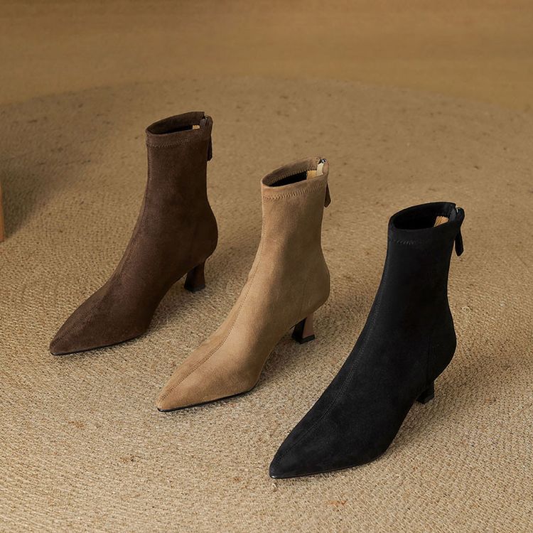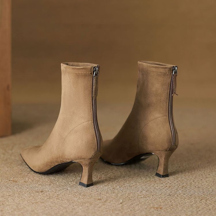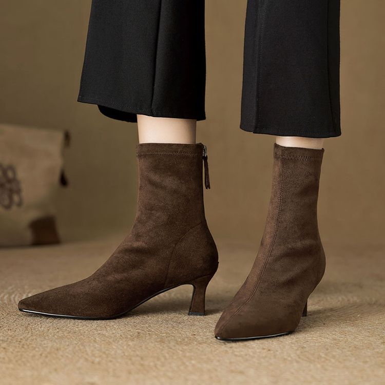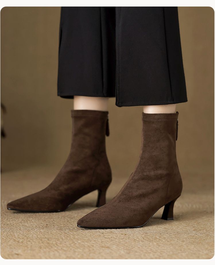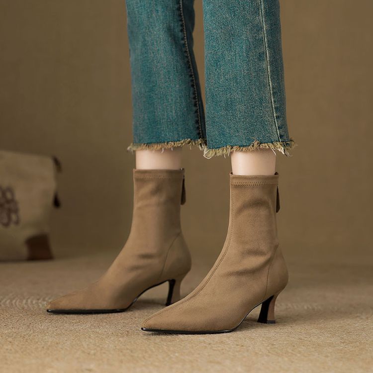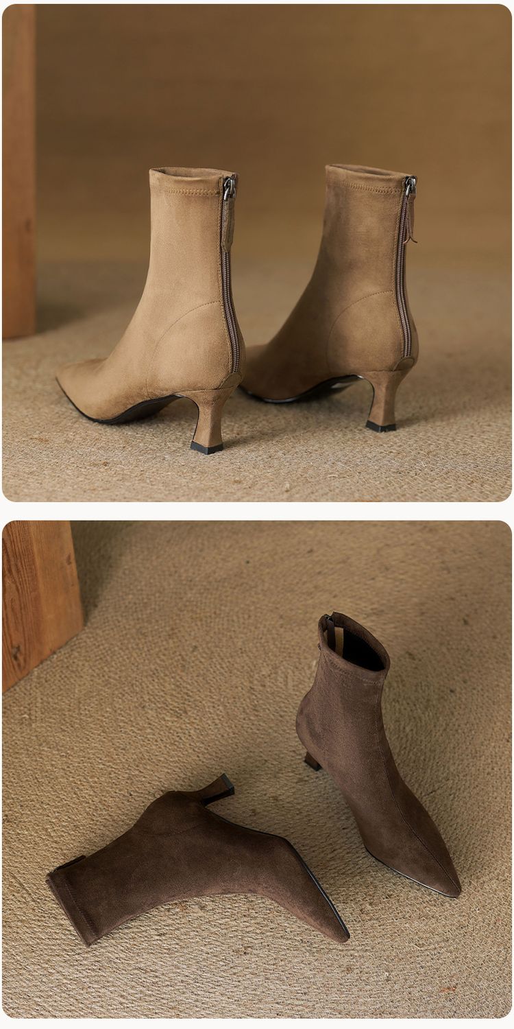 【预售5天】尖头高跟短靴女秋冬新款棕色麂皮绒面洋气裸靴弹力瘦瘦靴HB&8866