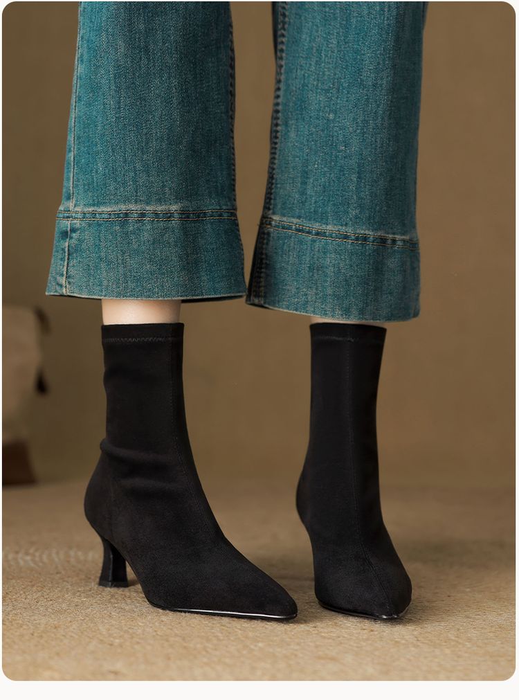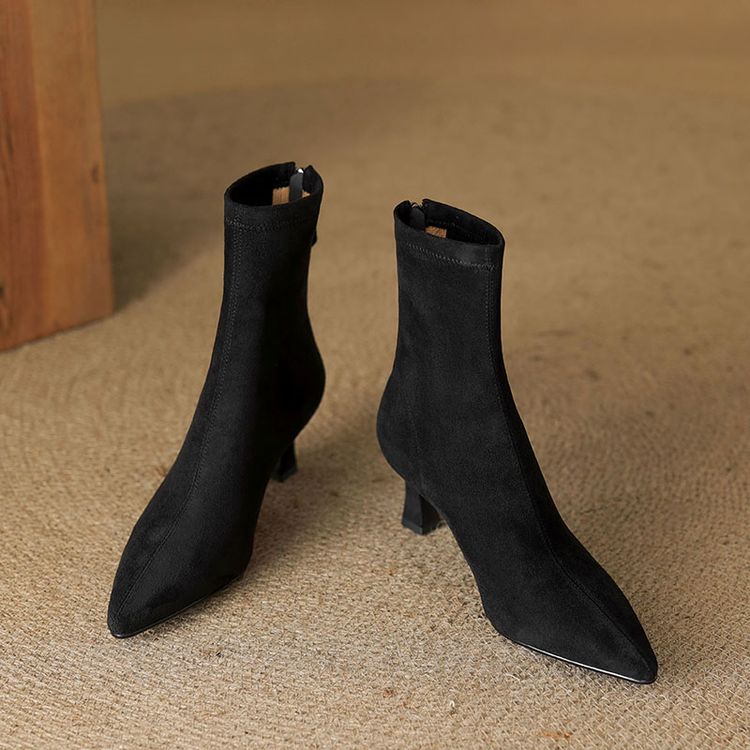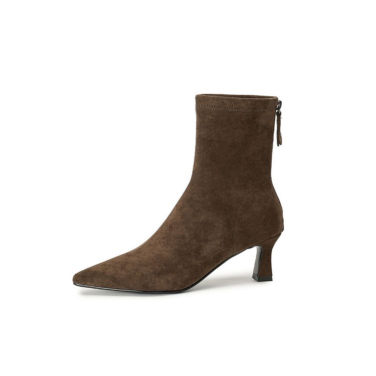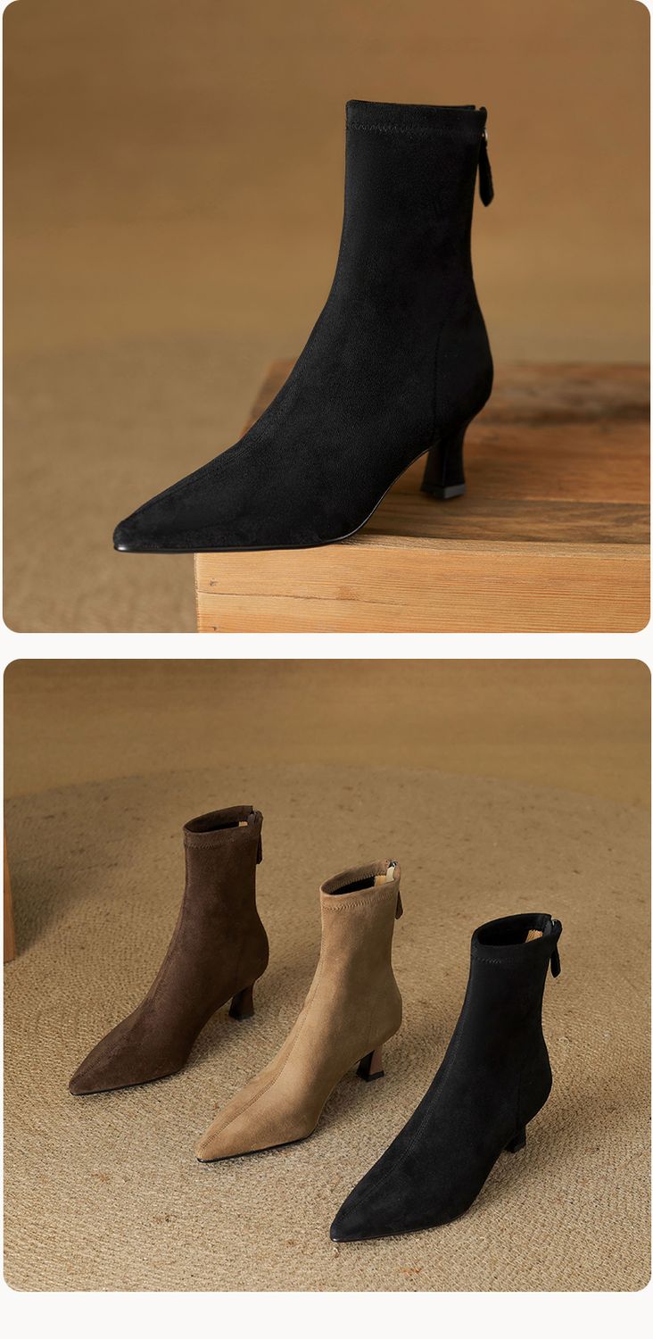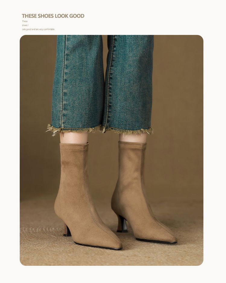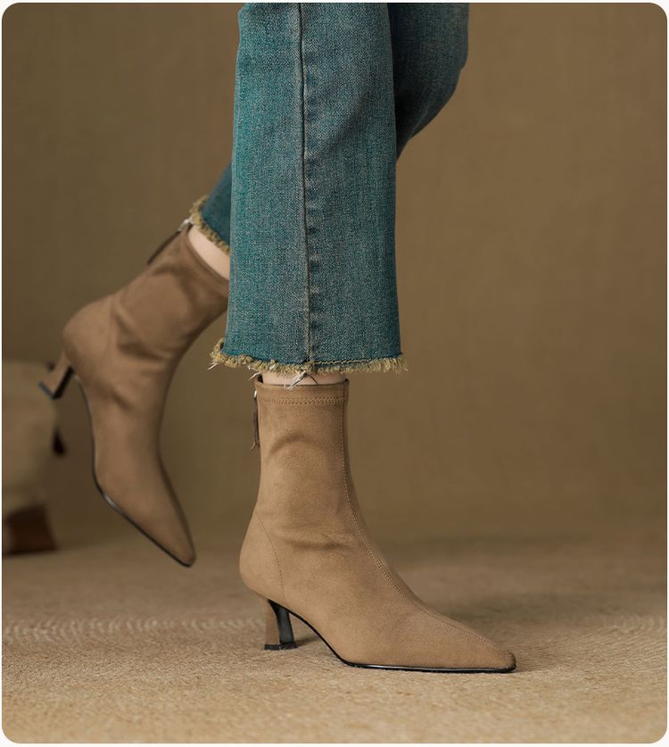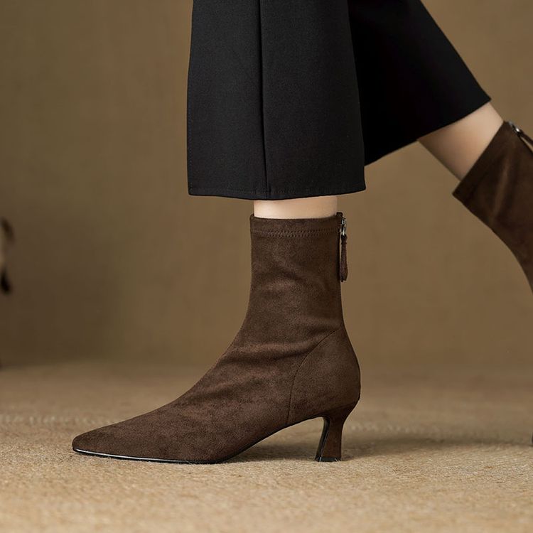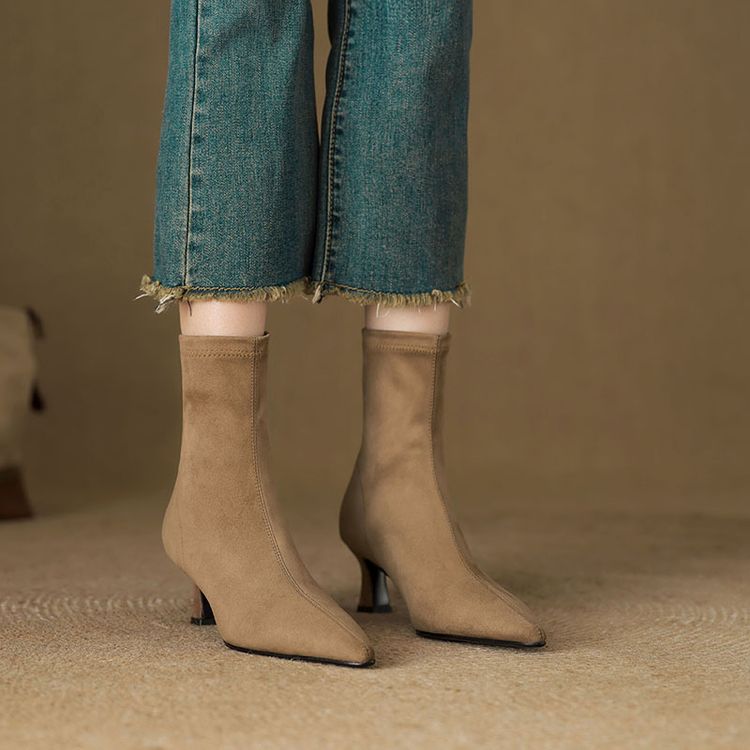 【预售5天】尖头高跟短靴女秋冬新款棕色麂皮绒面洋气裸靴弹力瘦瘦靴HB&8866