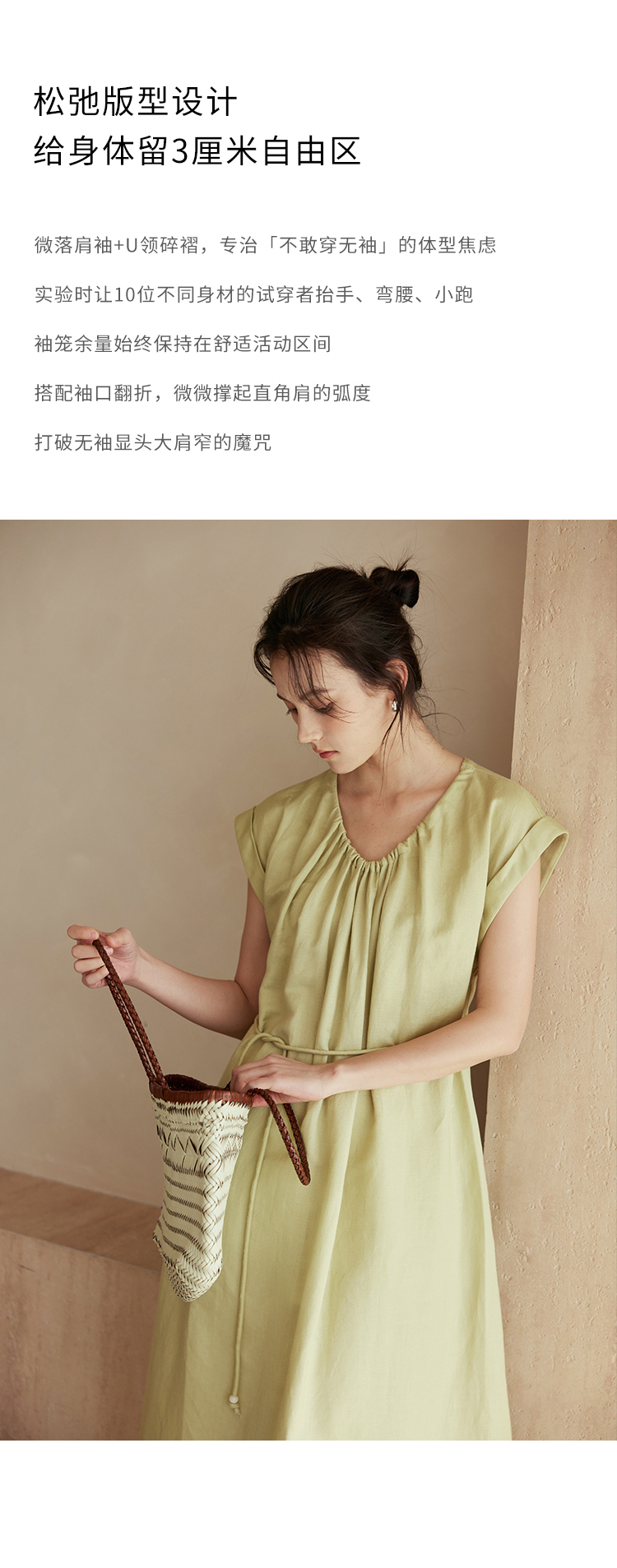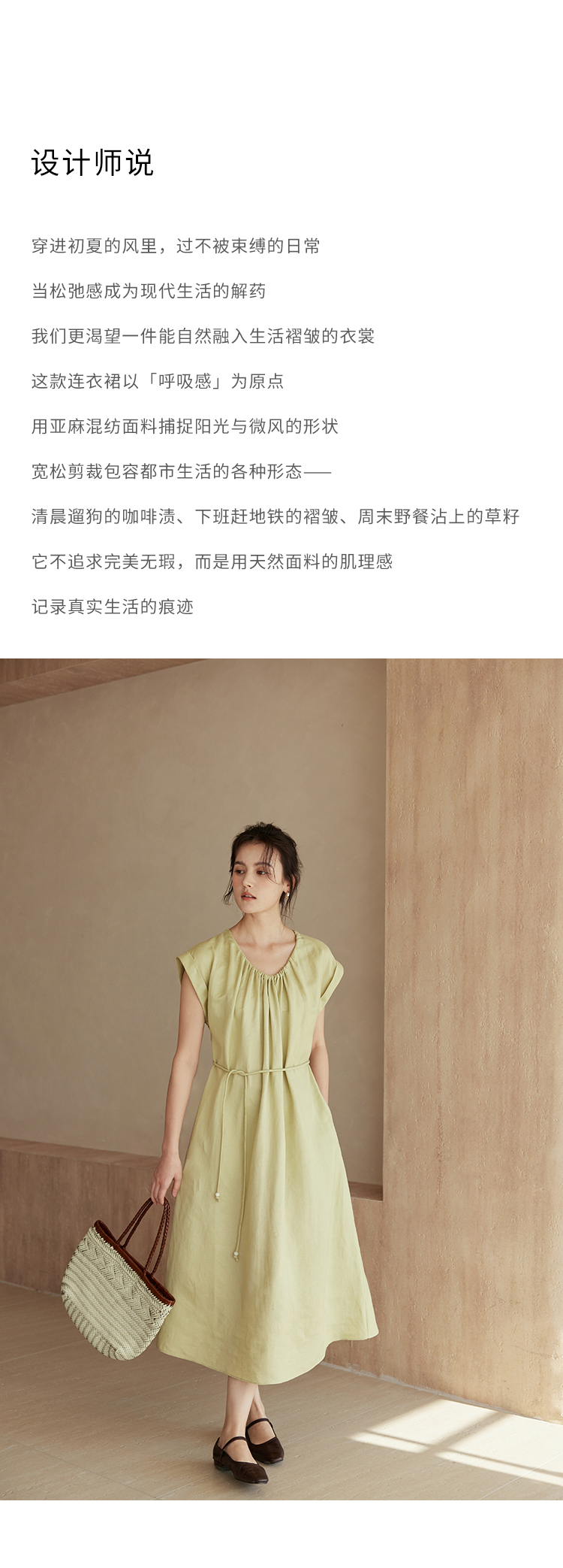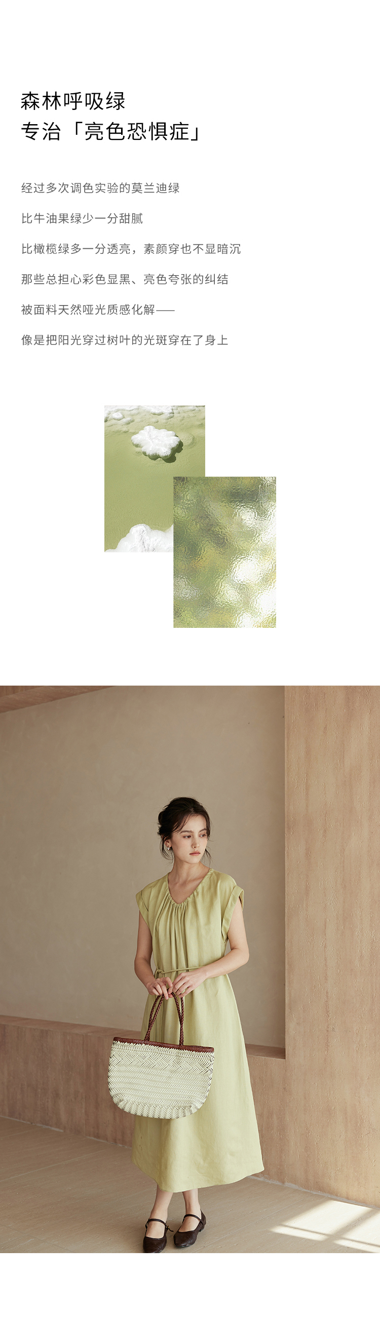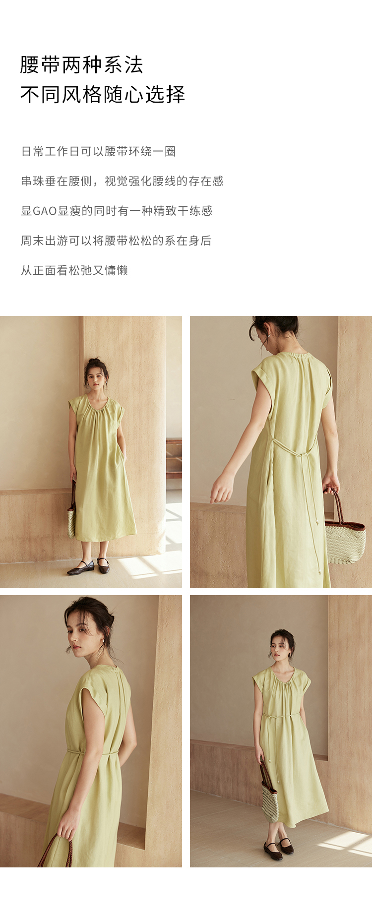 HeyDress法式亚麻连衣裙女夏季U领宽松收腰设计气质度假绿色裙子