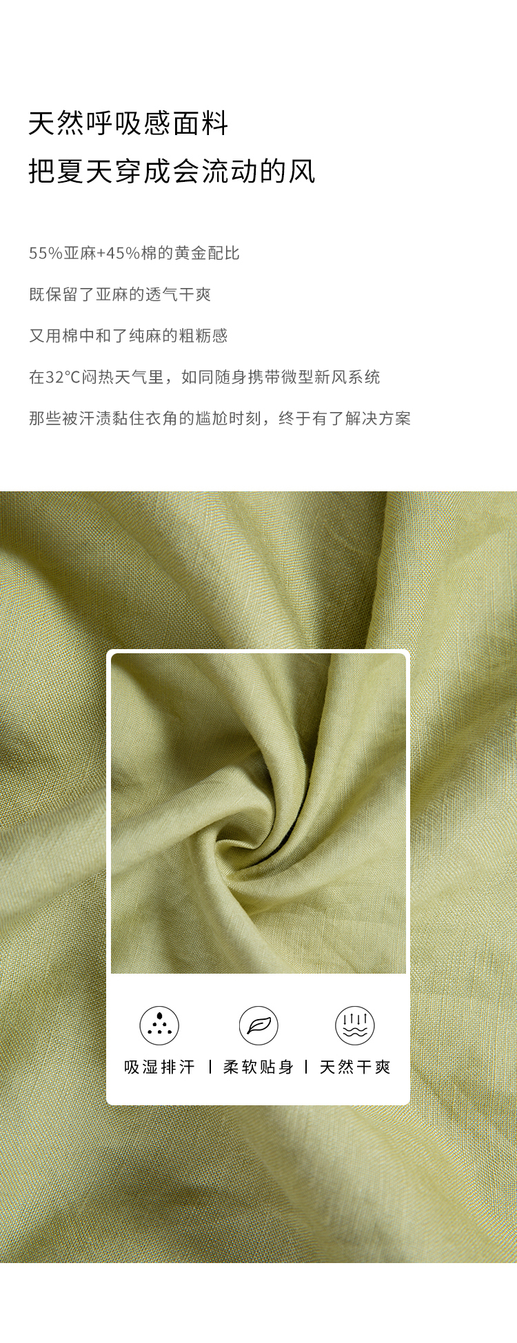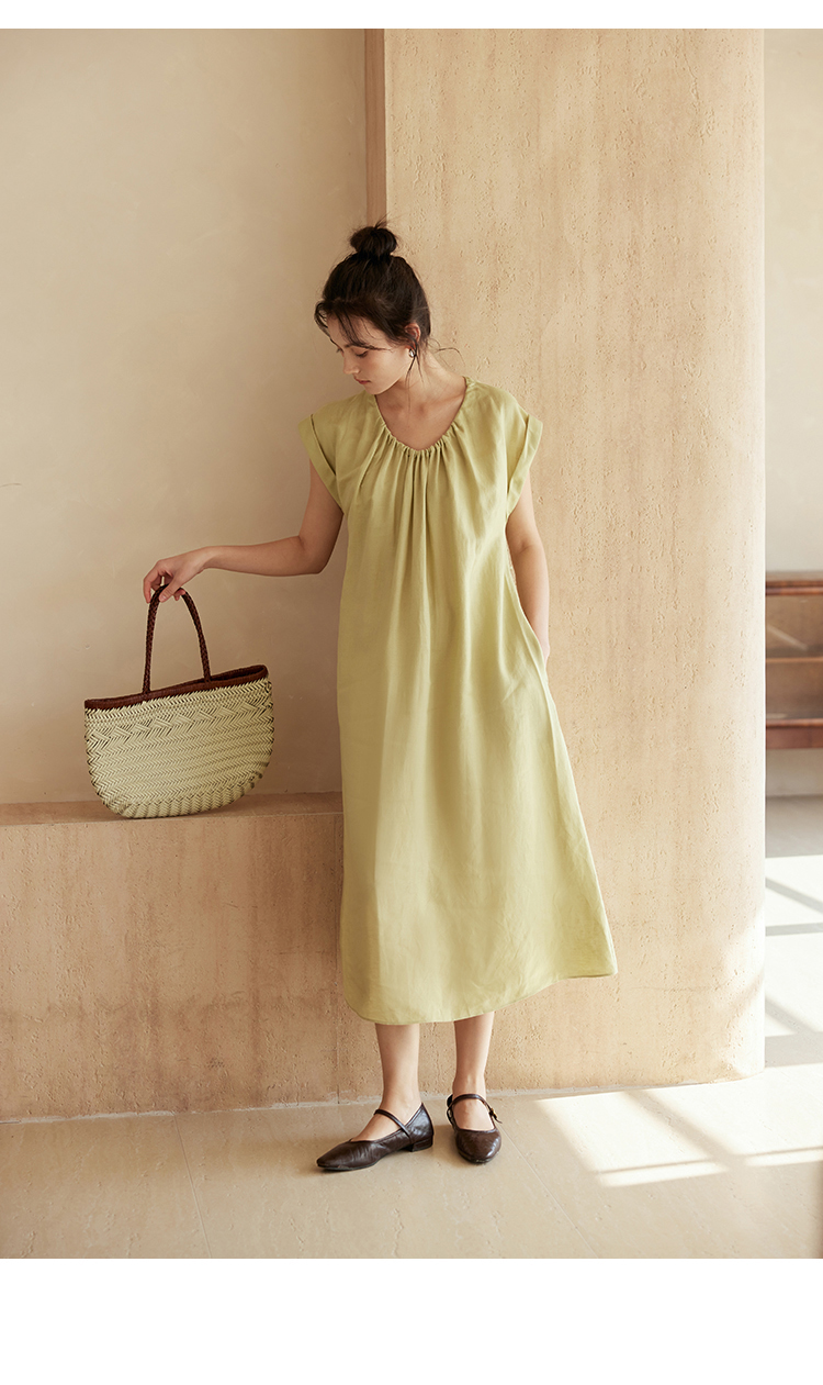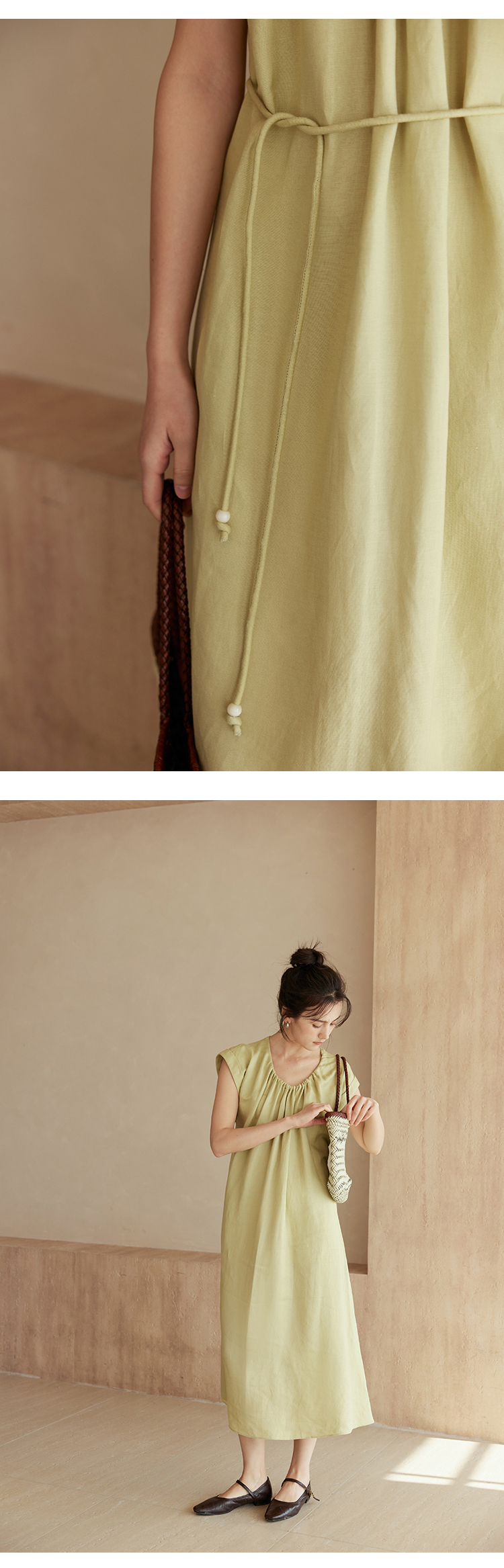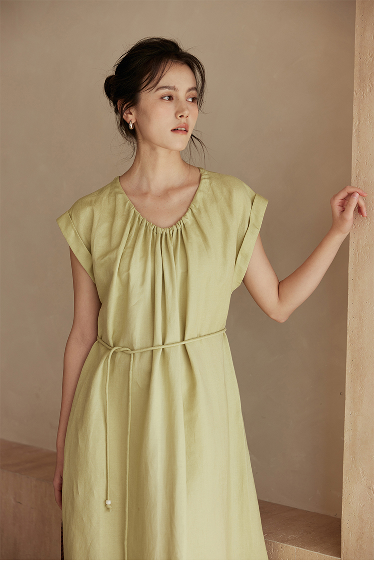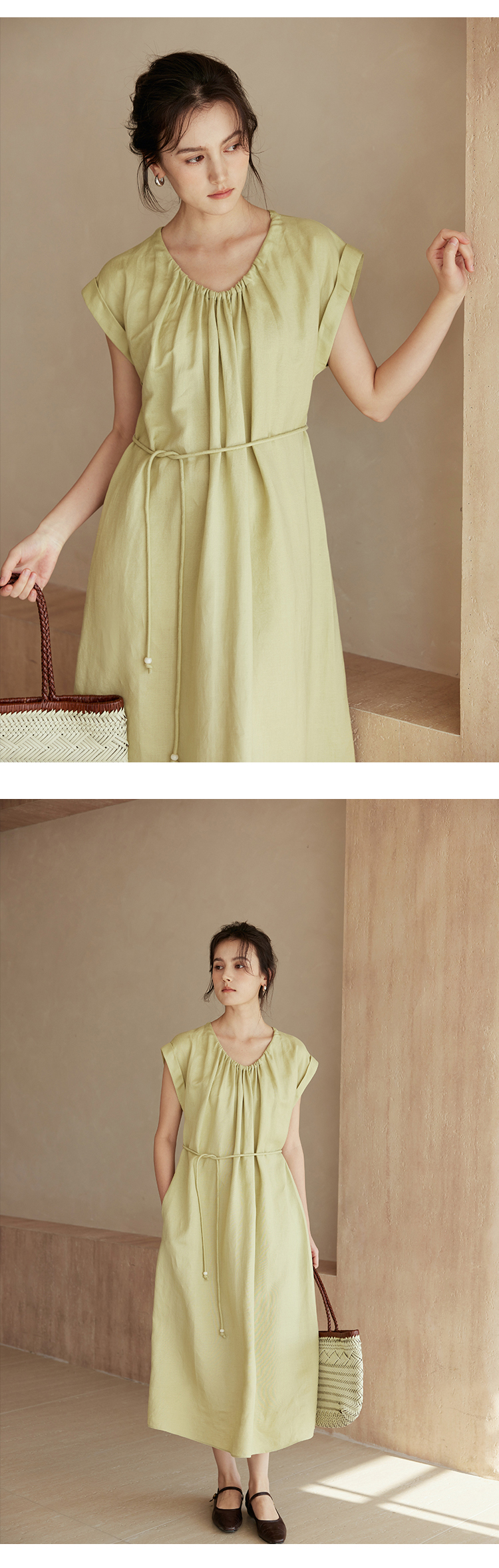 HeyDress法式亚麻连衣裙女夏季U领宽松收腰设计气质度假绿色裙子