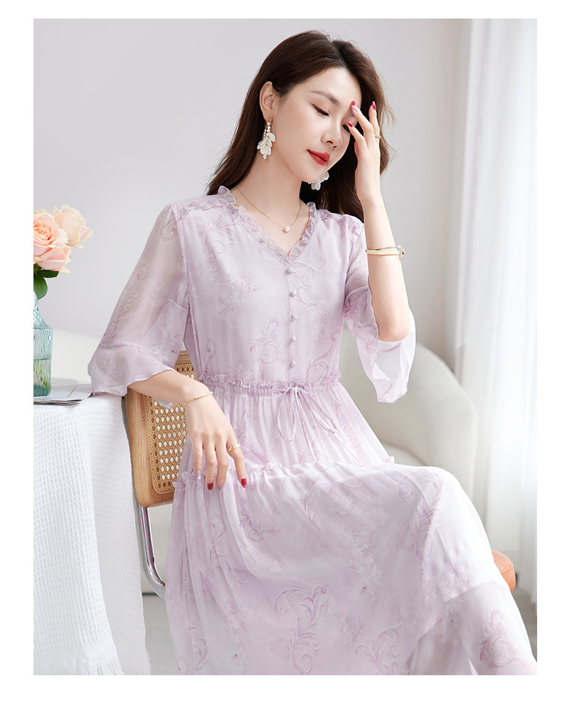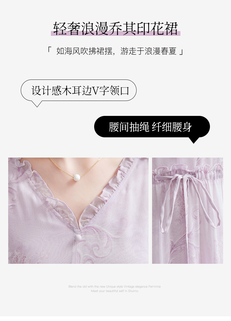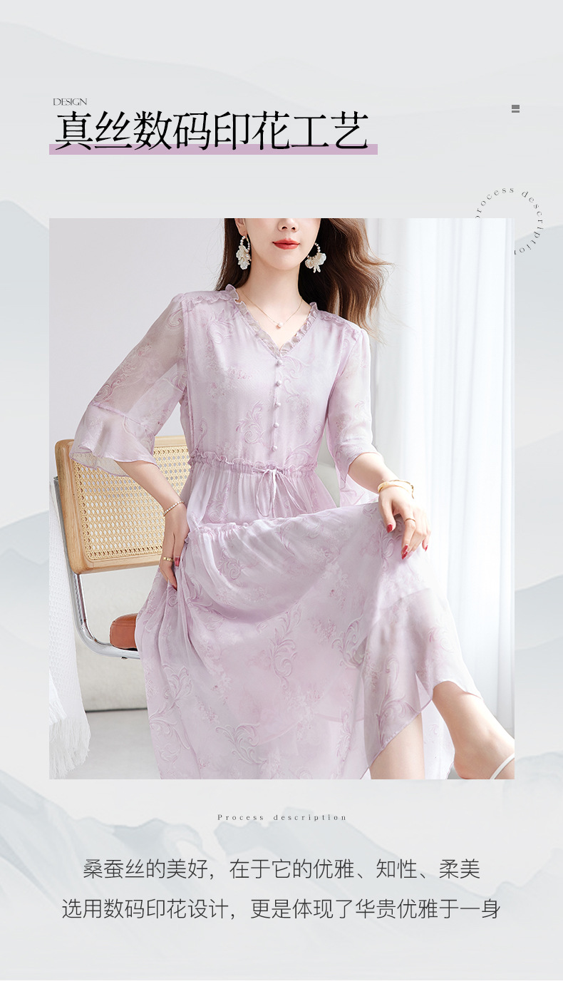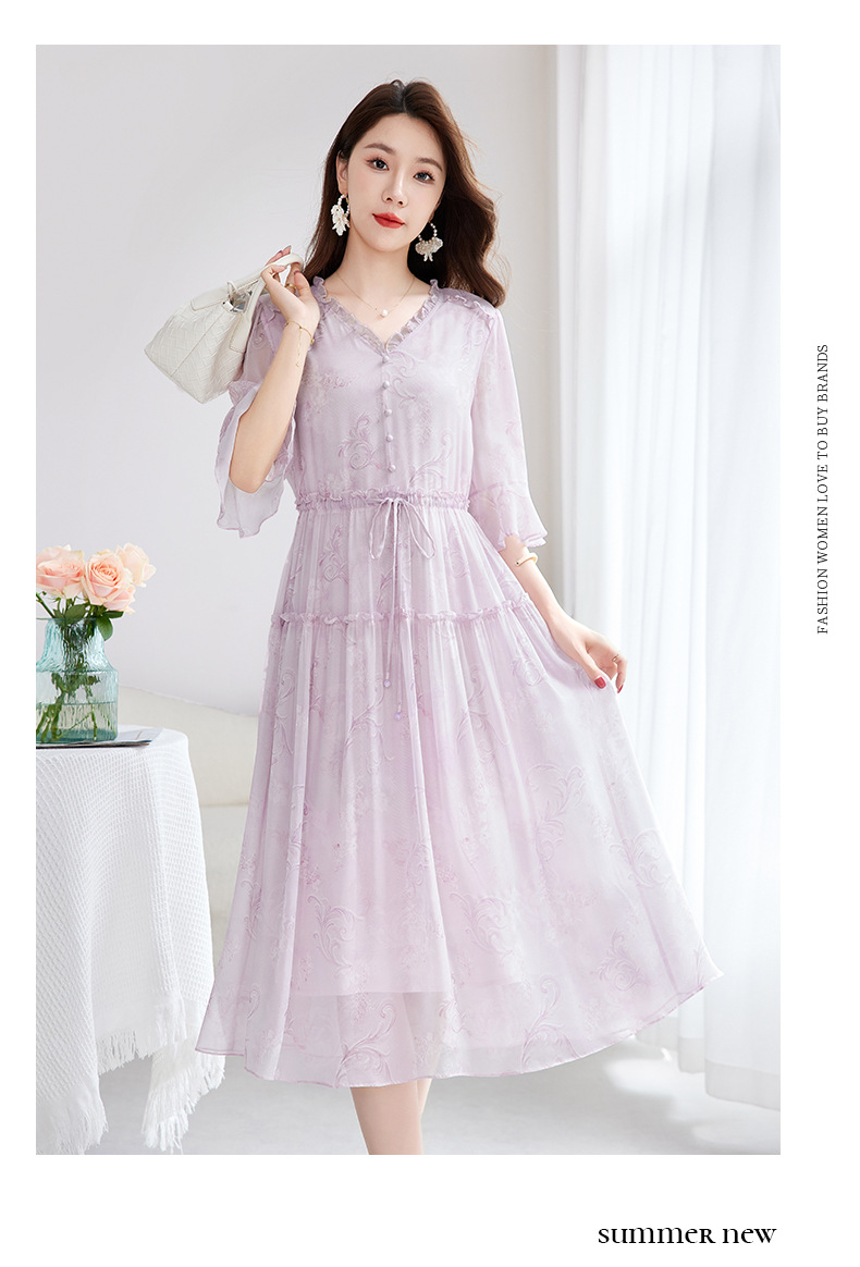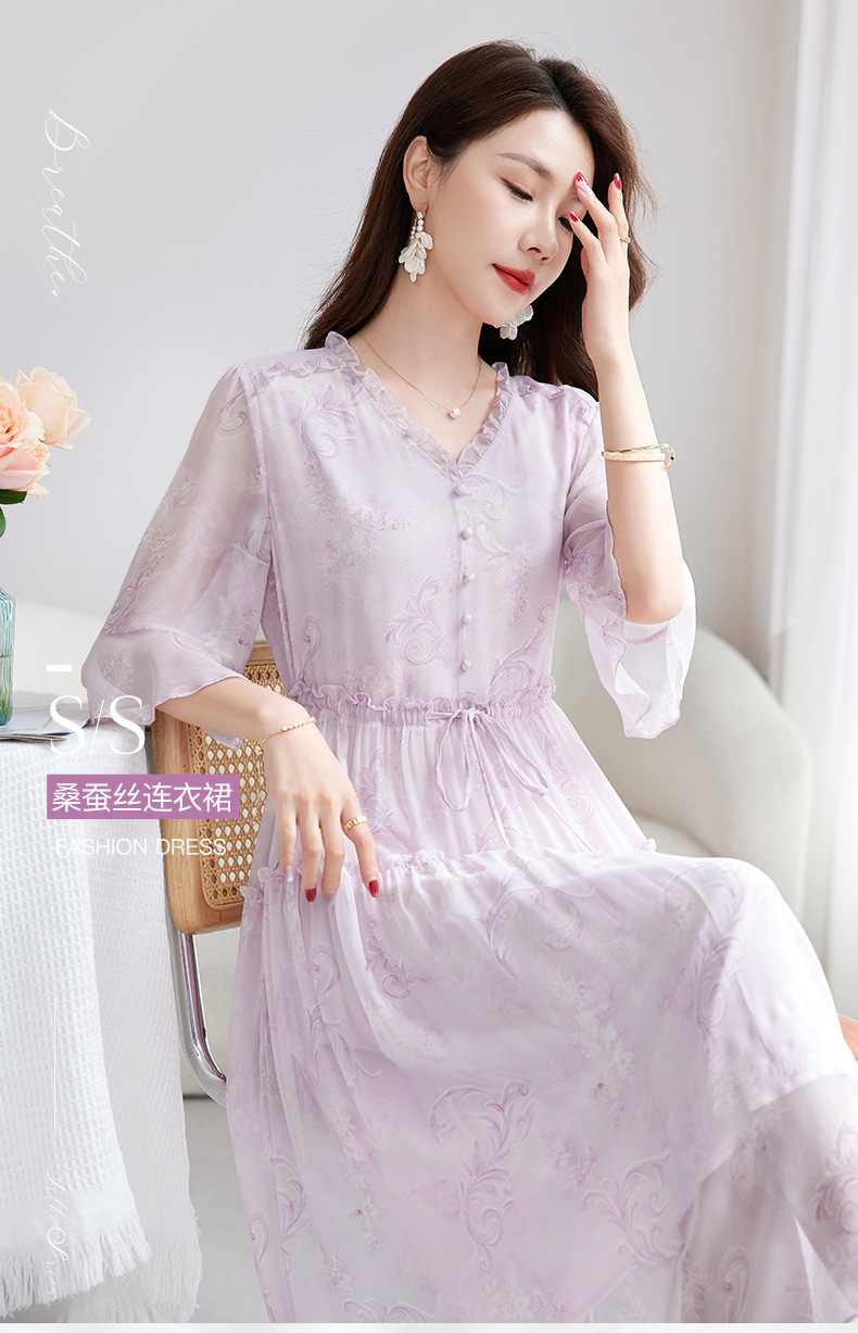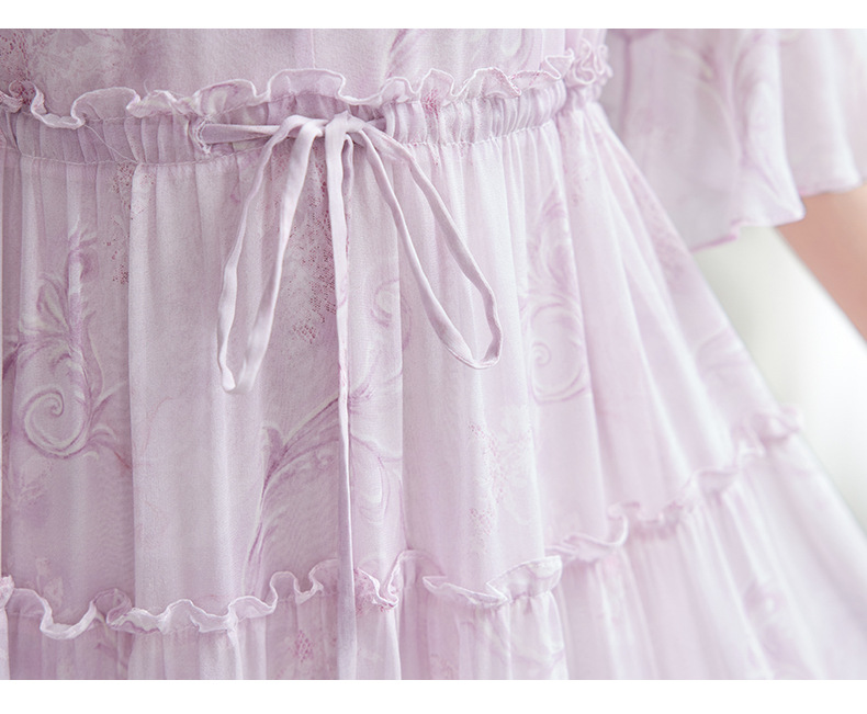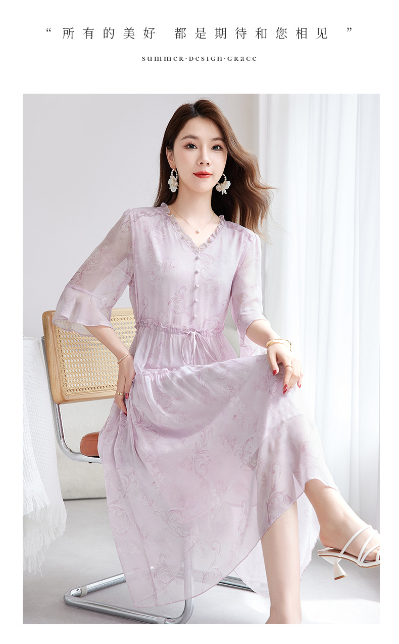 QS-82501131【清新清凉】大码真丝连衣裙女夏季100%桑蚕丝乔其印花仙女裙1131