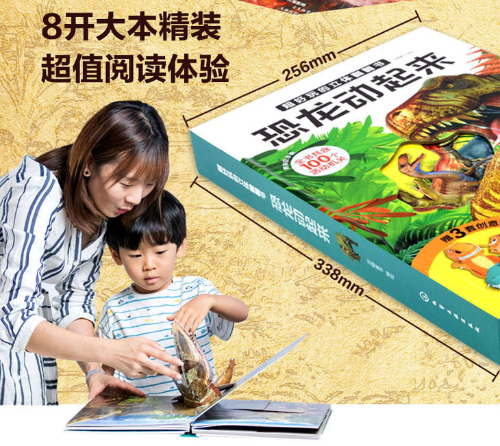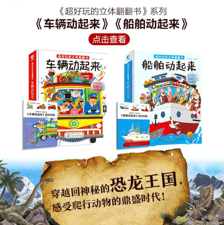 2.100个活动部件,含翻页、滑道、抽拉、铆钉、转盘、立体结构等6大类动势,生动展示鼎盛的爬行动物时代,吸引宝宝主动揭秘,在惊喜中了解恐龙;