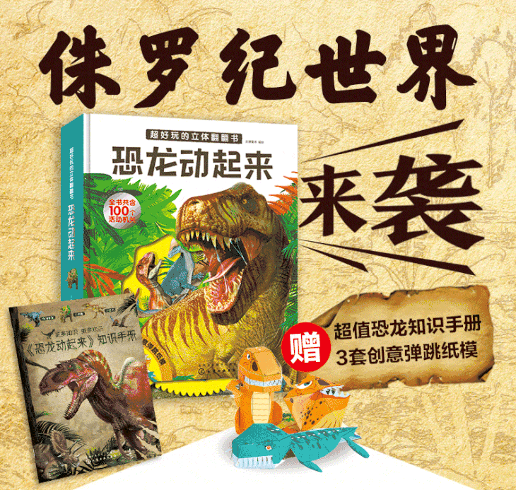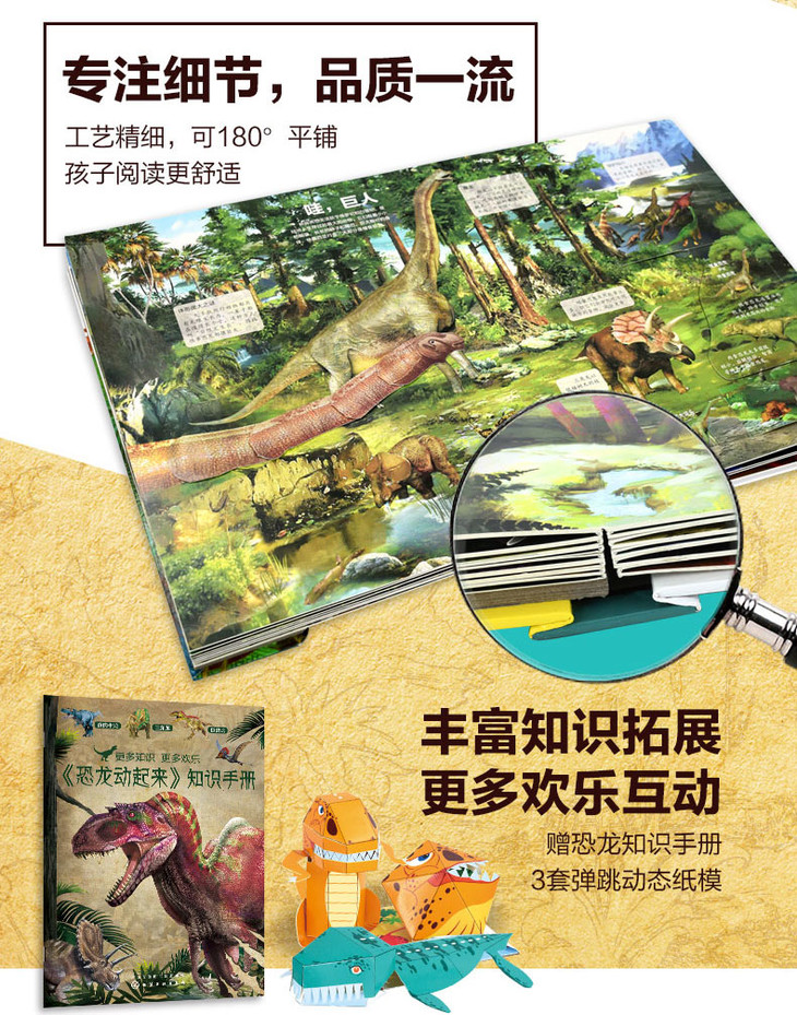 4.附赠恐龙知识手册,拓展知识点;赠3套自带刀线的创意弹跳纸模,免裁剪,简单易制作。