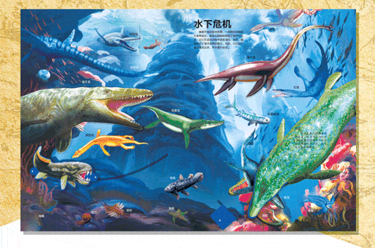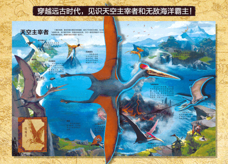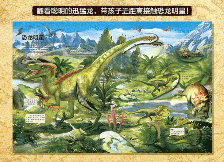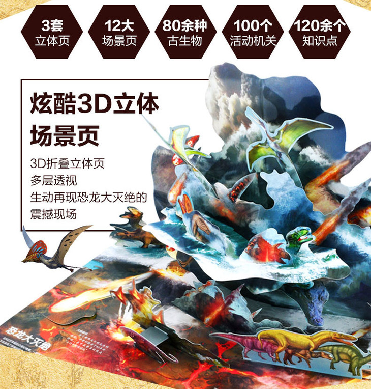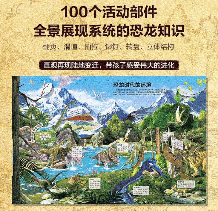 2.100个活动部件,含翻页、滑道、抽拉、铆钉、转盘、立体结构等6大类动势,生动展示鼎盛的爬行动物时代;