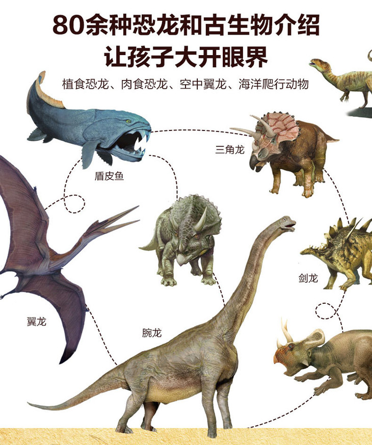 1.全书12大全景页、80余种恐龙和古生物介绍,120余个古生物知识点,内容充实、耐读;