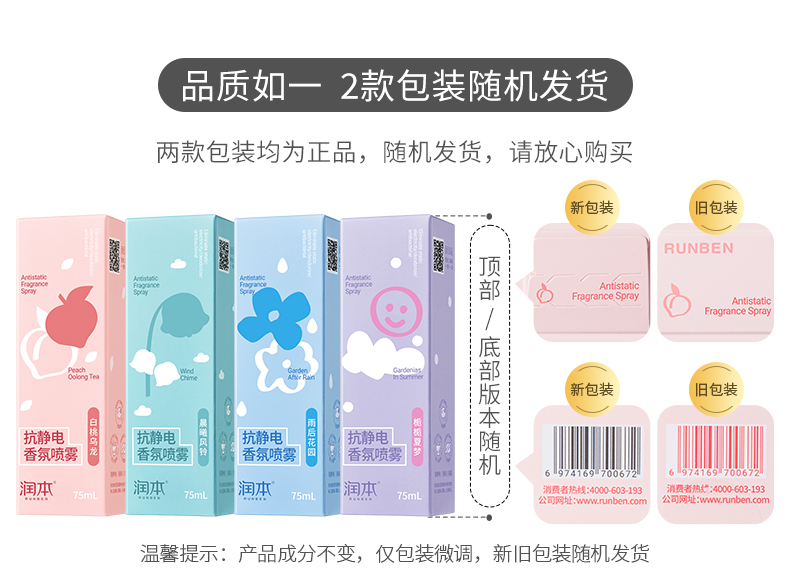 【品牌直发】润本抗静电香氛喷雾 75ml 衣服头发除静电去味柔顺剂除皱抗静电