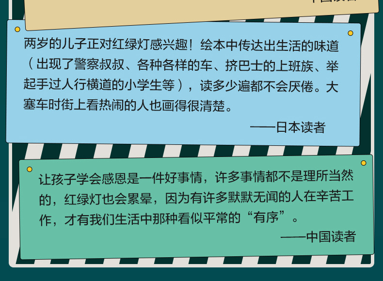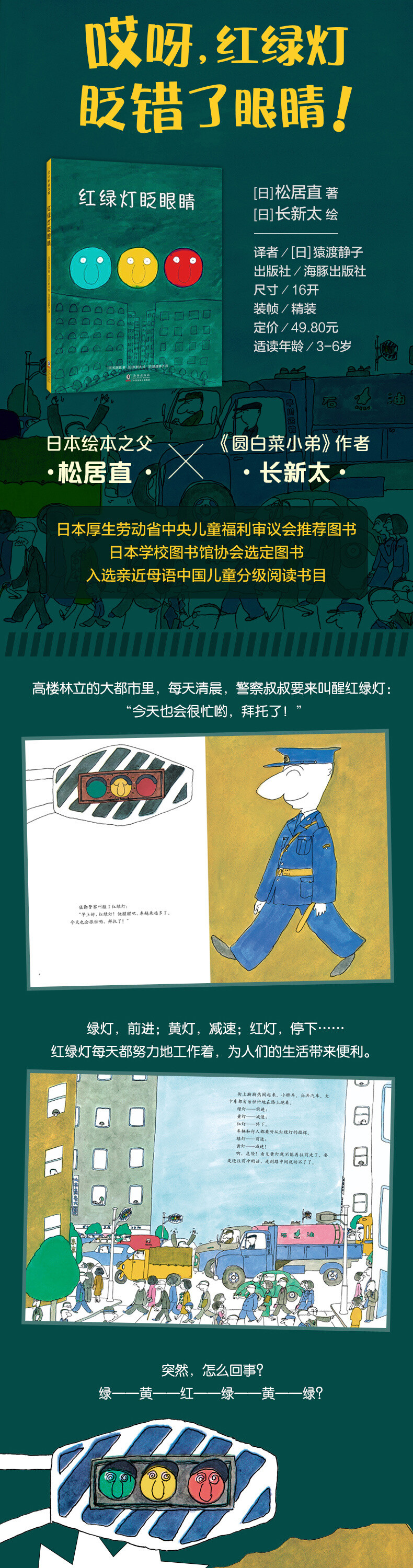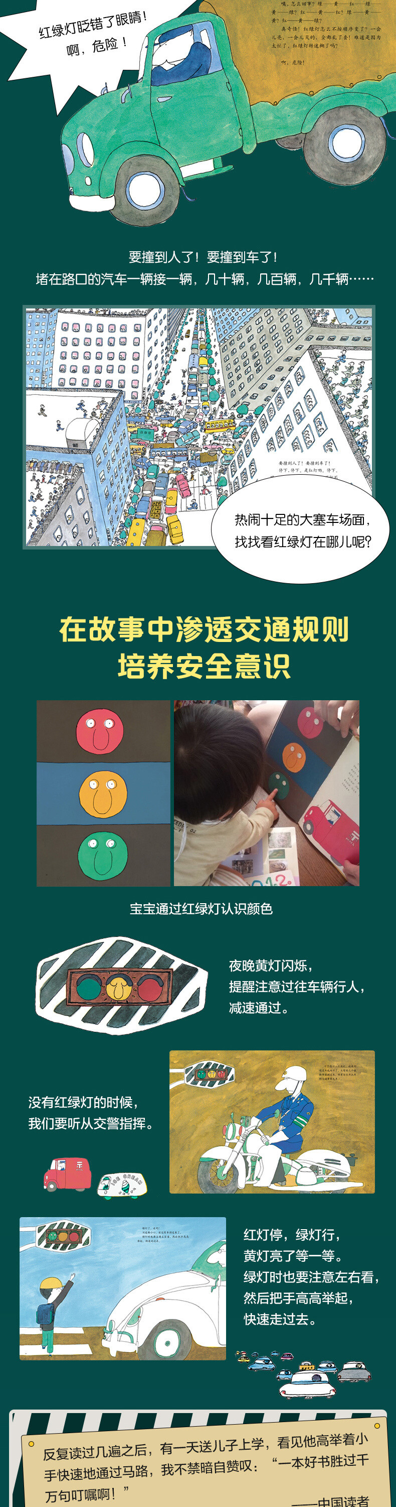 ★故事巧妙地将信号灯拟人化。生动形象、滑稽夸张的表情,热闹十足的大塞车场面,定会让孩子们开怀大笑。如果说哪本书做到了“寓教于乐”,那非《红绿灯眨眼睛》莫属!