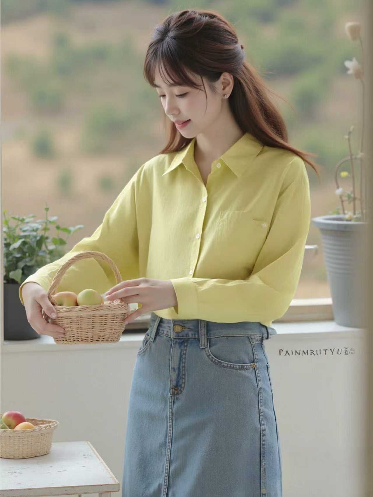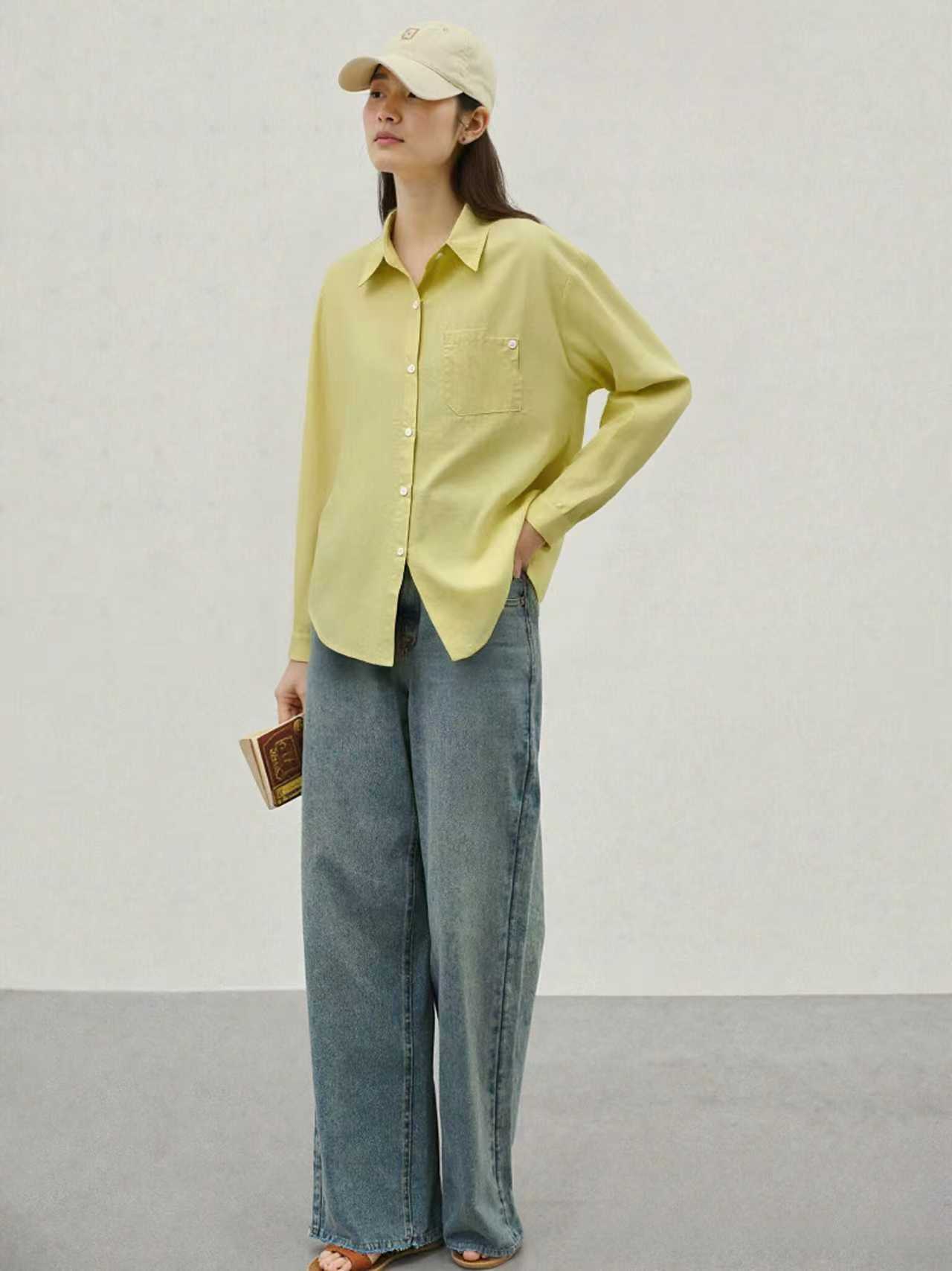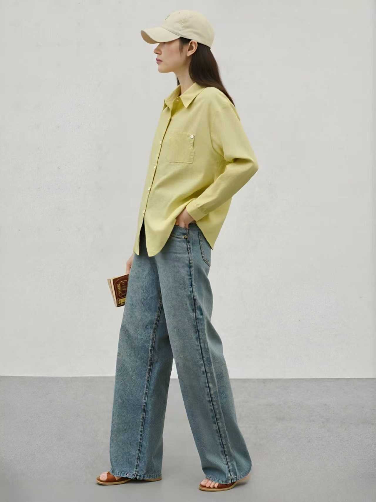 【秋新品】80%棉浅黄不规则口袋后开叉长袖衬衫(微微脏)-喜出