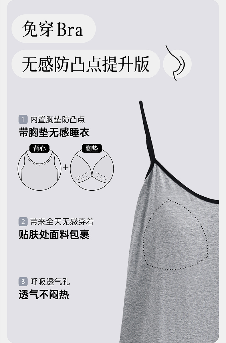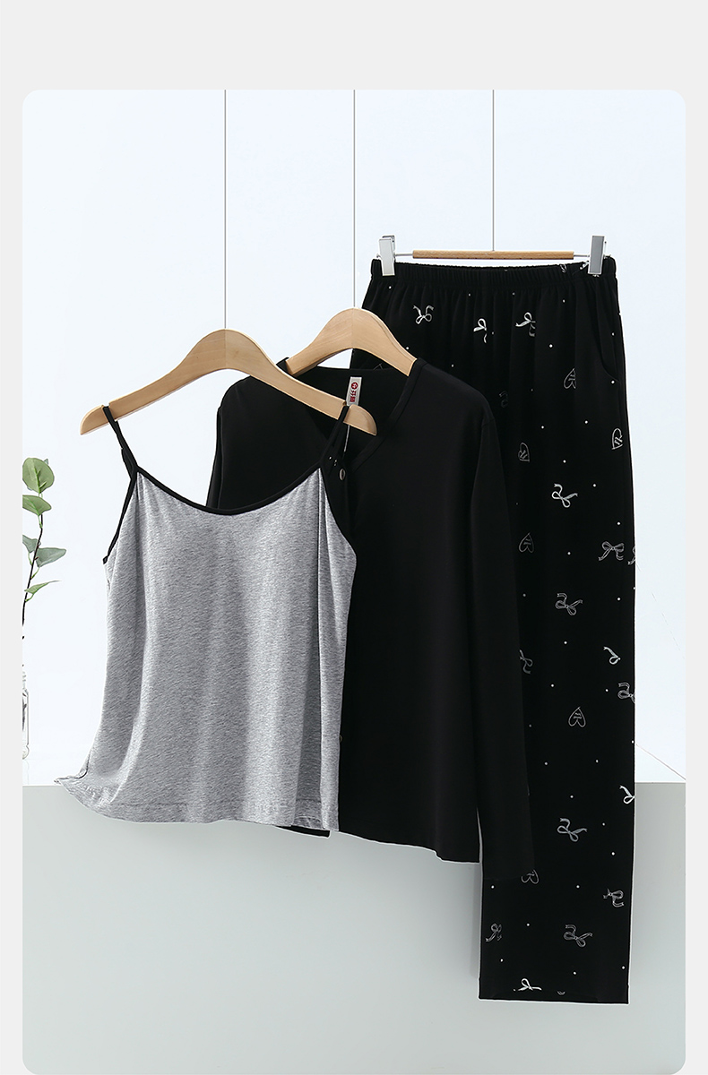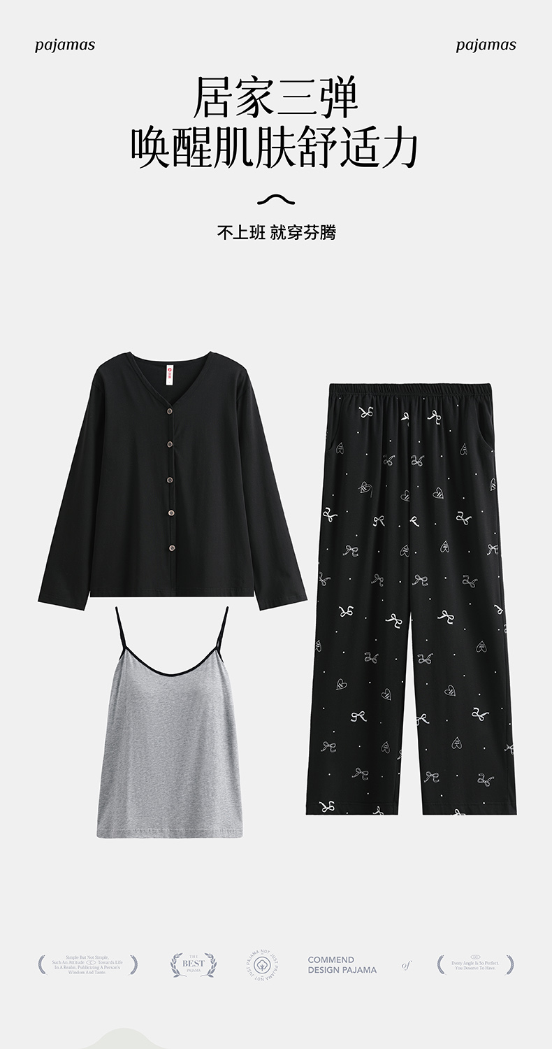 芬腾3件套带胸垫吊带背心睡衣女春季纯棉长袖V领可外穿家居服套装
