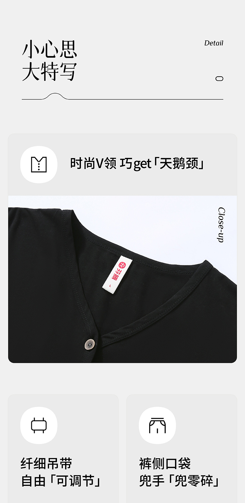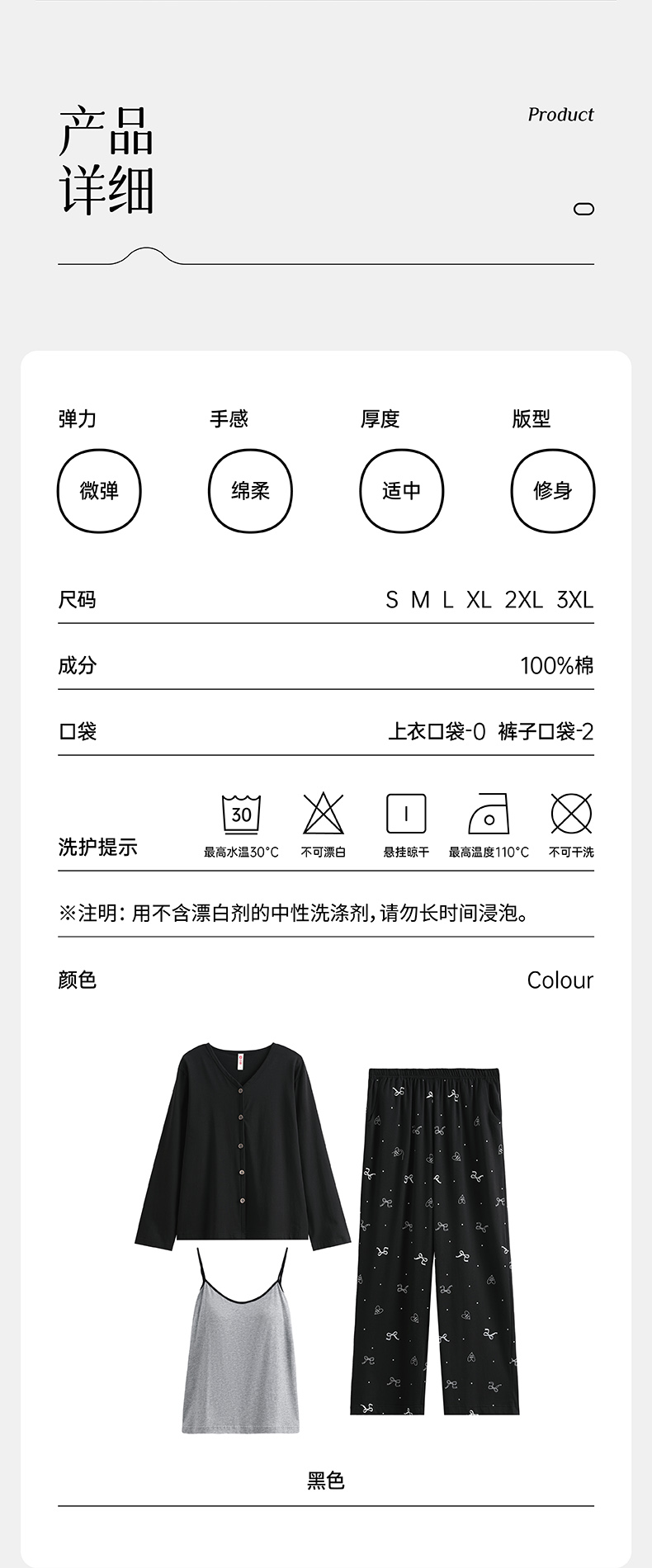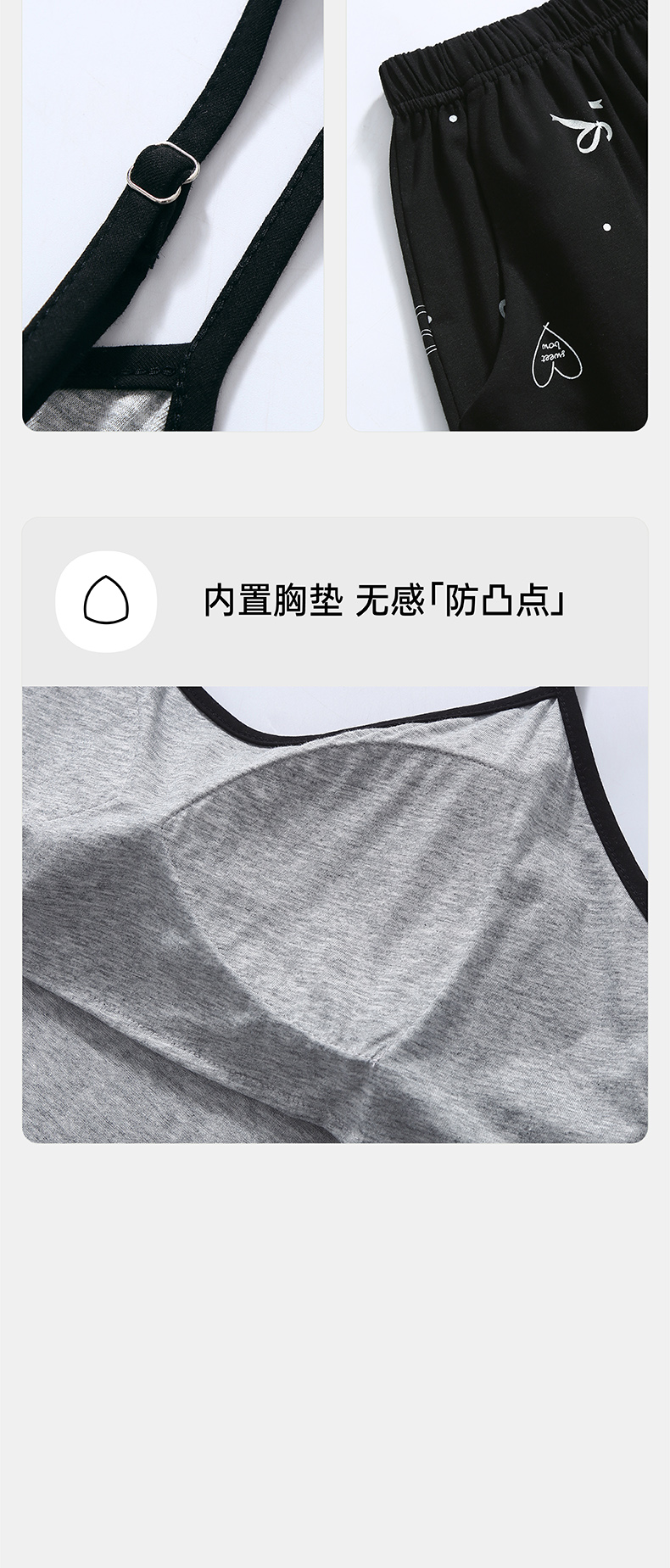 芬腾3件套带胸垫吊带背心睡衣女春季纯棉长袖V领可外穿家居服套装