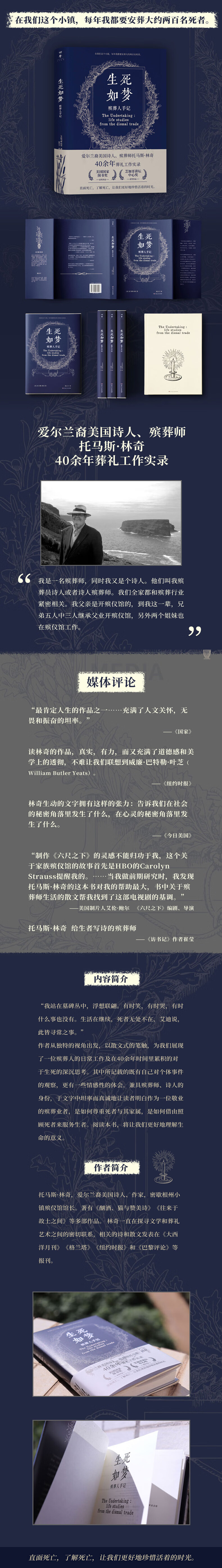 “我站在墓碑丛中,浮想联翩。有时笑,有时哭,有时什么事也没有。生活在继续,死者无处不在,艾迪说,此皆寻常之事。”作者从独特的视角出发,以散文式的笔触,为我们展现了一位殡葬人的日常工作及在40余年时间里累积的对于生死的深沉思考。其中所记载的既有自己对个体事件的观察,更有一些情感性的体会。兼具殡葬师、诗人的身份,于文字中坦率而真诚地让读者明白作为一位敬业的殡葬业者,是如何尊重死者与其家属,是如何借由照顾死者来服务生者。阅读本书,将让我们更好地理解生命的意义。