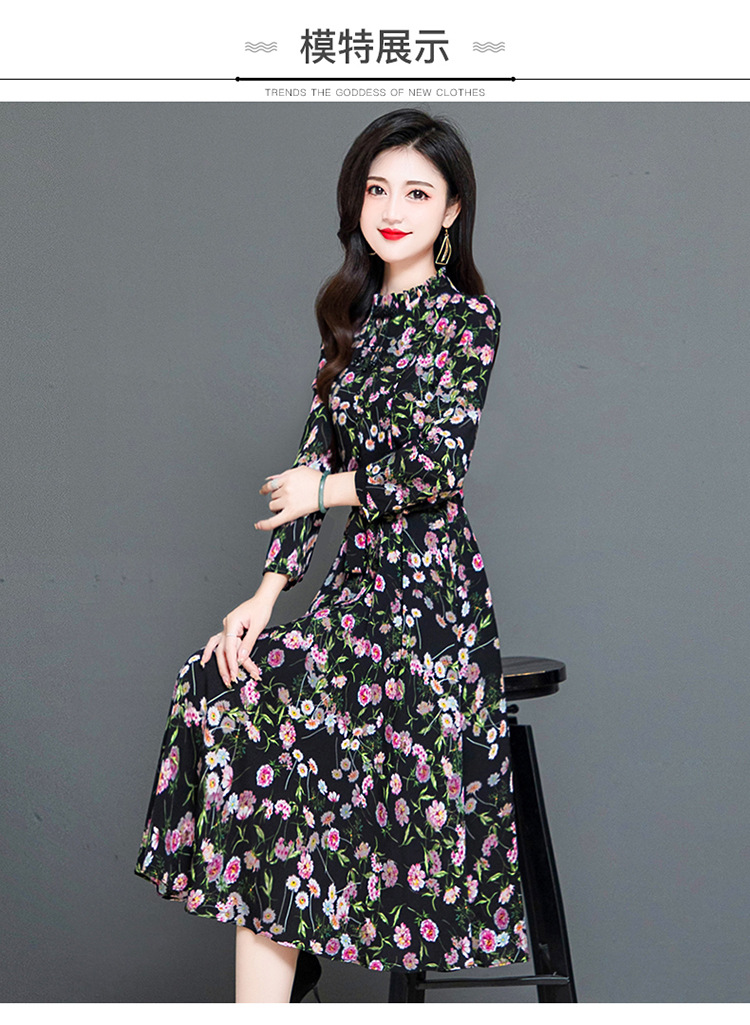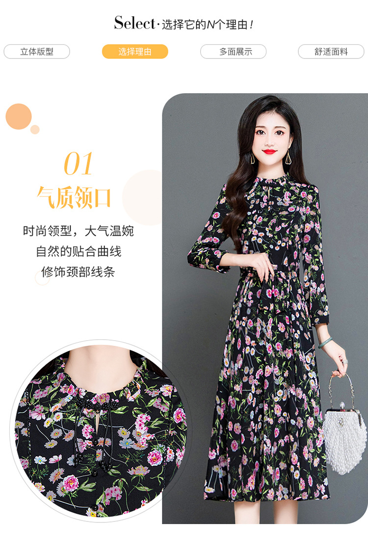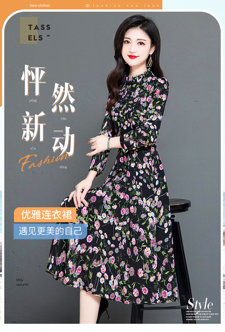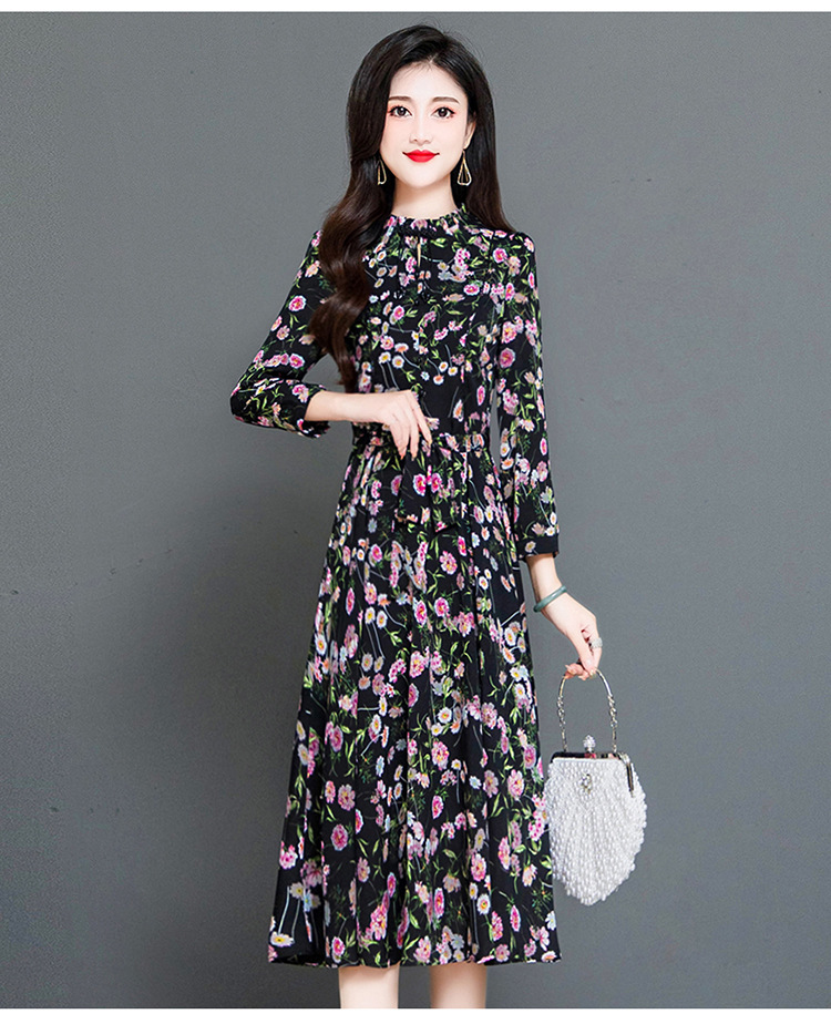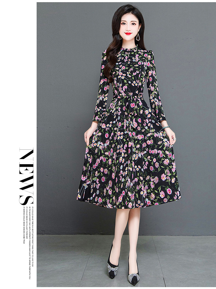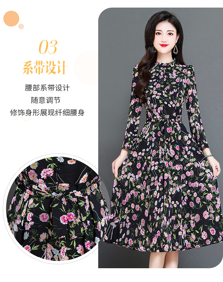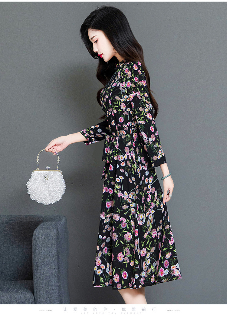 秋季新款,长袖裙时尚气质长袖中长款黑底粉花A字裙印花连衣裙QYM-TYH-231347-Y