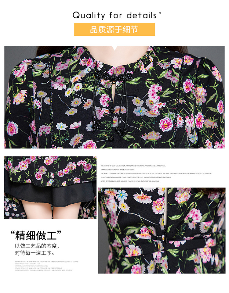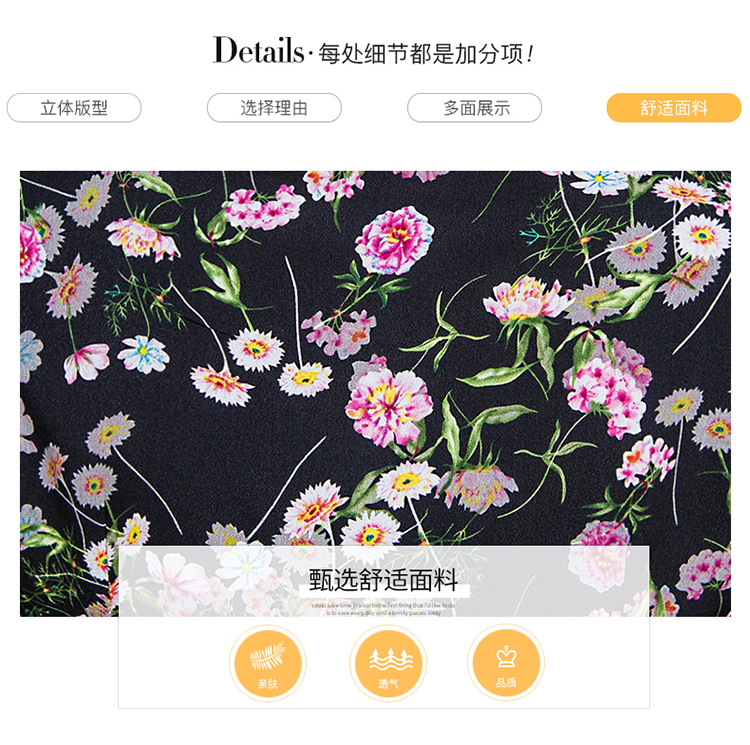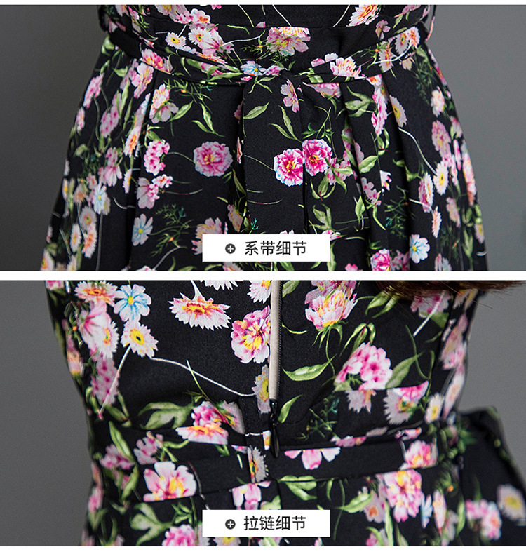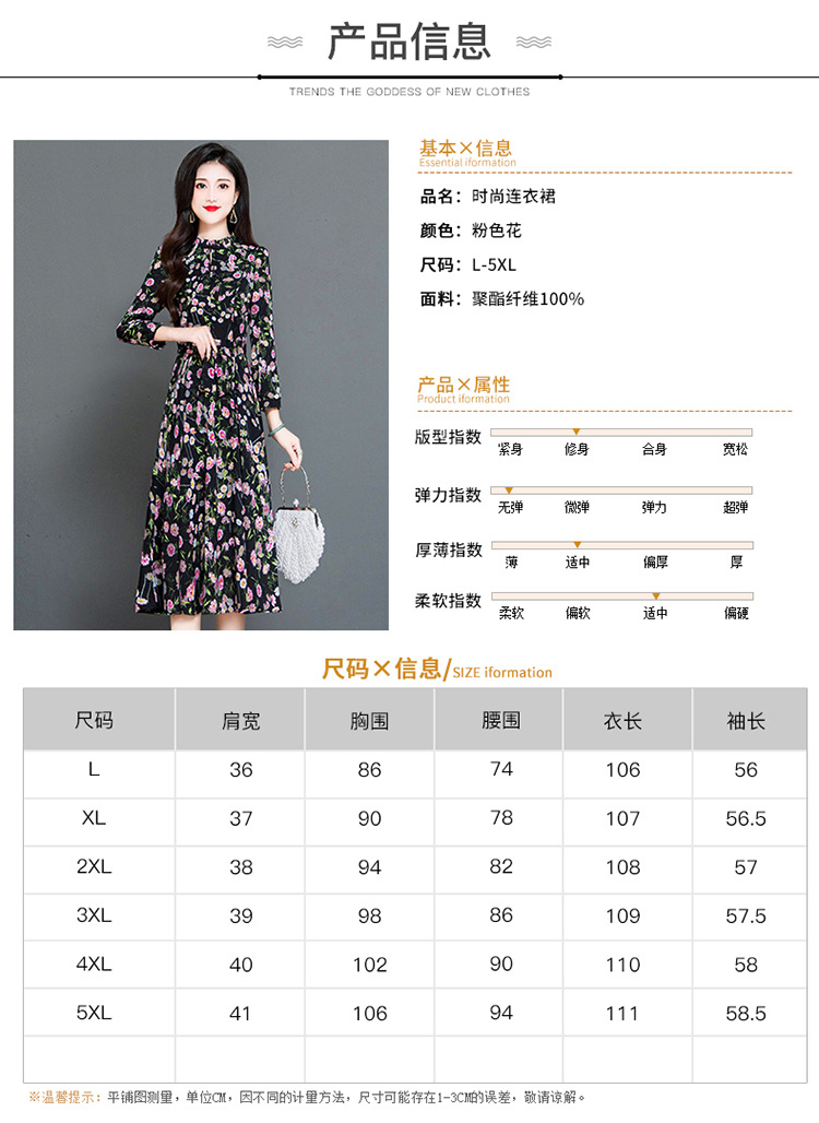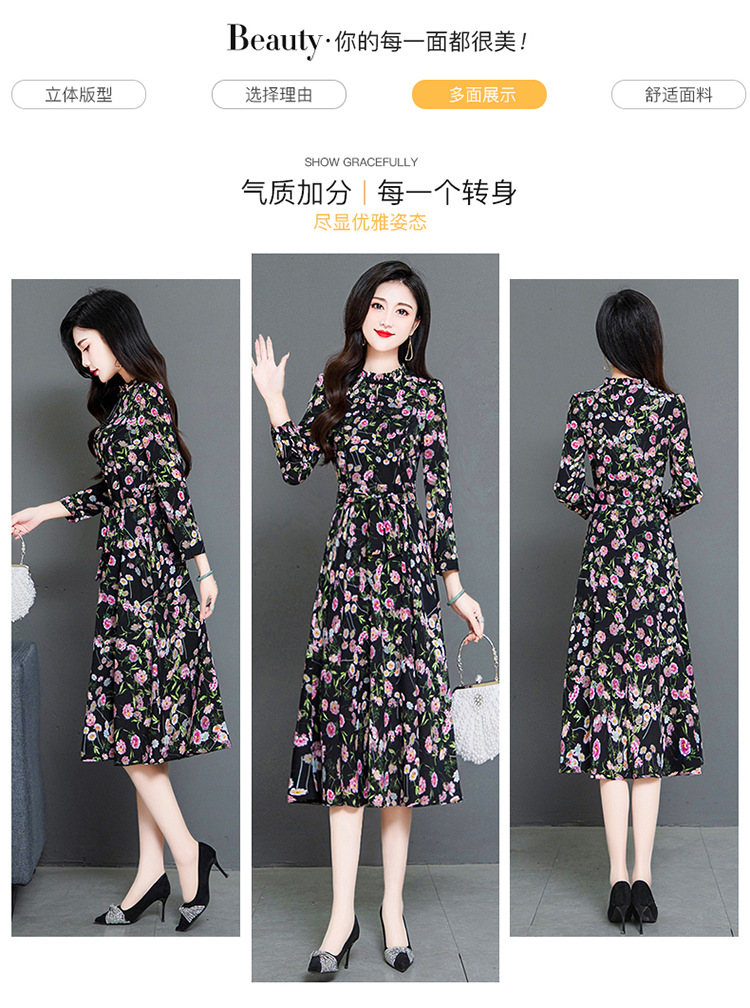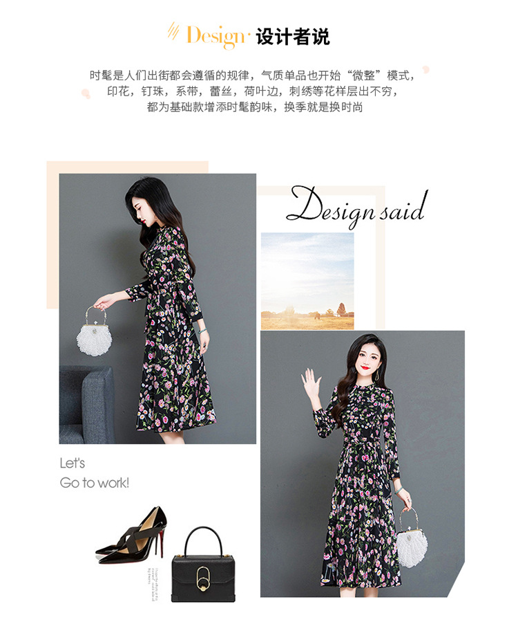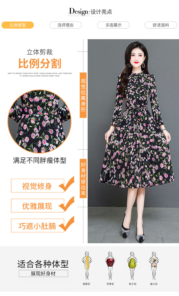 秋季新款,长袖裙时尚气质长袖中长款黑底粉花A字裙印花连衣裙QYM-TYH-231347-Y