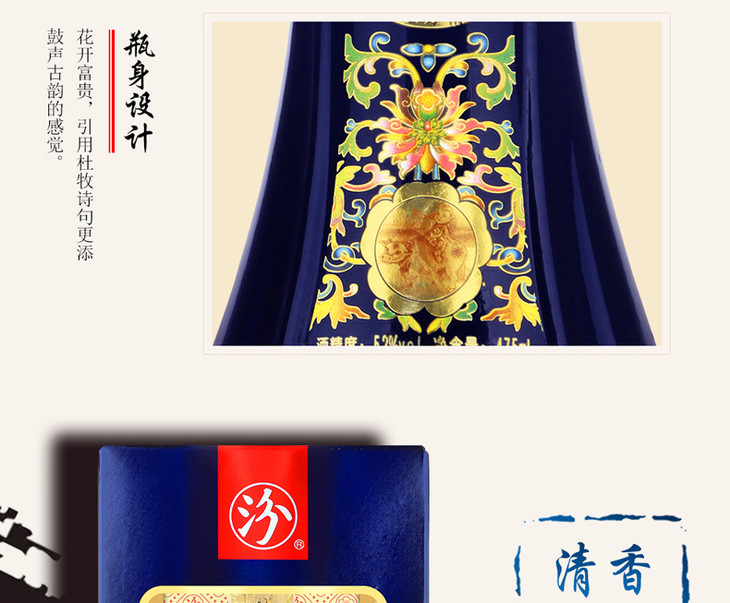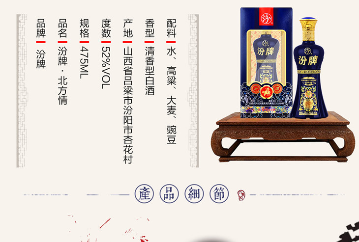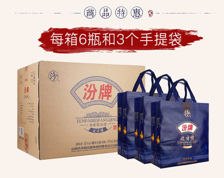 【推荐】【2017年】清仓 汾酒集团杏花村汾牌北方情 清香型特价白酒 52度酒水(箱内有手提袋3只) 475ml6瓶 整箱装 汾酒