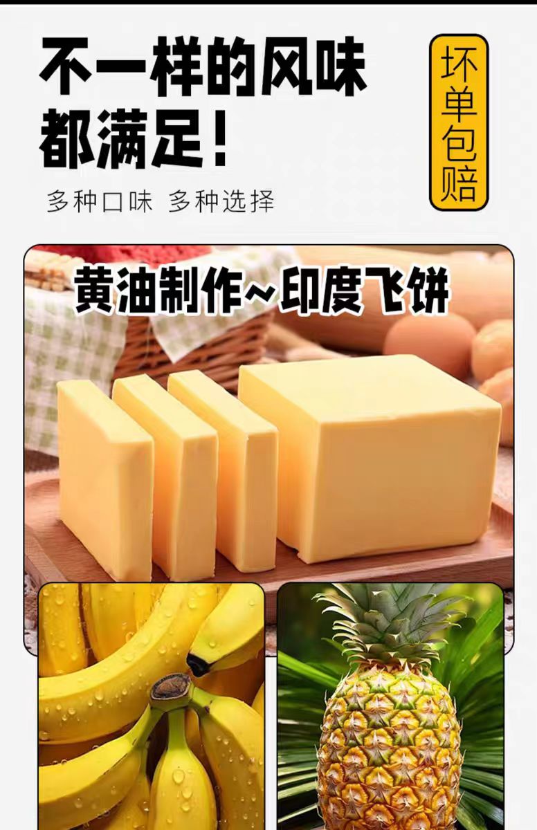 品名:黄油印度飞饼 规格1:菠萝味5片400g/袋*3袋 规格2:香蕉味5片400g/袋*3袋 规格3:5片400g/袋*2袋组合(菠萝味*2+香蕉味*1) 规格4:榴莲味5片400g/袋*3袋 规格5:5片400g/袋*3袋组合(菠萝味*2+香蕉味*2);拍几份发几个包裹,不一定能同时到达,请耐心等待 发货产地:湖北 保质期:冷冻12个月 包装方式:袋装 物流信息:默认中通冷链快递,不支持指定快递 发货区域:西藏、新疆、青海、宁夏、内蒙、阿坝、甘孜、凉山、海南、黑龙江、吉林、辽宁不发货; 物流详情:周六、周日及节假日除外,正常48小时内发货,到货时间约为2~5天,请耐心等待 售后说明:收到货后有质量问题,在24小时内都可以拍照(坏品+快递单面箱子一起拍)上传,申请按坏品比例理赔或联系客服,生鲜美食性质特殊,不支持7天无理由退换货;因地址错误,手机号联系不上,拒收等造成的损失无法售后,请理解; |