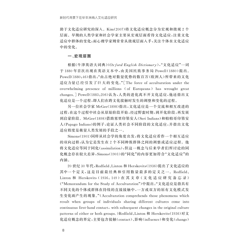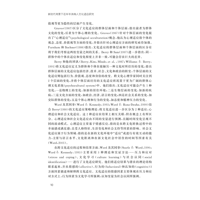 本书为“外国语言学及应用语言学”丛书之一。本研究以认知心理学的相关理论为基础,通过量化研究和质性研究相结合,从宏观和微观两个角度出发,探讨在华非洲商人的跨文化适应问题。本书主要包括在华非洲商人文化适应的背景和构成、在华非洲商人的内在心理适应、在华非洲商人的外部社会适应、在华非洲商人的传统文化适应、在华非洲商人的跨文化适应模型构建等等。本书既可为外籍商人的文化适应提供对策,也可为中国商人“走出去”提供参考。