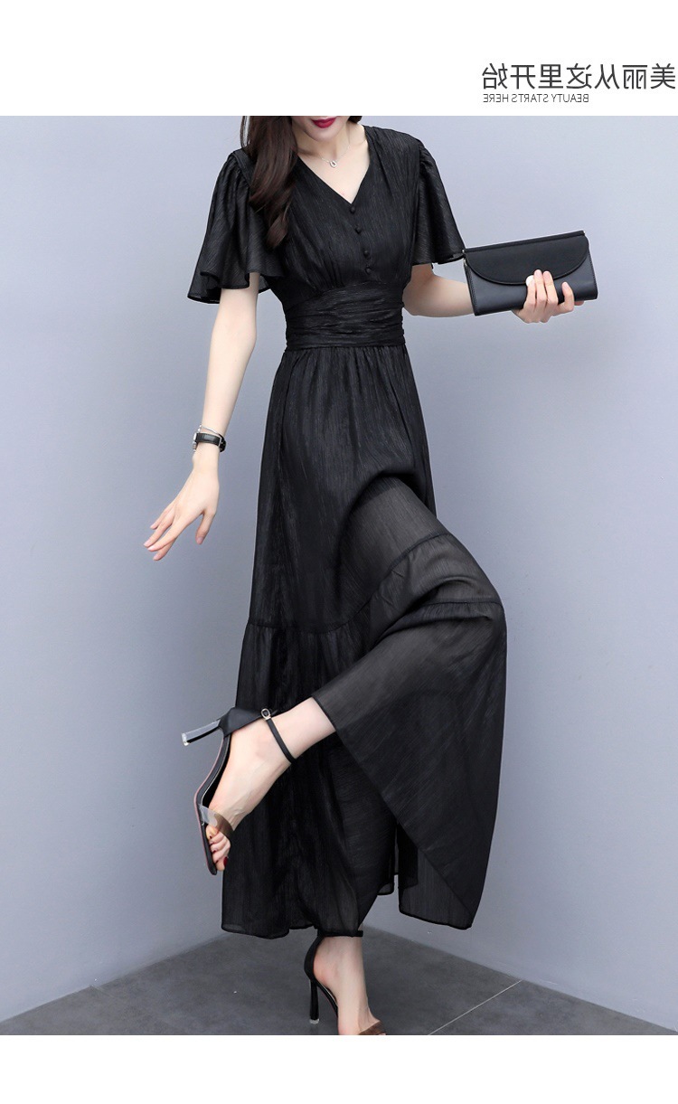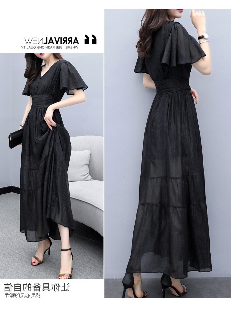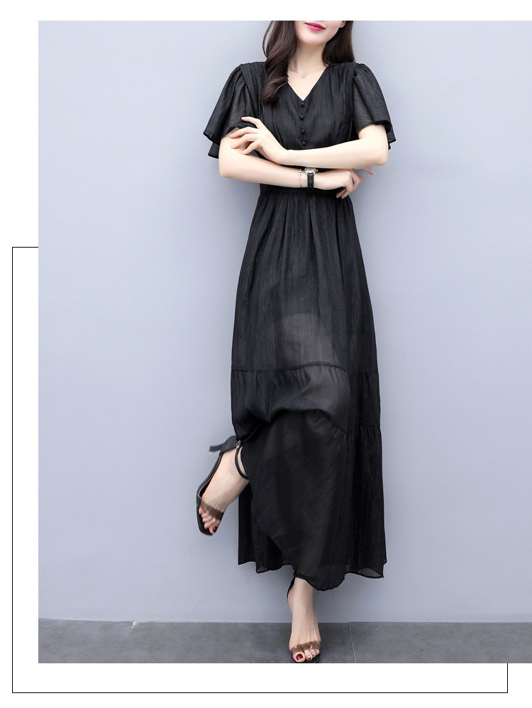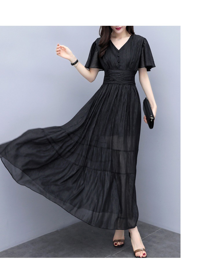 【年终亏本清仓】LDS-3159817夏季新款女装中长款v领收腰显瘦雪纺过膝长裙