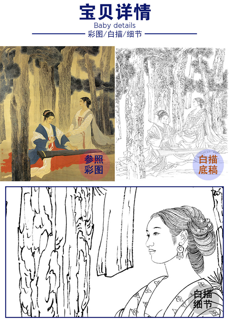 王美芳工笔传统仕女人物白描底稿《神曲》-斗方小品册页-多种白描尺寸可选-B132