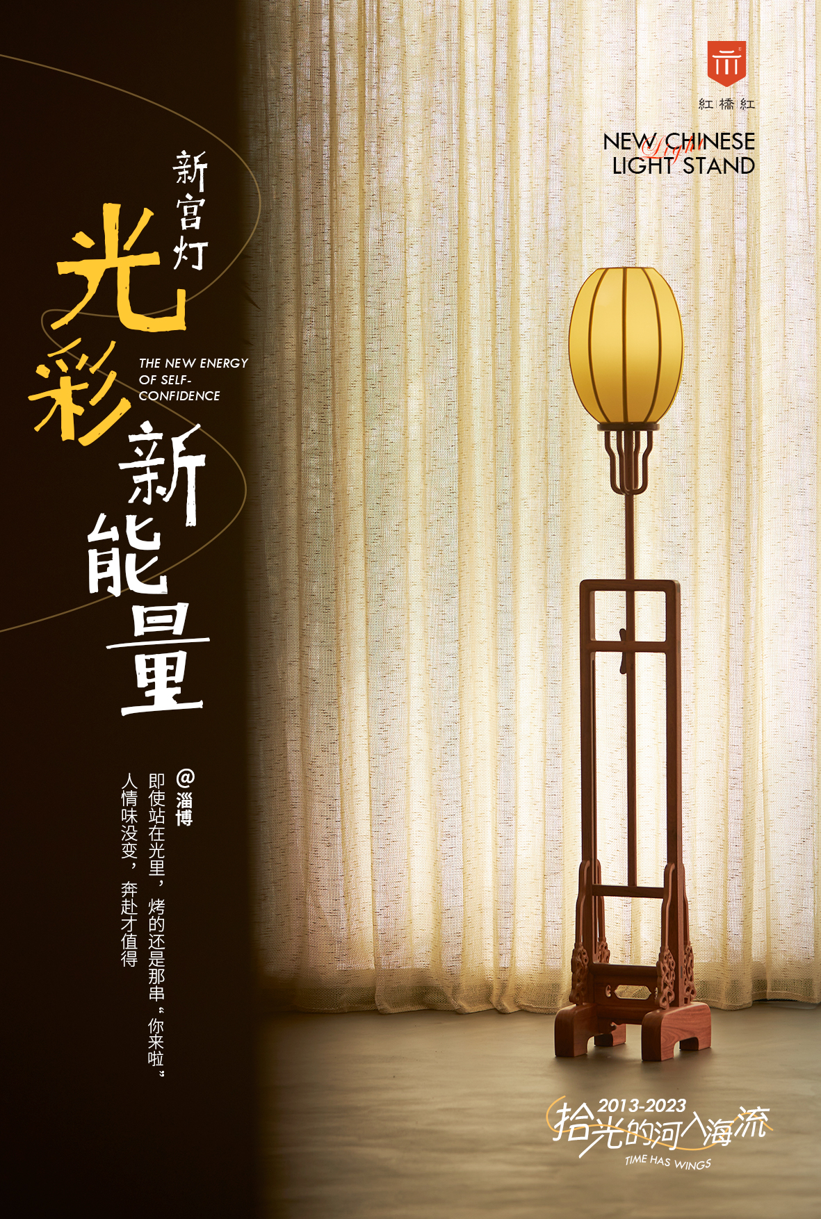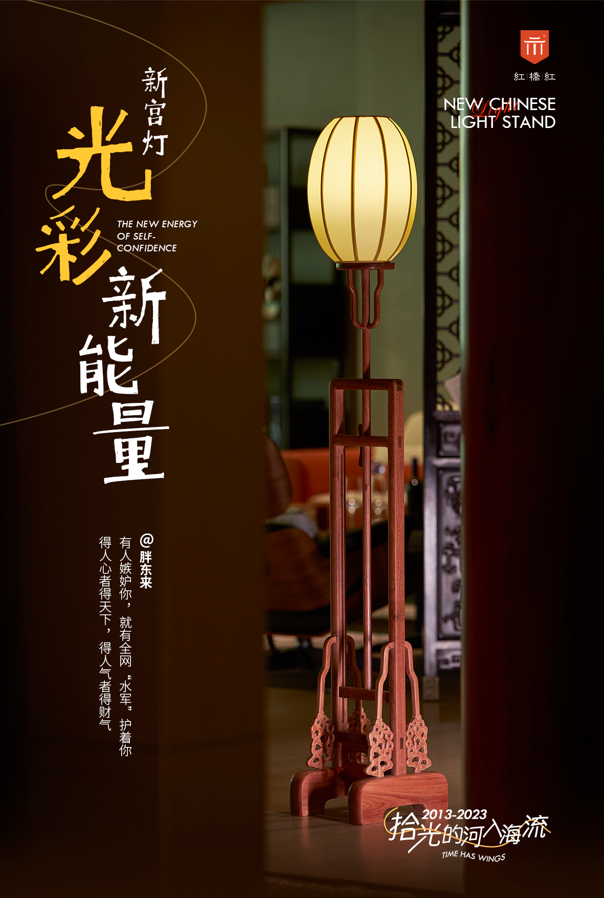 灯台底座用素墩木,质朴稳定;墩木上立柱两旁站牙,用灵芝蟠错成纹,设计绝妙,在传统家具纹饰形态中亦属少见。墩木间以横枨嵌夹透雕绦环板,颇似高束腰香几,所开之禹门洞形态。灯台赏面皆作素混,以手摩挲,可体验细磨功夫,转角处处倒圆。由灯罩、挂牙、灯杆、立柱、站牙,一路向下,比例协调,圆融至深。