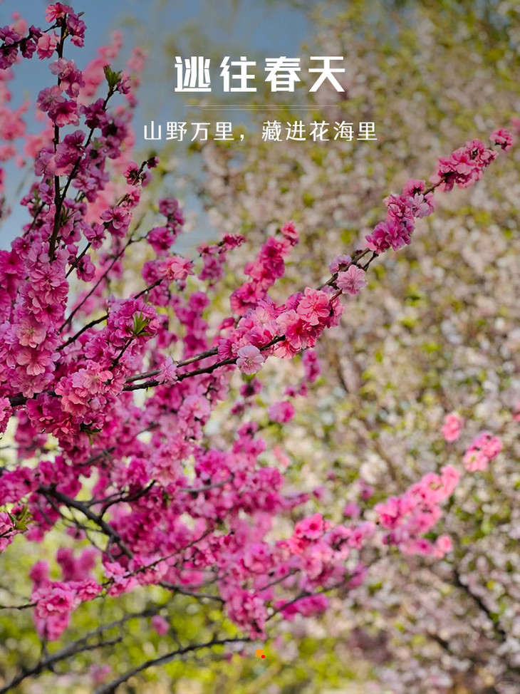 【万亩花海】内可看到油菜花海、郁金香园、粉色晚樱。海棠、梨花、桃花、杏花、月儿梅全开了,粉白交织,拍照停不下来。500多亩、80多个品种的郁金香像五彩缤纷像打翻了调色盘。沿步道深入花田,可乘坐观光小火车穿梭其间尽情欣赏无尽花色。