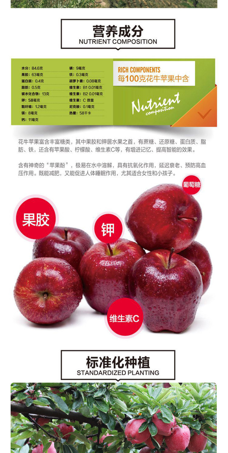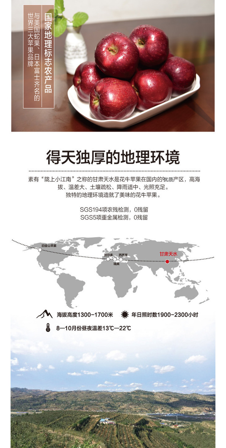品名:甘肃天水花牛苹果 规格1:3斤中果彩箱装(净重2.3斤+;果径约75mm;约5~6枚) 规格2:5斤中果彩箱装(净重4.5斤+;果径约75mm;约10~12枚) 规格3:5斤大果彩箱装(净重4.5斤+;果径约80mm;约6~9枚); 规格4:8斤特大果彩箱装(净重7斤+;果径约85mm;约12枚);拍几份发几个包裹,不一定能同时到达,请耐心等待 发货地/产地:甘肃天水 包装方式:网套+彩箱(以实际收货为准) 物流信息:默认顺丰发货,不支持指定快递 发货区域:新疆、西藏、云南不发;黑龙江、吉林、辽宁、贵州、上海、海南、内蒙、贵州+4元; 物流详情:周六、周日及节假日除外,正常48小时内发货,到货时间约为2~5天,请耐心等待 售后说明:收到货后有质量问题,在24小时内都可以拍照(坏果+快递单面箱子一起拍)上传,申请按坏果比例理赔或联系客服,生鲜性质特殊,因地址错误,手机号联系不上,拒收等造成的损失无法售后,请理解; |