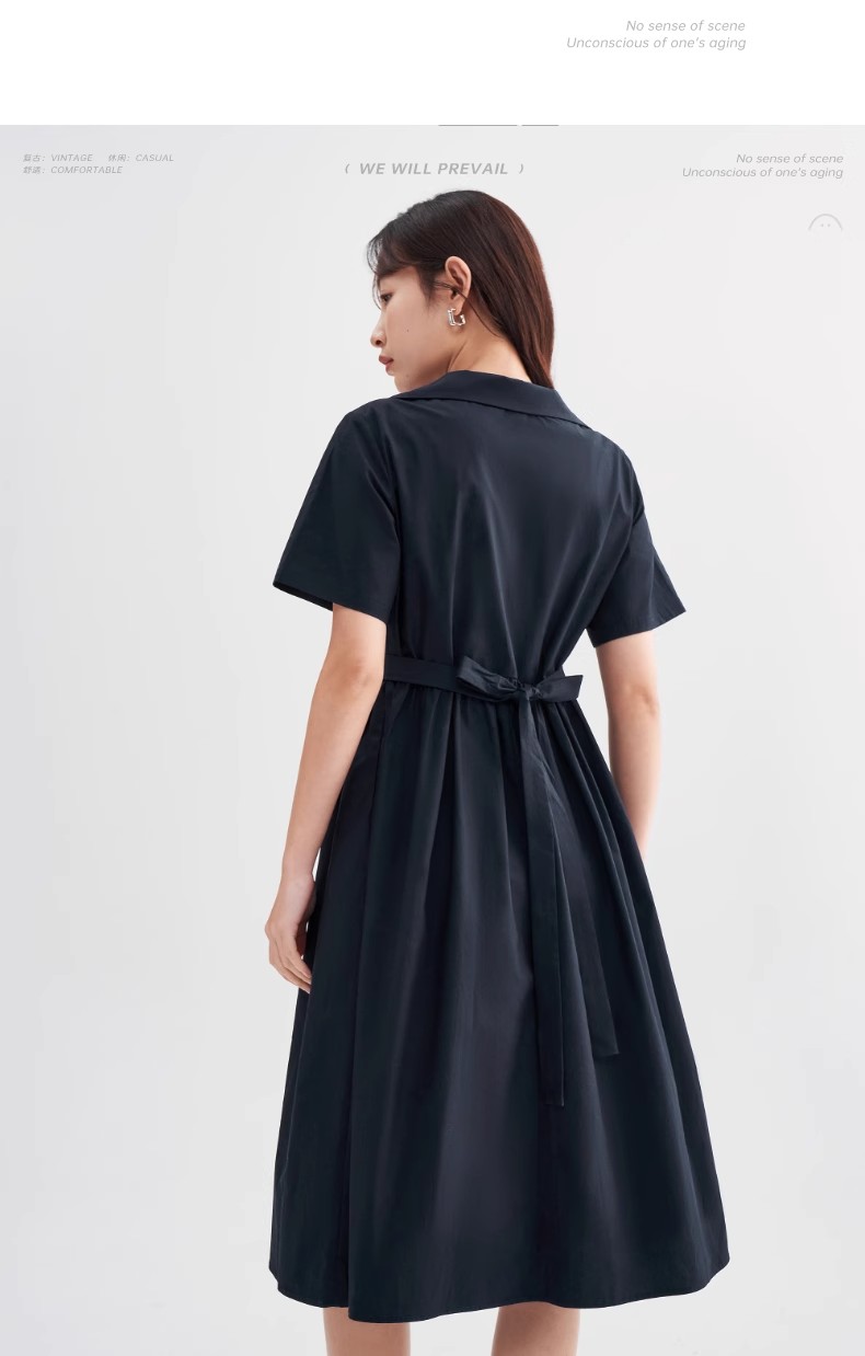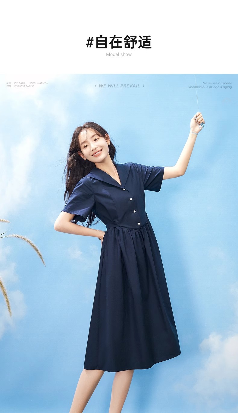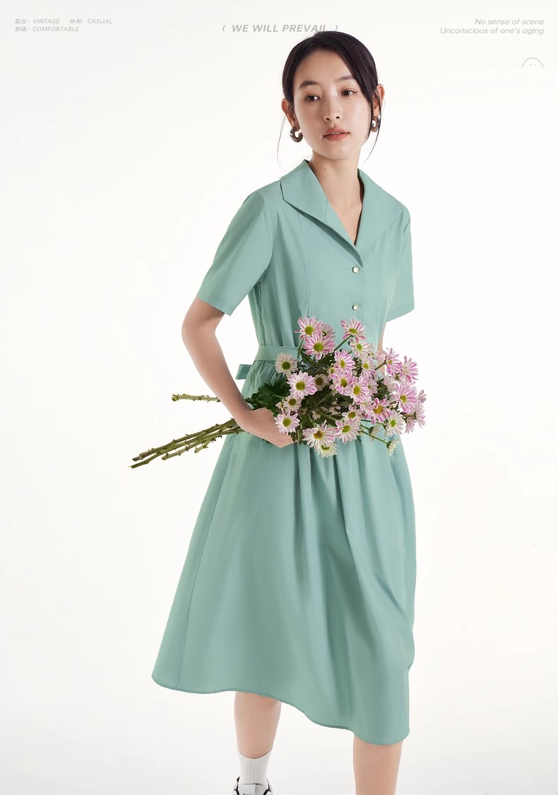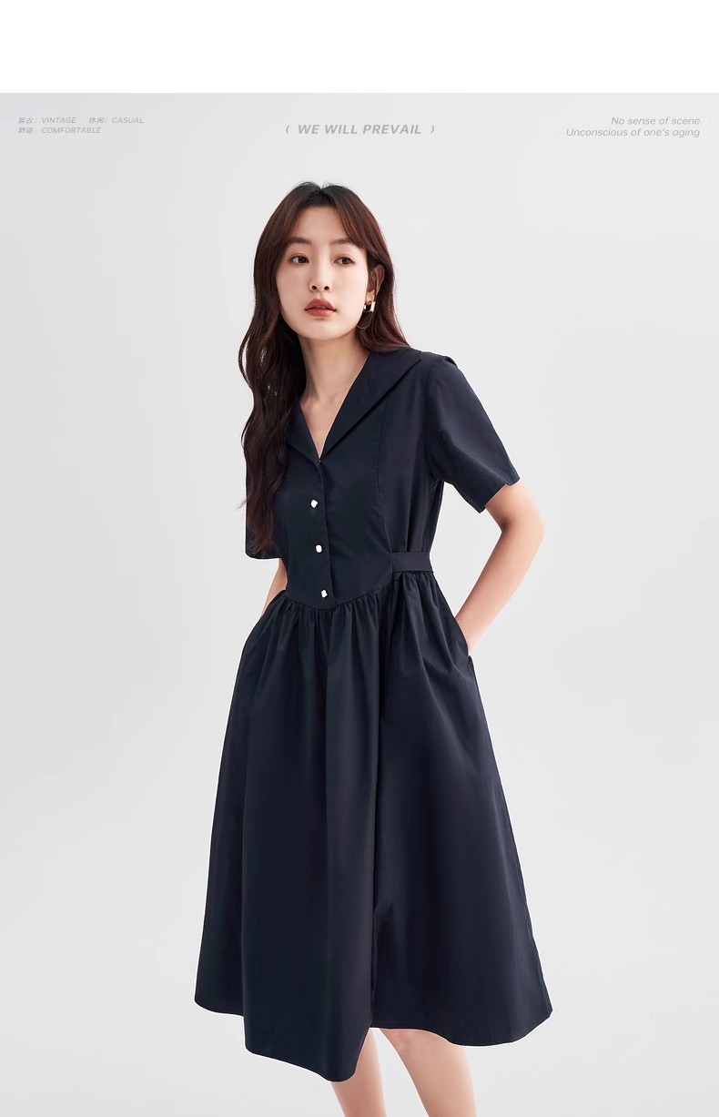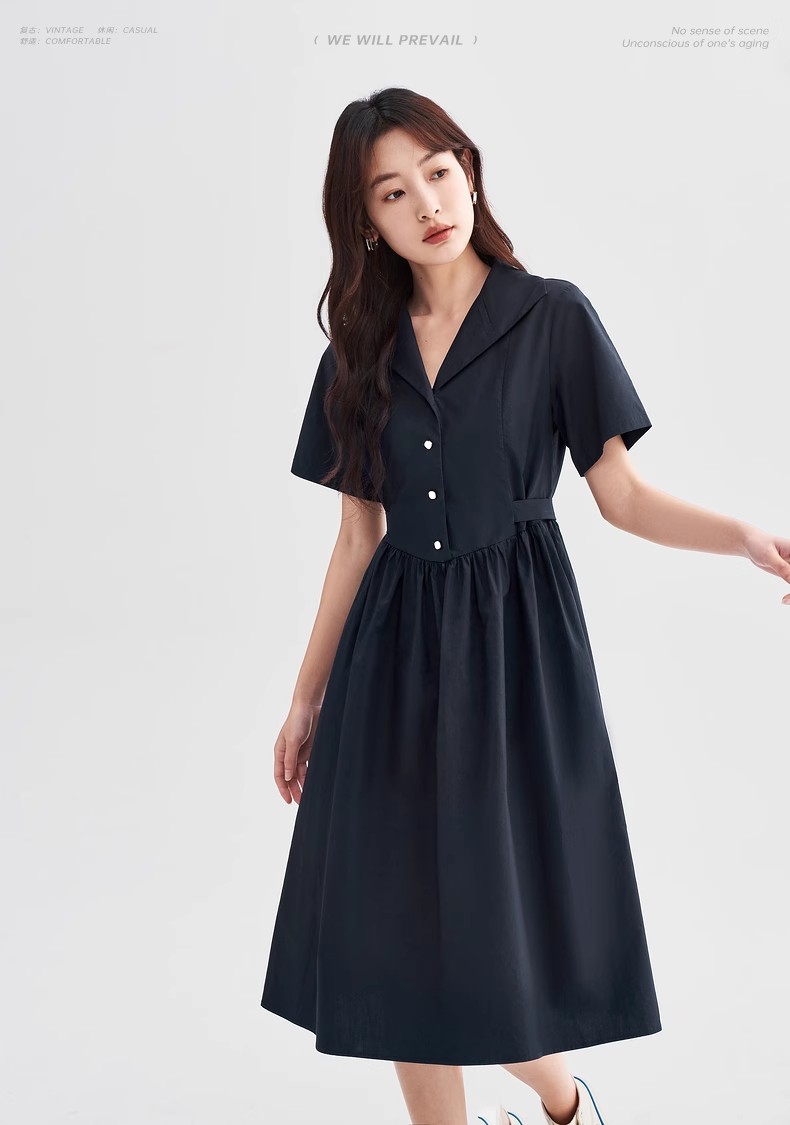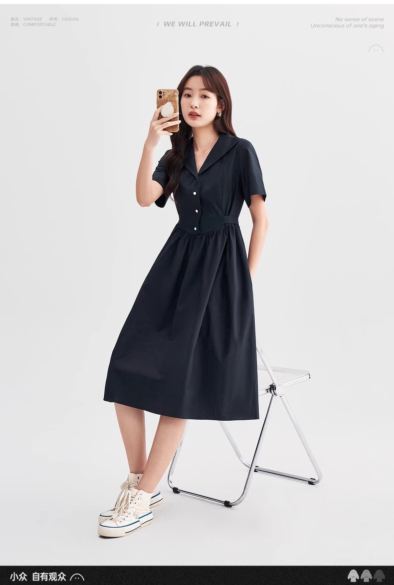 初语法式休闲气质连衣裙女2025夏季新款收腰显瘦通勤短袖衬衫长裙