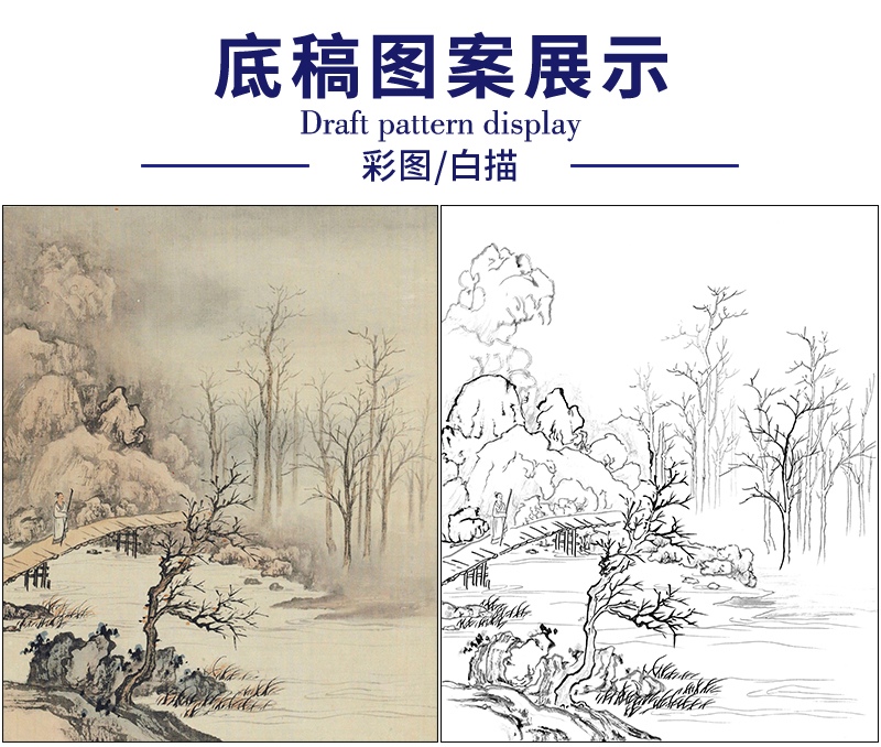 陈少梅山水人物工笔画白描底稿《山水书法册页》临摹勾线高清打印稿SM43