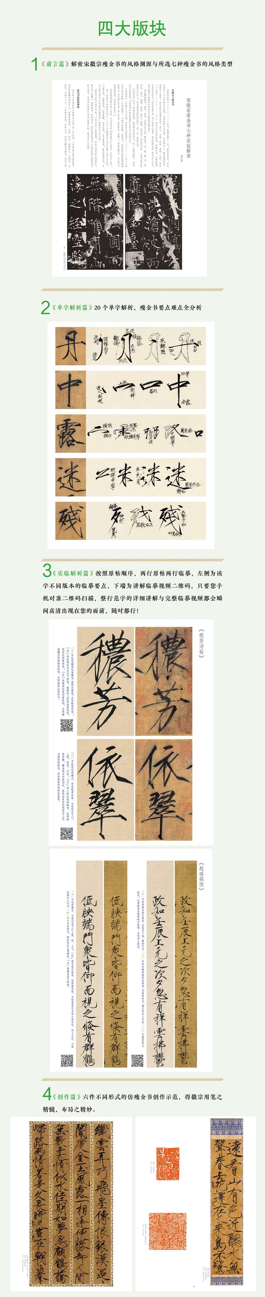 出版时间:2021-08 “瘦金书”作为一种书法风格,是宋徽宗赵佶创立,为厘清宋徽宗“瘦金”的书写脉络,特选取其早期《秾芳诗帖》,稍晚期的《怪石诗帖》和用笔更灵活,带有明显行书笔意,笔势圆转流畅的后期作品《题瑞鹤图》《题祥龙石图》《牡丹诗帖》,以及故宫博物院所藏并非徽宗的瘦金书《跋李白上阳台帖》《跋欧阳询张翰帖》加以实临与假想临摹,通过对比,更好的理解瘦金书的笔画和结构特征。同时每条列对重点字进行解析,并附每一条临摹的视频,识别二维码便可观看,以达到实物图书配合视频教学的目的。 鲁大东,1973年生于山东烟台,名齐,号启明、夷窠。1991年入浙江美术学院国画系书法篆刻专业。2002年起,入中国美术学院书法系,攻读书法方向硕士、博士,导师王冬龄、朱青生教授。现为中国书法家协会会员,中国美术学院现代书法研究中心研究员。