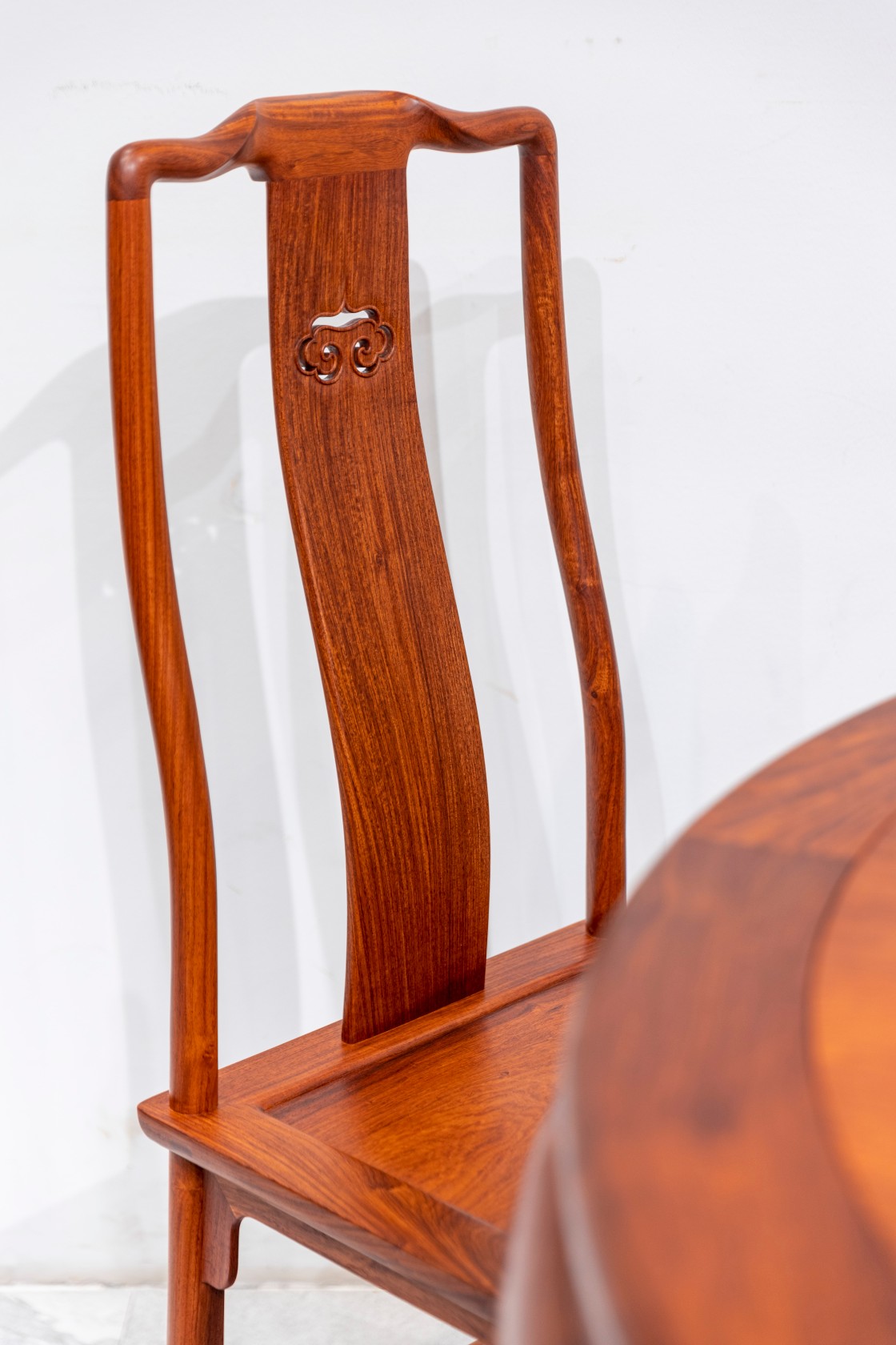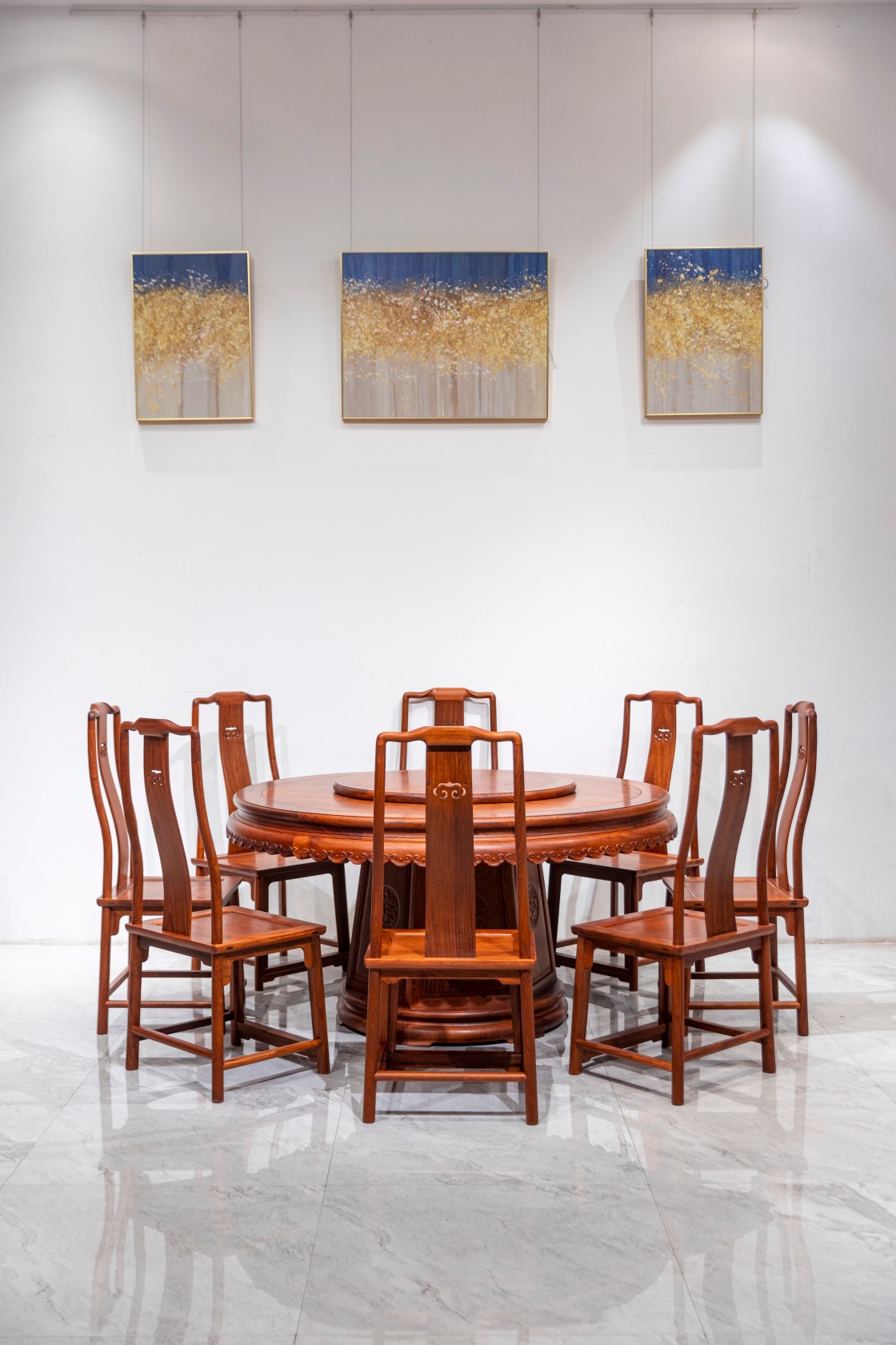 150 雕花牙边六角底座 圆餐桌:圆桌牙板铲地浮雕如意纹,象征家庭幸福吉祥,带束腰,面板下挂牙结构是非常受力的,家人围坐,团结情感,共享美味佳肴,其乐融融。底座采用传统步步高升的做法,十分稳固。