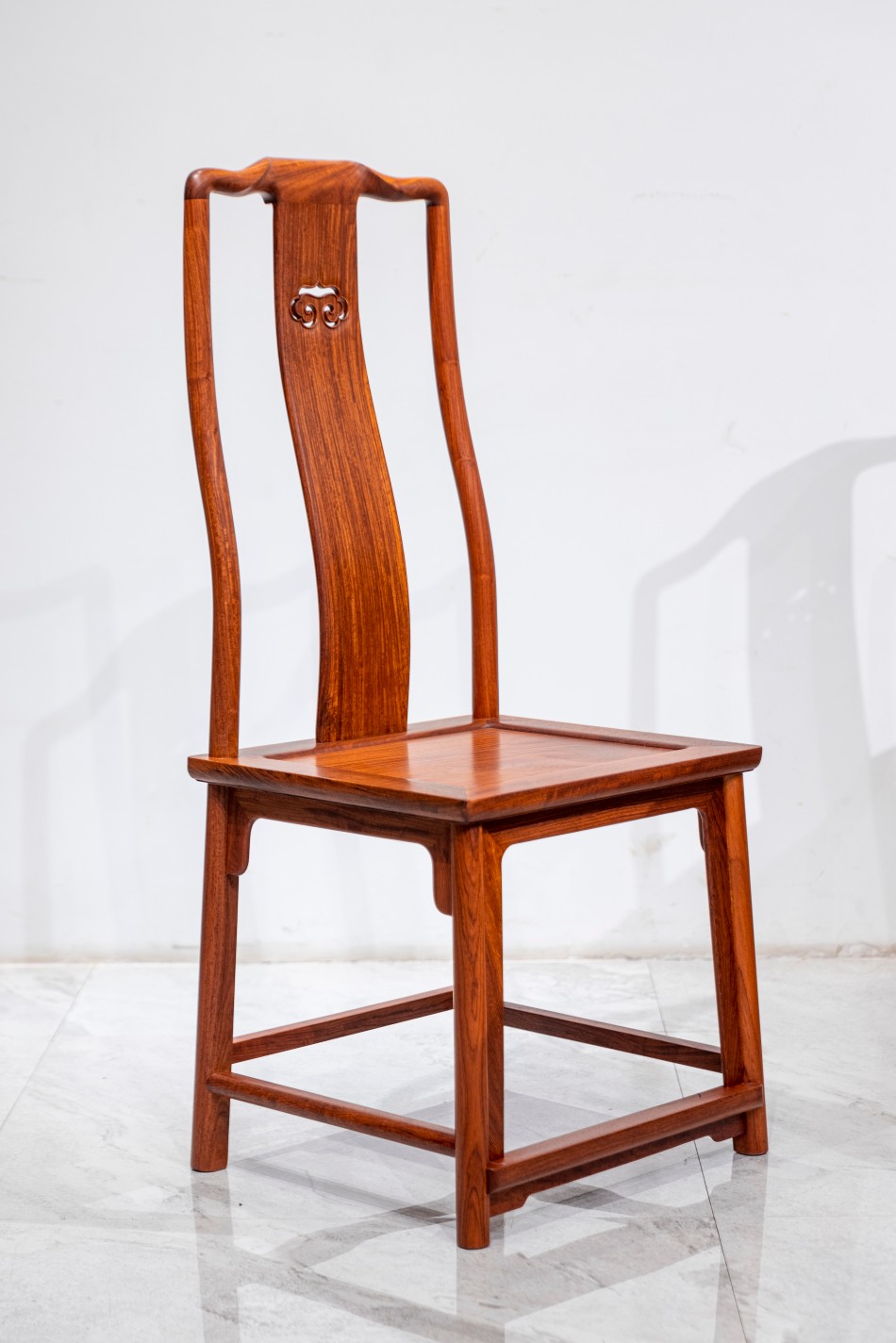 如意S背 不出头 灯挂椅:此款灯挂椅形制高挑,搭脑弯弧有劲,中部削成枕形,靠背板呈“S”状,上部雕如意云纹开光,椅盘格角攒边,攒边打槽镶独板芯,抹头见明榫,素牙子,椅面腿足间相连,管脚枨采用“步步高”手法,全身光素,整体予人清秀雅致的观感。
