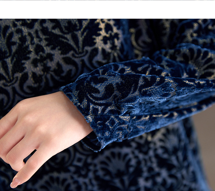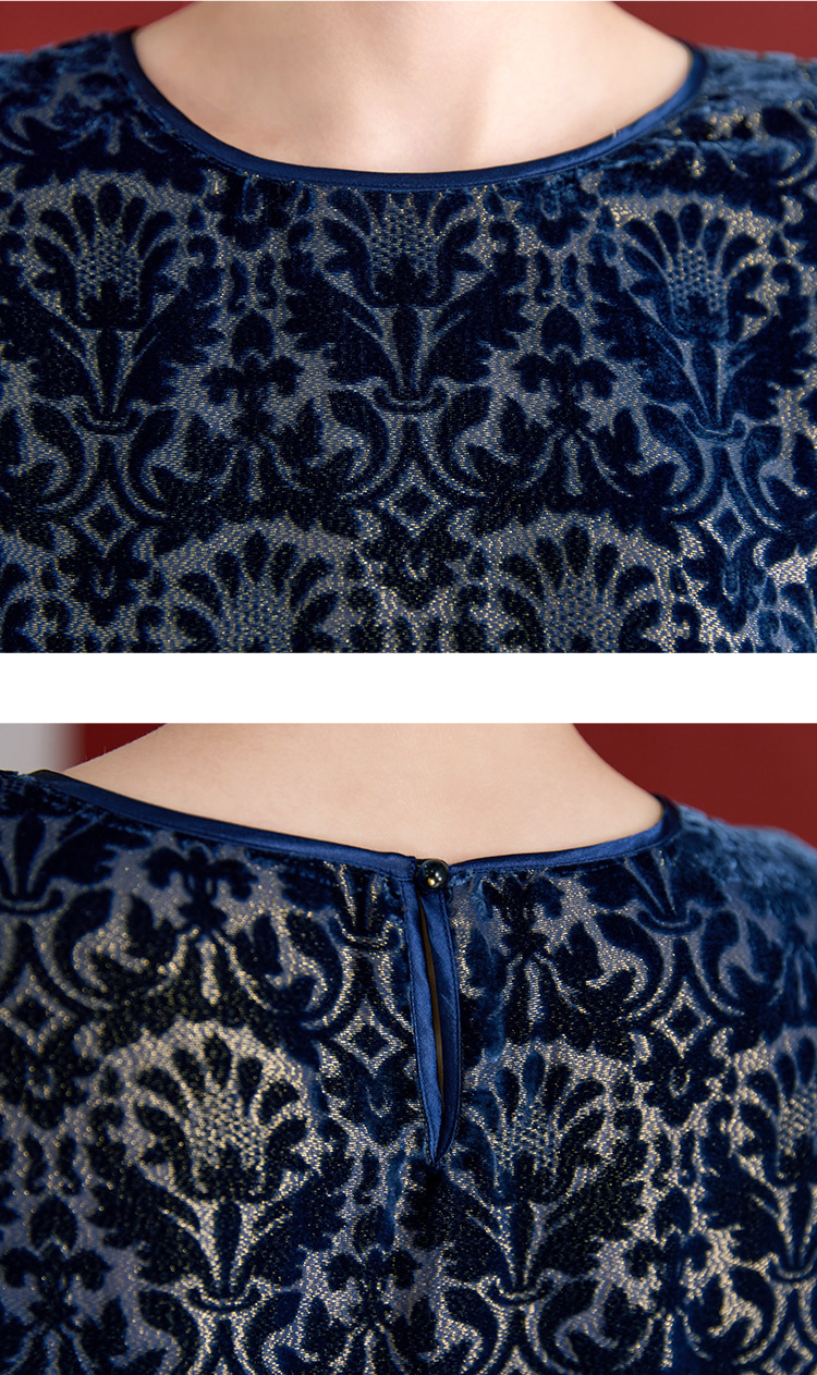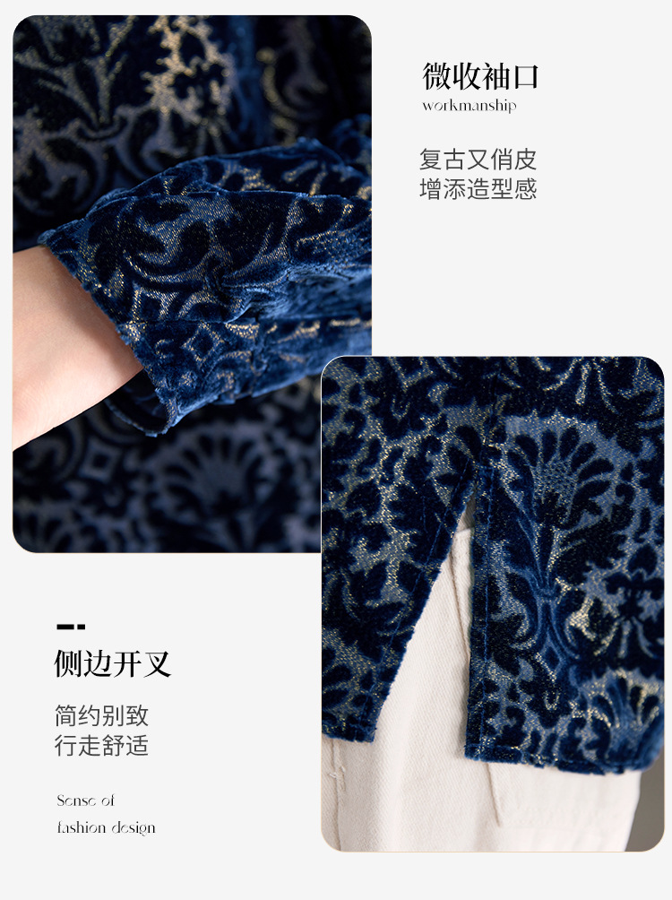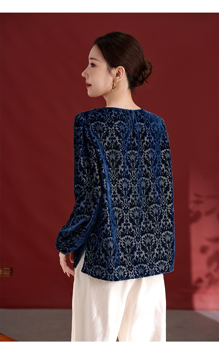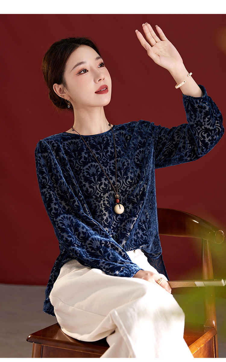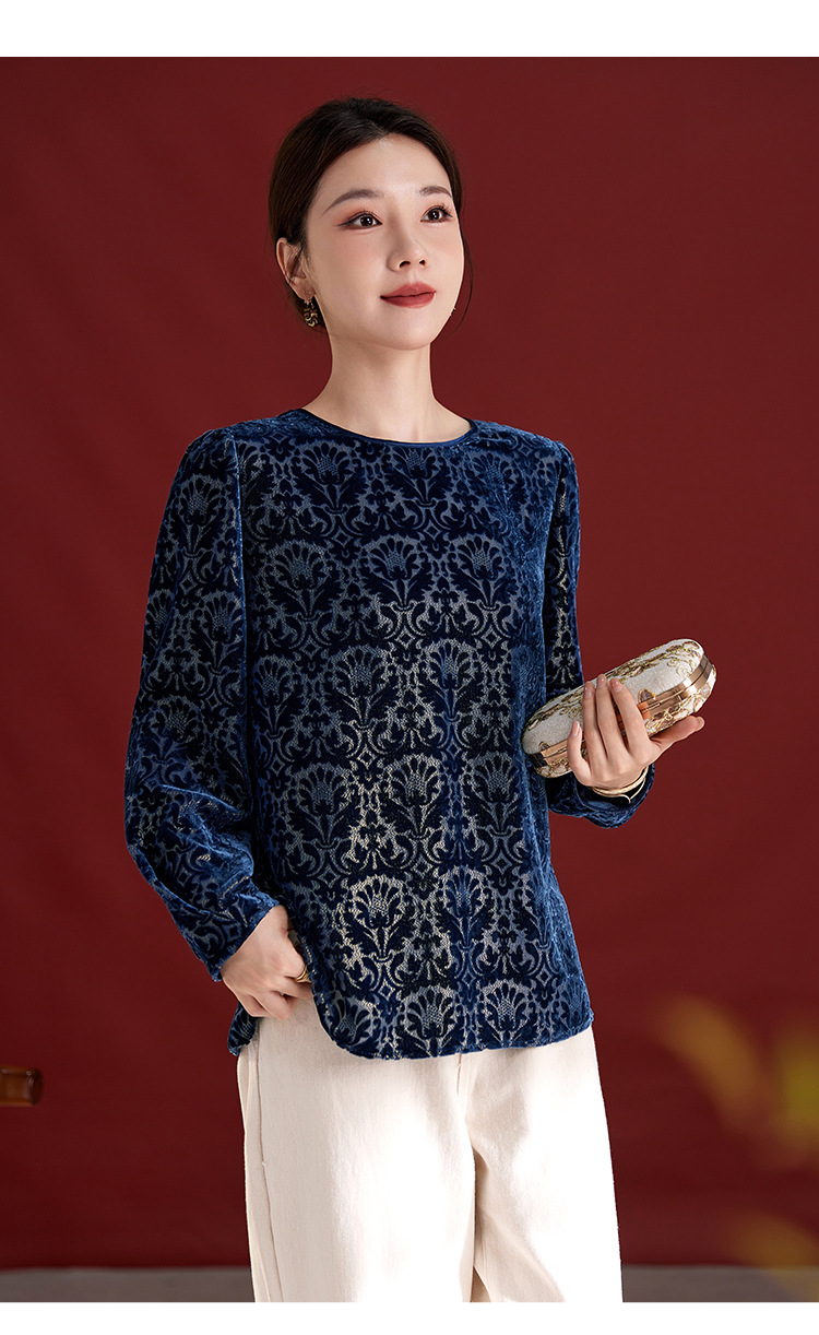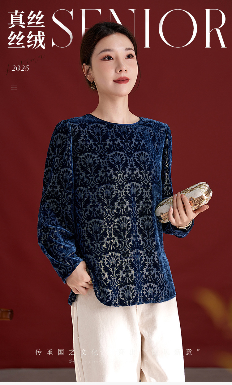 QS2025年真丝丝绒烧花圆领长袖小衫上衣宽松休闲时尚洋气百搭款1853