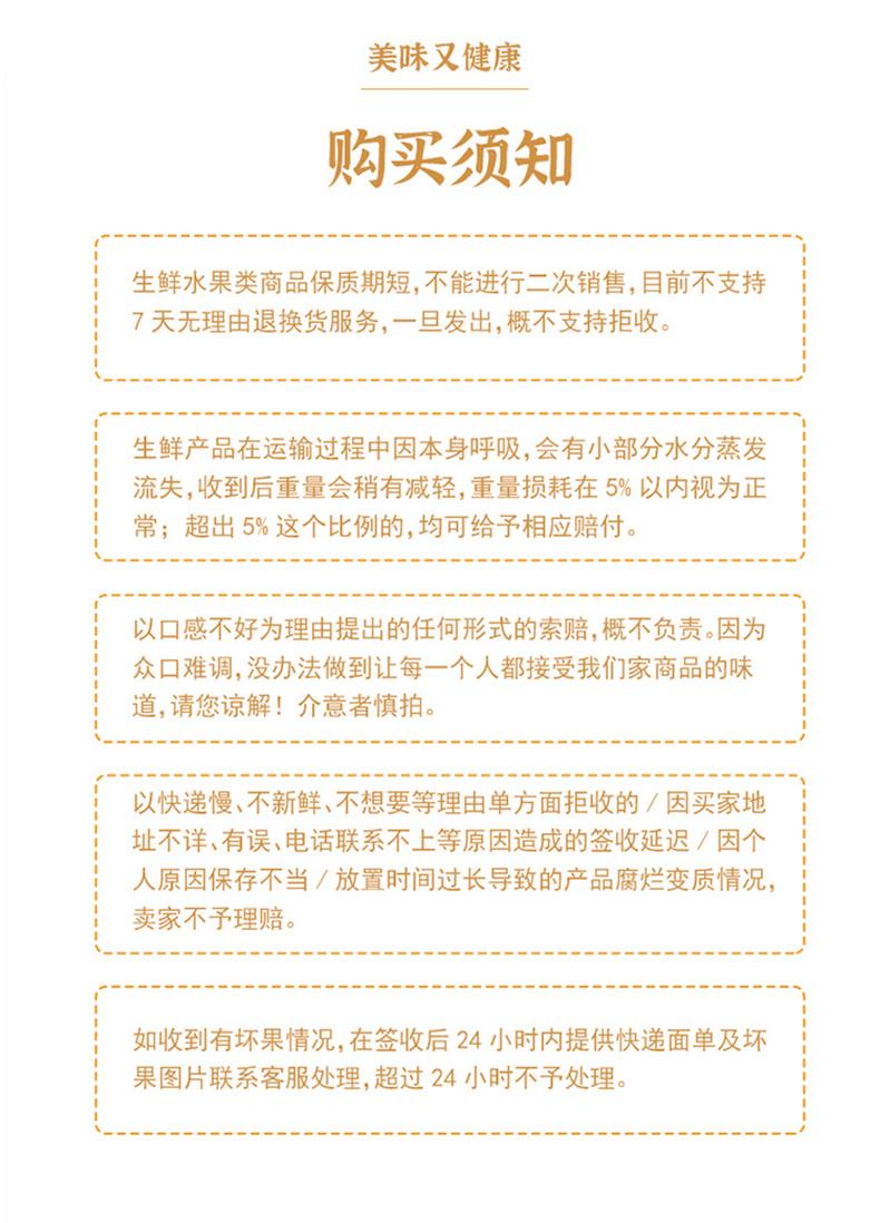 特别说明:由于生鲜水果市场价格波动较大,价保时间为:付款成功之后72小时之内联系客服有效,以付款成功的时间为准。