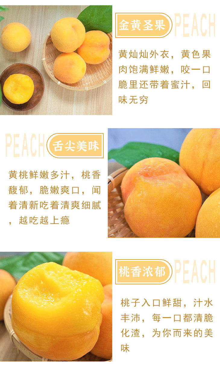 1.黄桃属于硬软两吃的桃子,发货时为7-8成熟的桃子,喜欢吃软桃可放置1-2天再食用