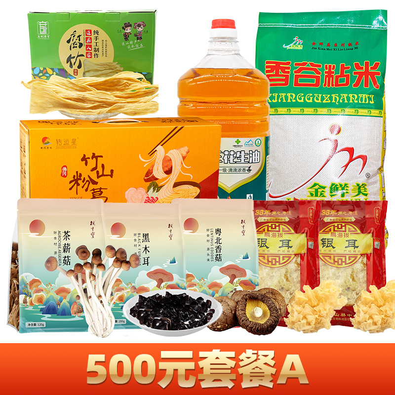 【500元套餐A】竹山粉葛面1.6kg香谷粘15kg粤众佳源花生油5L连山黄豆腐竹礼盒装500g林中宝粤北香菇国风版180g林中宝黑木耳国风200g林中宝茶薪菇国风120g林中宝银耳100g*2包