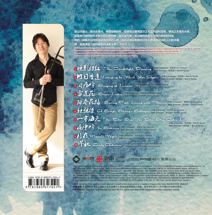 这张CD更是独一无二的:因为它是这位浪漫二胡创始人、持多项NewAge及二胡音乐世界纪录大师的首张中国版权音乐大碟!他的二胡音乐不仅依旧感动着传统的人群,而且还感动着无数过去不曾被感动过的人们。