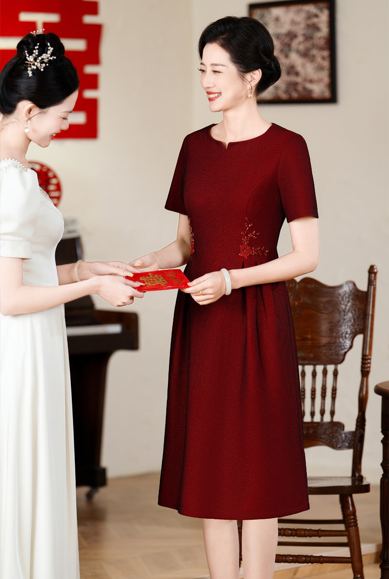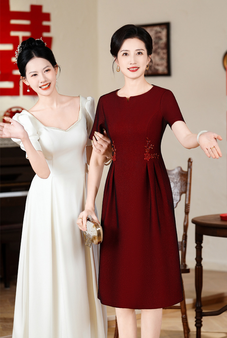 TQ8857 2025春新款妈妈装 腰部压褶钉珠酒红喜婆婆婚庆婚宴礼服 商品图1