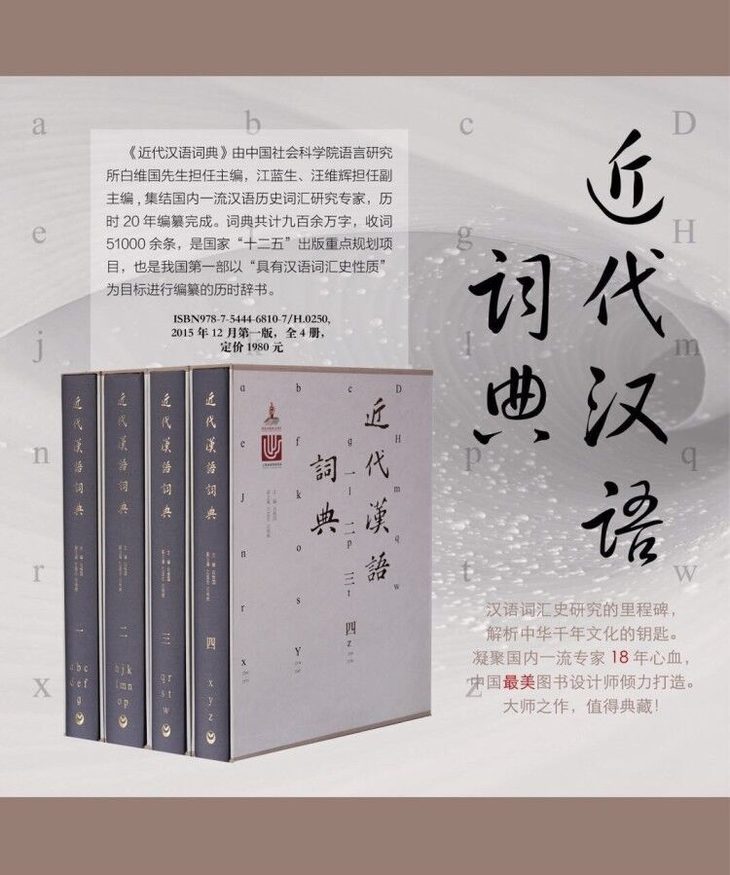 《近代汉语词典》由中国社会科学院语言研究所白维国先生担任主编,国内十余位一流的汉语历史词汇研究专家通力合作,历时18年编纂完成。词典共计九百余万字,收词51000余条,是我国第一部以“具有汉语词汇史性质”为目标进行编纂的历时辞书。该书的“近代”指的是从初唐到19世纪中叶一千多年的历史时期。对于这段时期语言的系统整理,将有助于勾勒整个汉语的演变轨迹,并解密众多隐藏在语言中的文化信息。